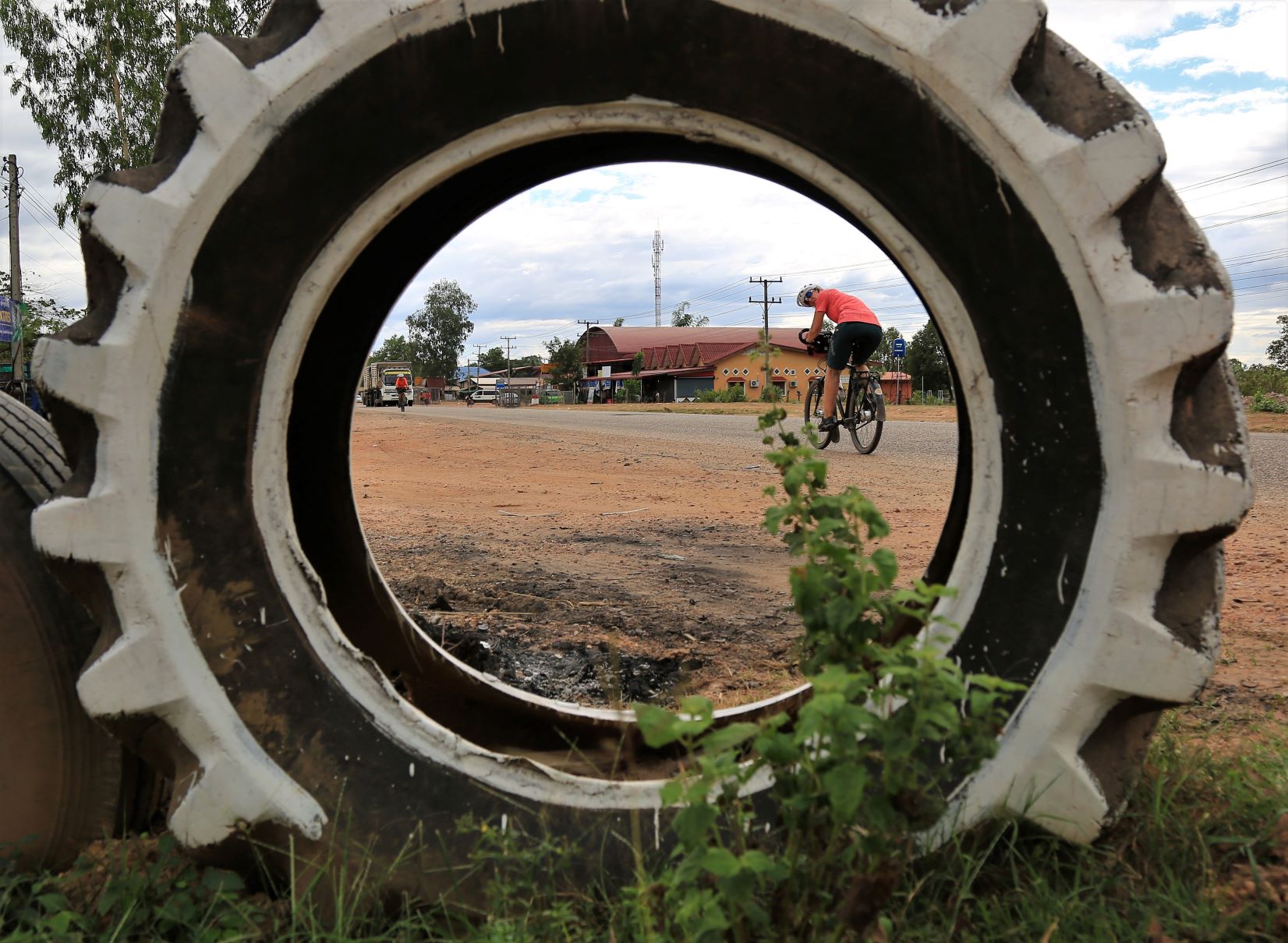 Woody, ein kleiner zäher mitfünfziger Thai, und unser lokaler Guide in Thailand arbeitet wie ein Uhrwerk. 23 Kilometer in der Stunde, egal ab bergauf oder bergab, schneidet den Gegenwind wie ein Messer und kennt die Gegend wie seine Westentasche. Der Typ ist tiefenentspannt, und ein Geschenk. Die Begegnungen am Wegesrand sind es ebenso …
