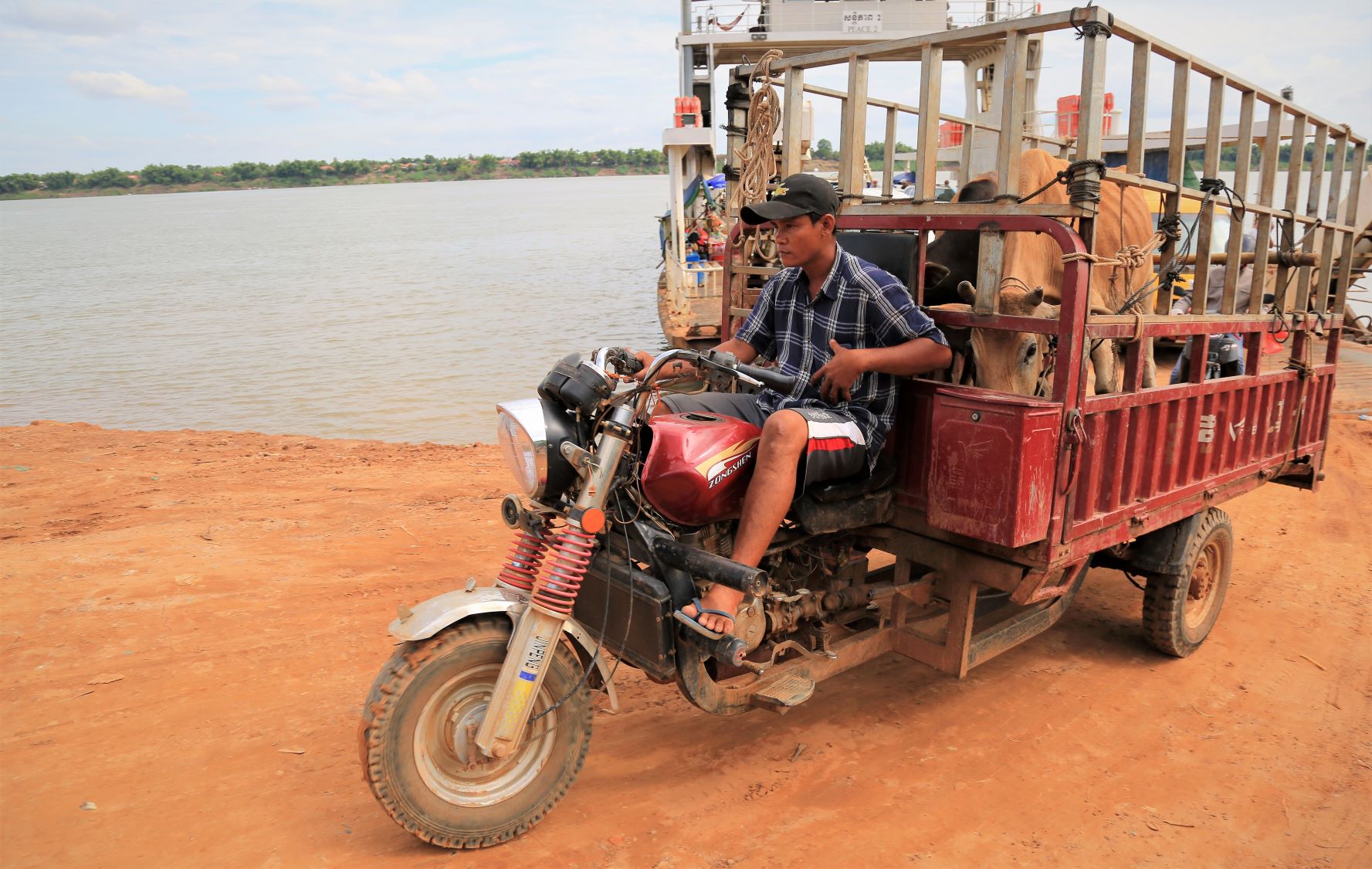 Wir radeln durch Reis- und Maisfelder, Mango- und Bananenplantagen und einem scheinbar endlosen Straßendorf. In Stung Trong überqueren wir mit einer Fähre letztmalig den Mekong., besuchen noch die Pagode Han Chey und lassen uns nach Kampong Chan unserem Tagesziel, mit 150.000 Einwohner die drittgrößte Stadt Kambotschas, ausrollen.