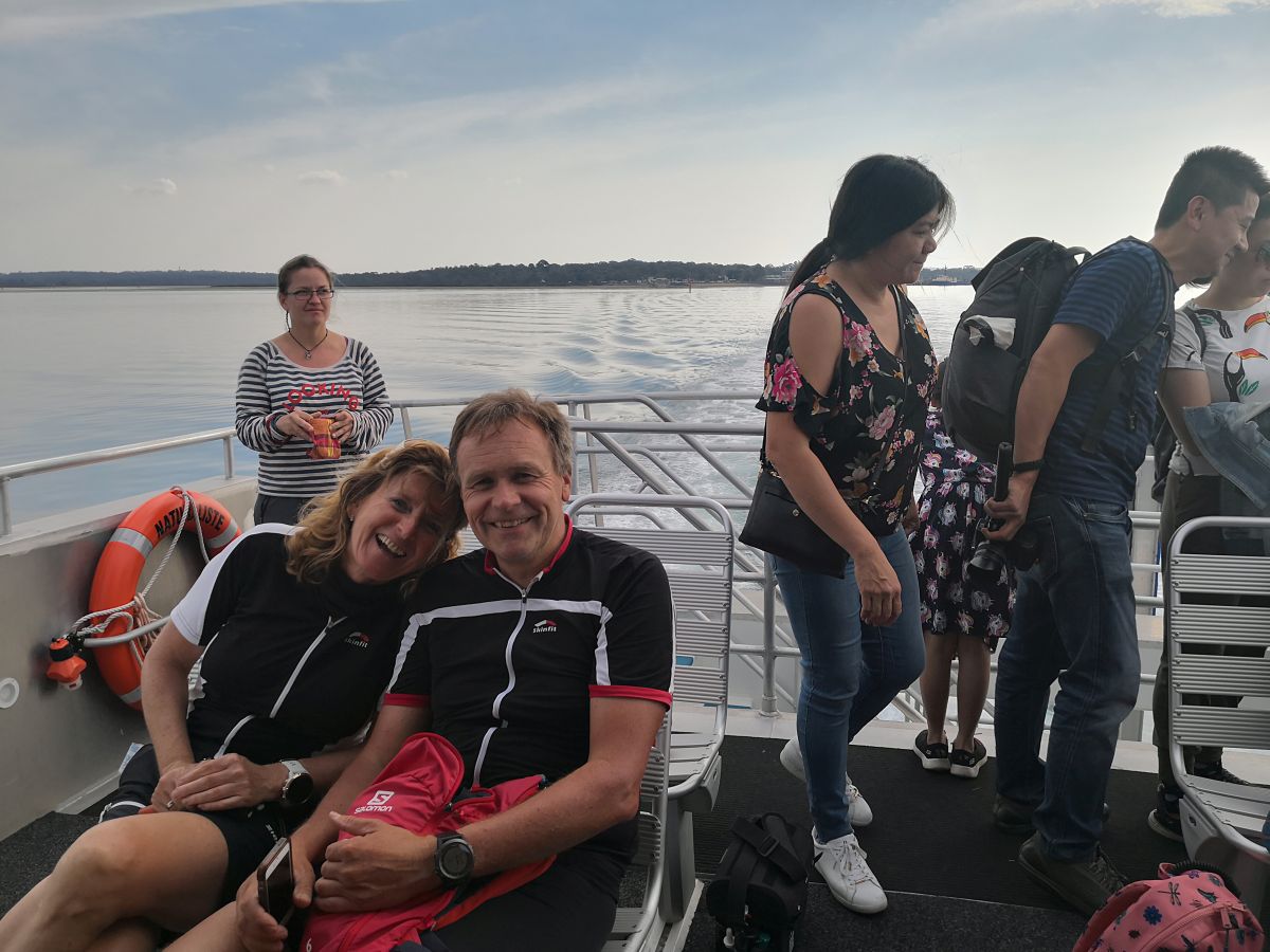 Ich hole das Begleitfahrzeug zurück, Michael bereitet sich auf das Aufladen vor. Der Rest ist etwas vorausgefahren, ich schließe mit Rückwind wieder auf. Um 14:20 Uhr sind wir am Anleger. Um 14:35 Uhr fahren wir dann entspannt nach Phillip Island, leider ohne Begleitfahrzeug und Lee. Die Fähre ist ein kleines Boot, das nur Personen und Räder mitnimmt. Hatte uns unser alter Partner auch nicht mitgeteilt und wieder einmal sind wir froh, dass wir den Partner kurz vor der Reise gewechselt haben – notgedrungen zwar, aber, wie sich immer mehr zeigt, zum allgemeinen Vorteil!