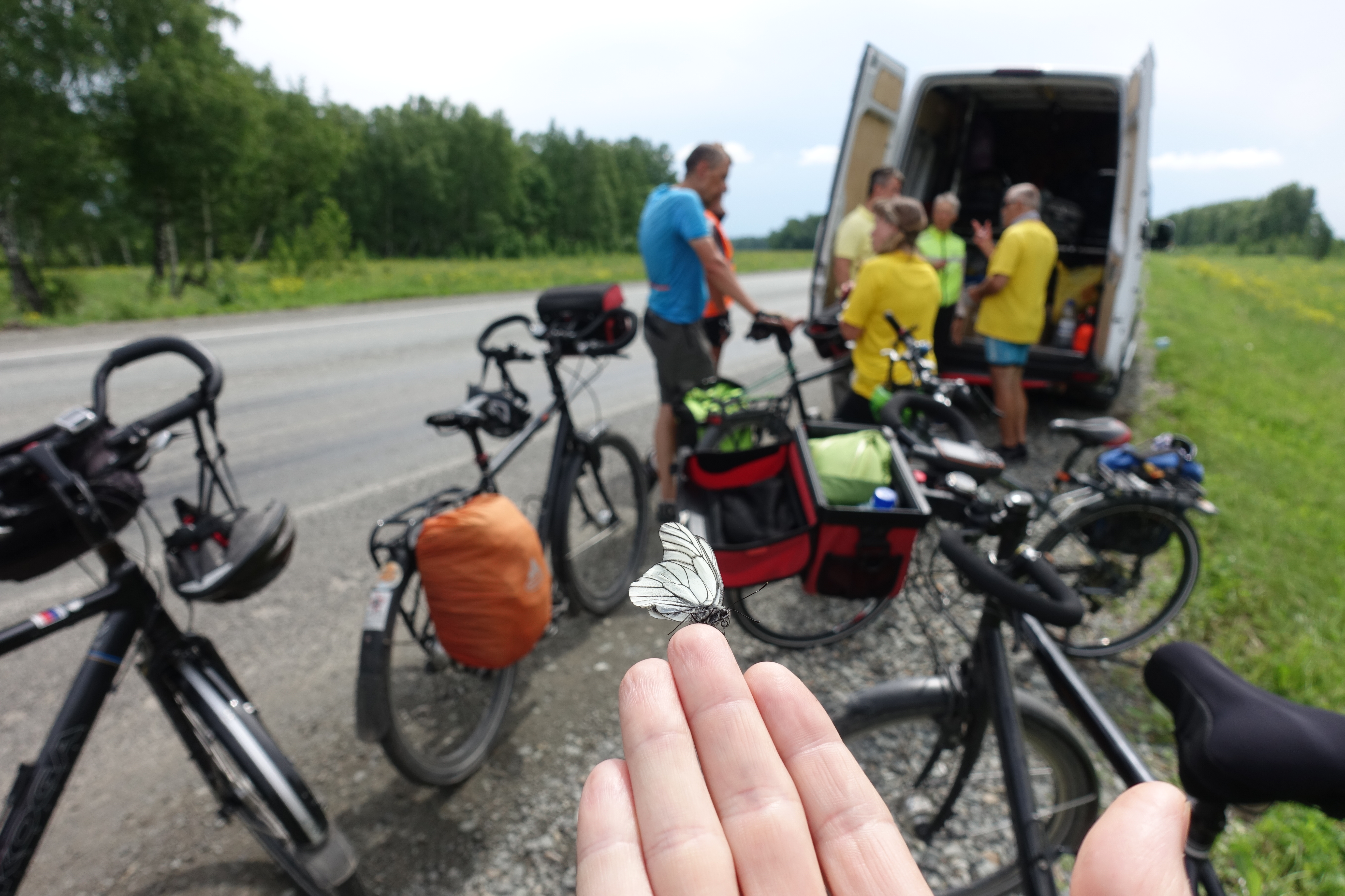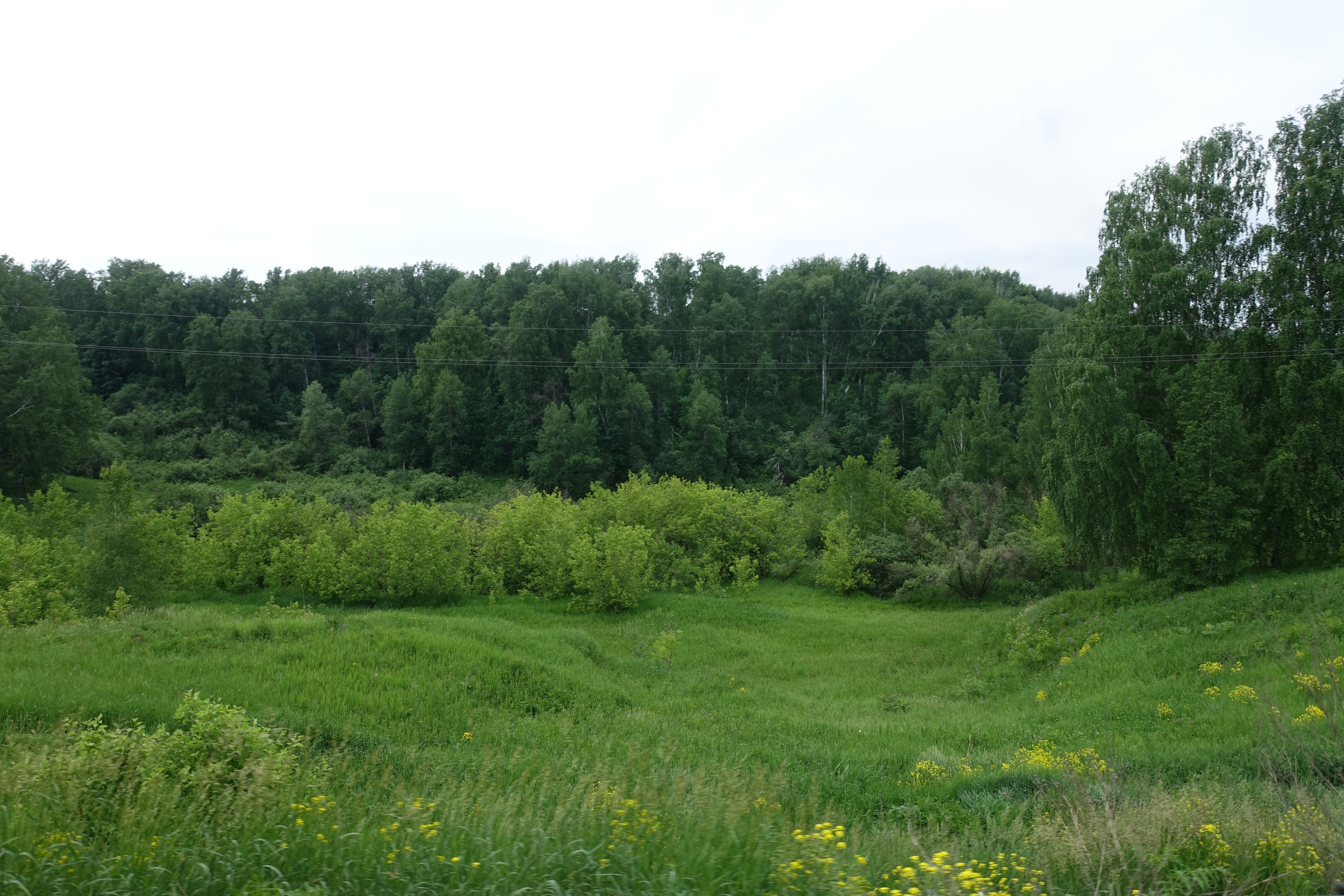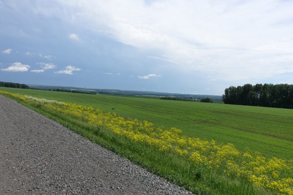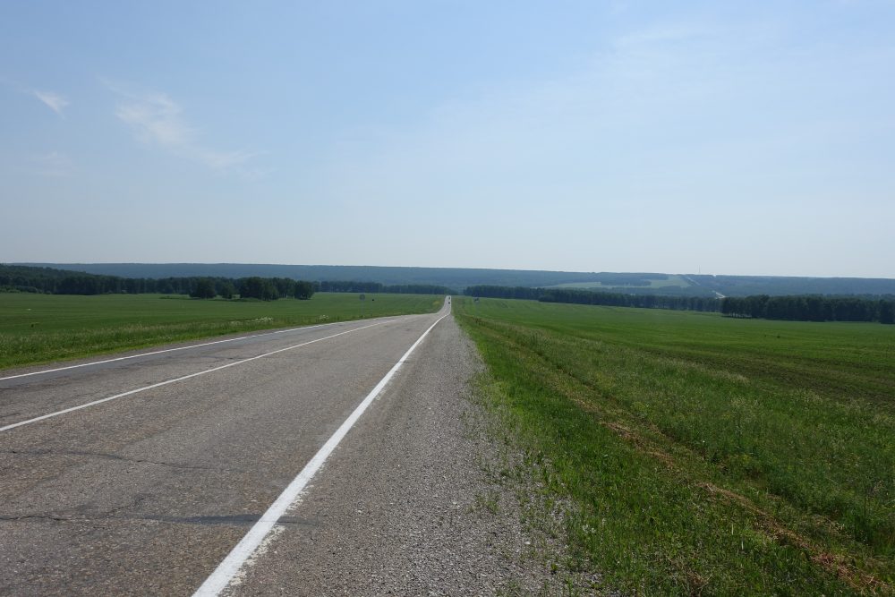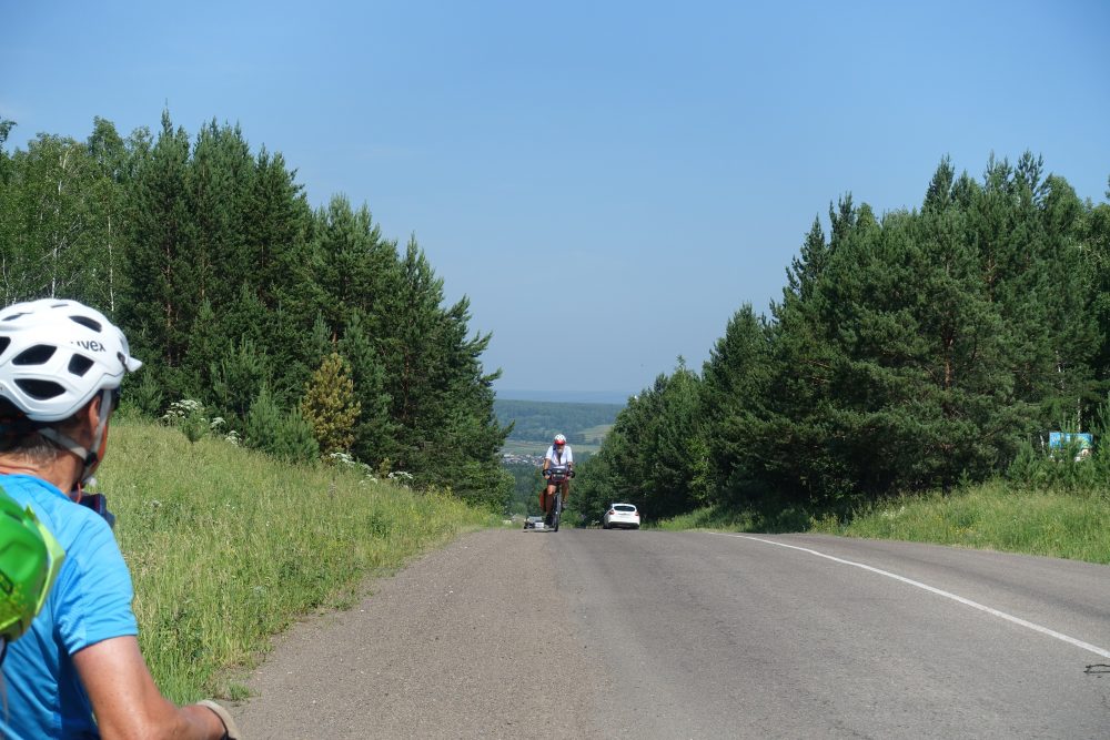 Es ging durch eine hübsche Hügellandschaft nicht ohne ein Paar verdammte Aufstiege, wo du völlig verschwitzt oben ankommst. Aber dann ging’s endlich runter ins Jenisejtal!