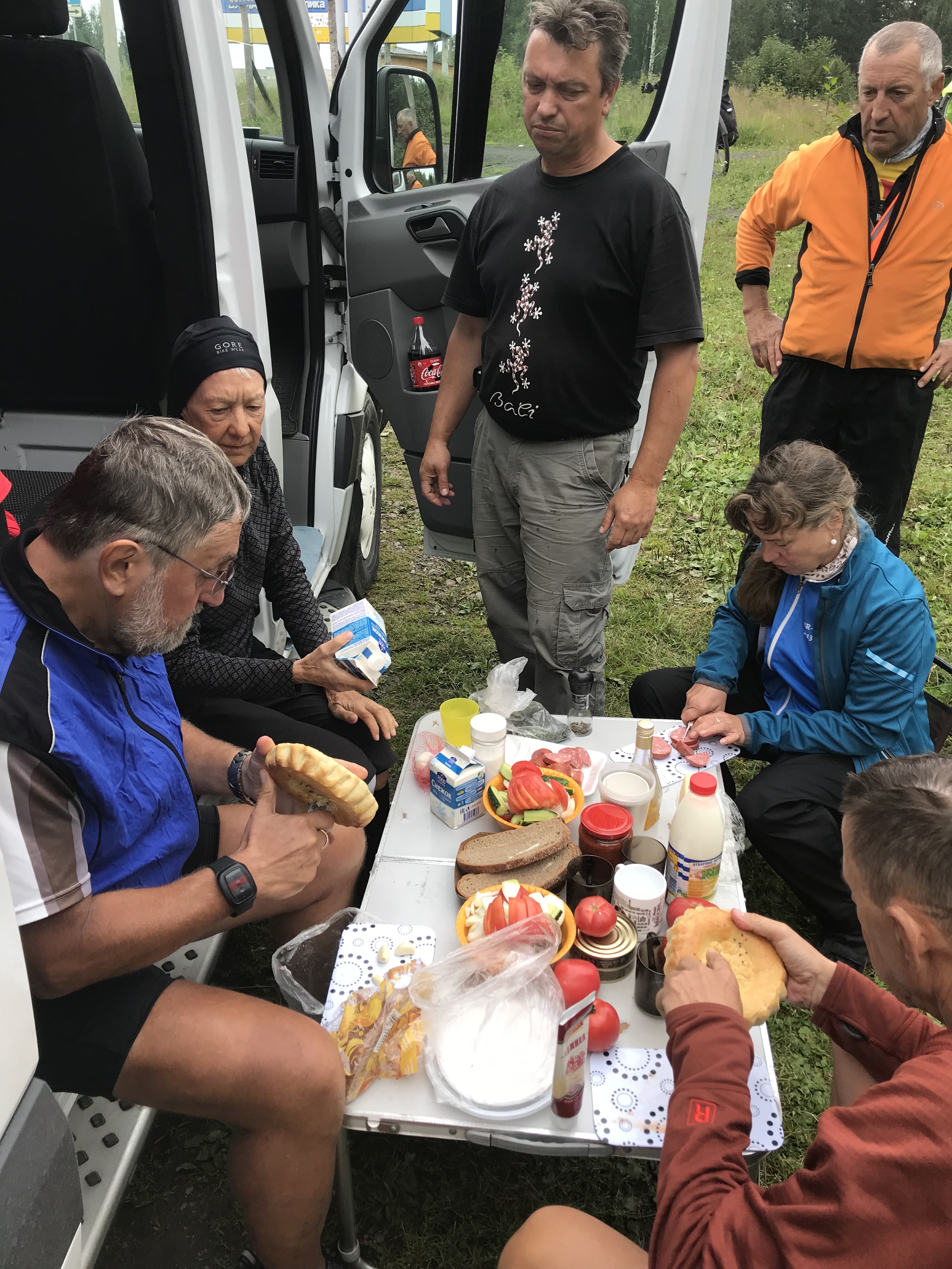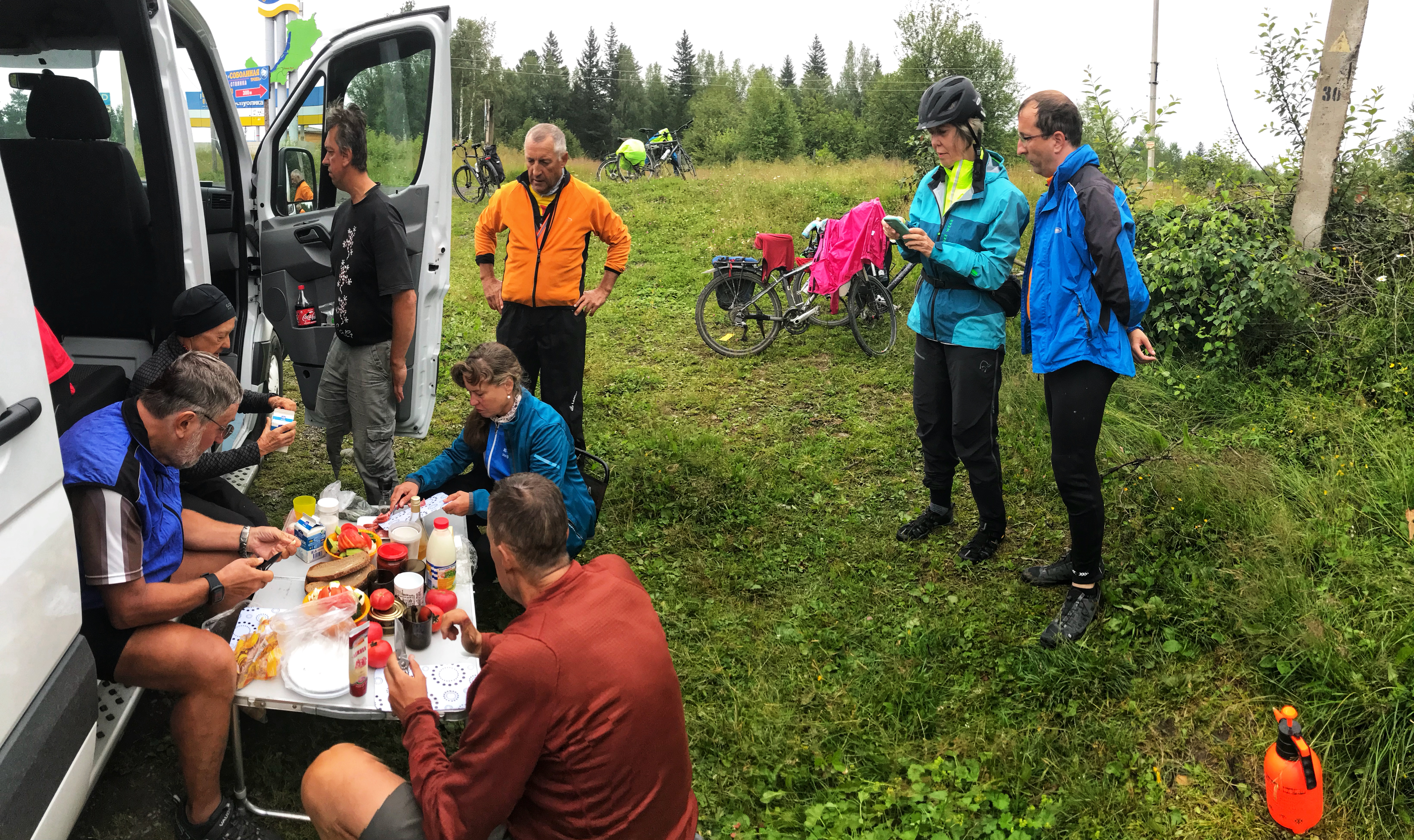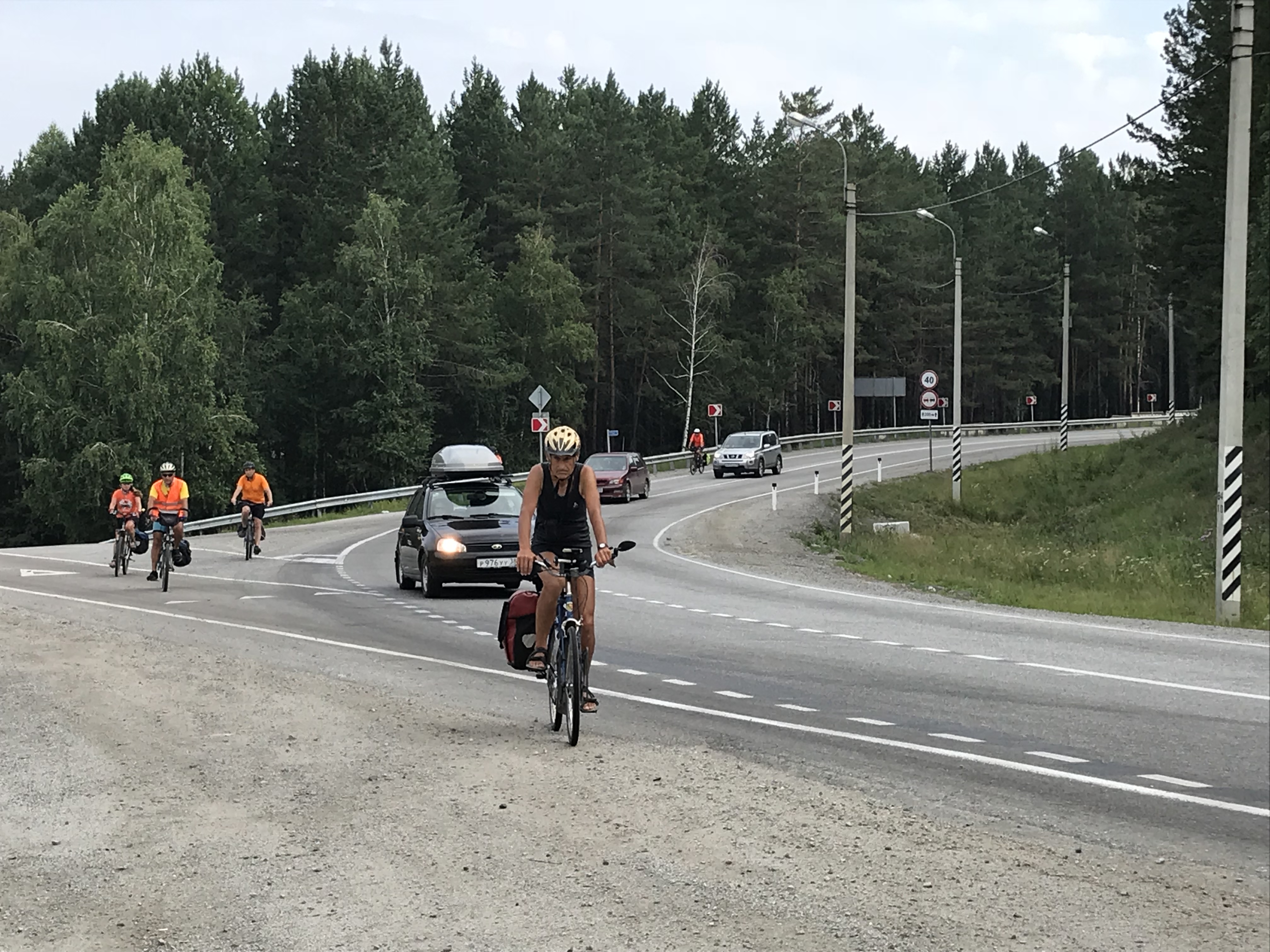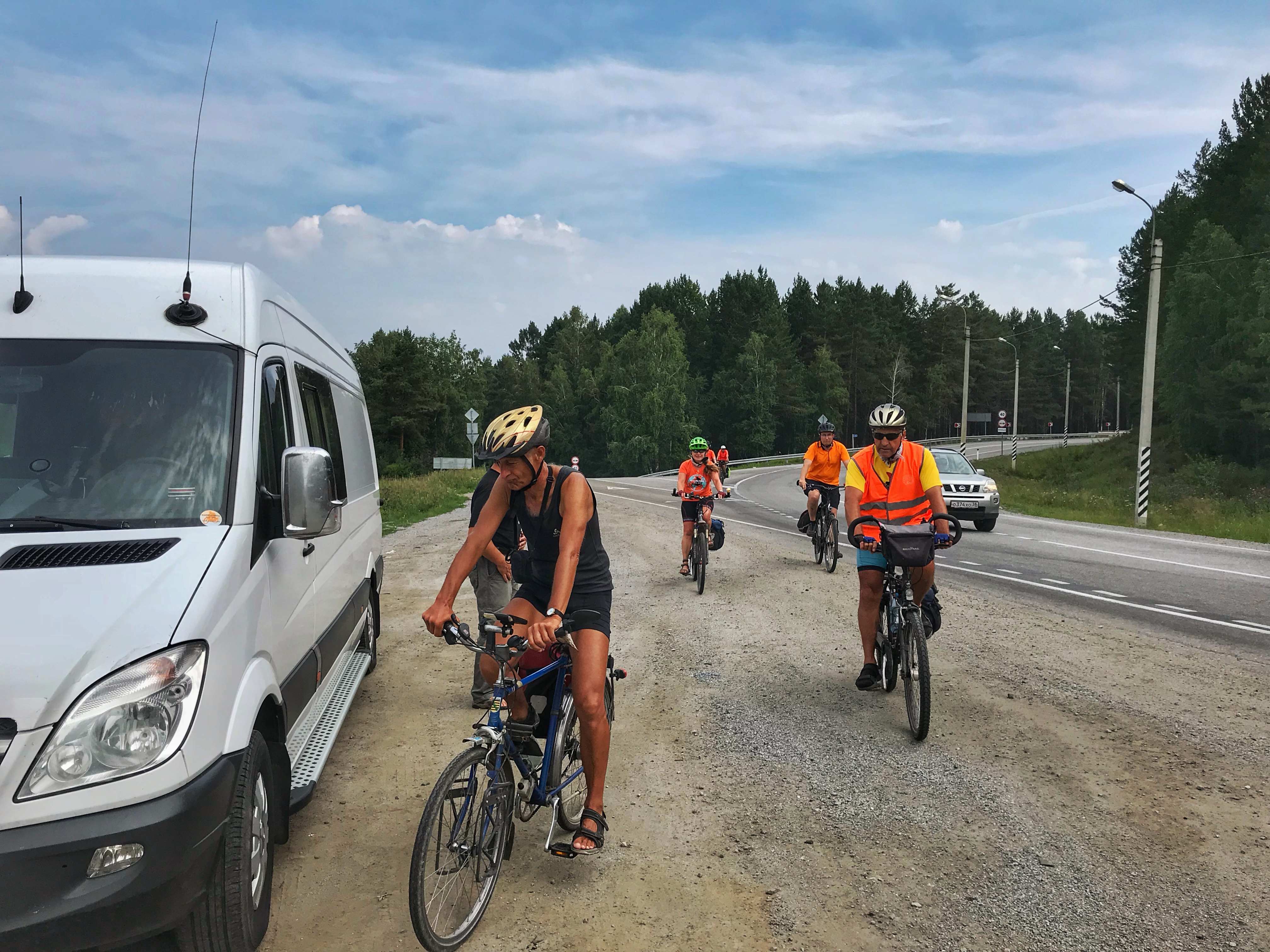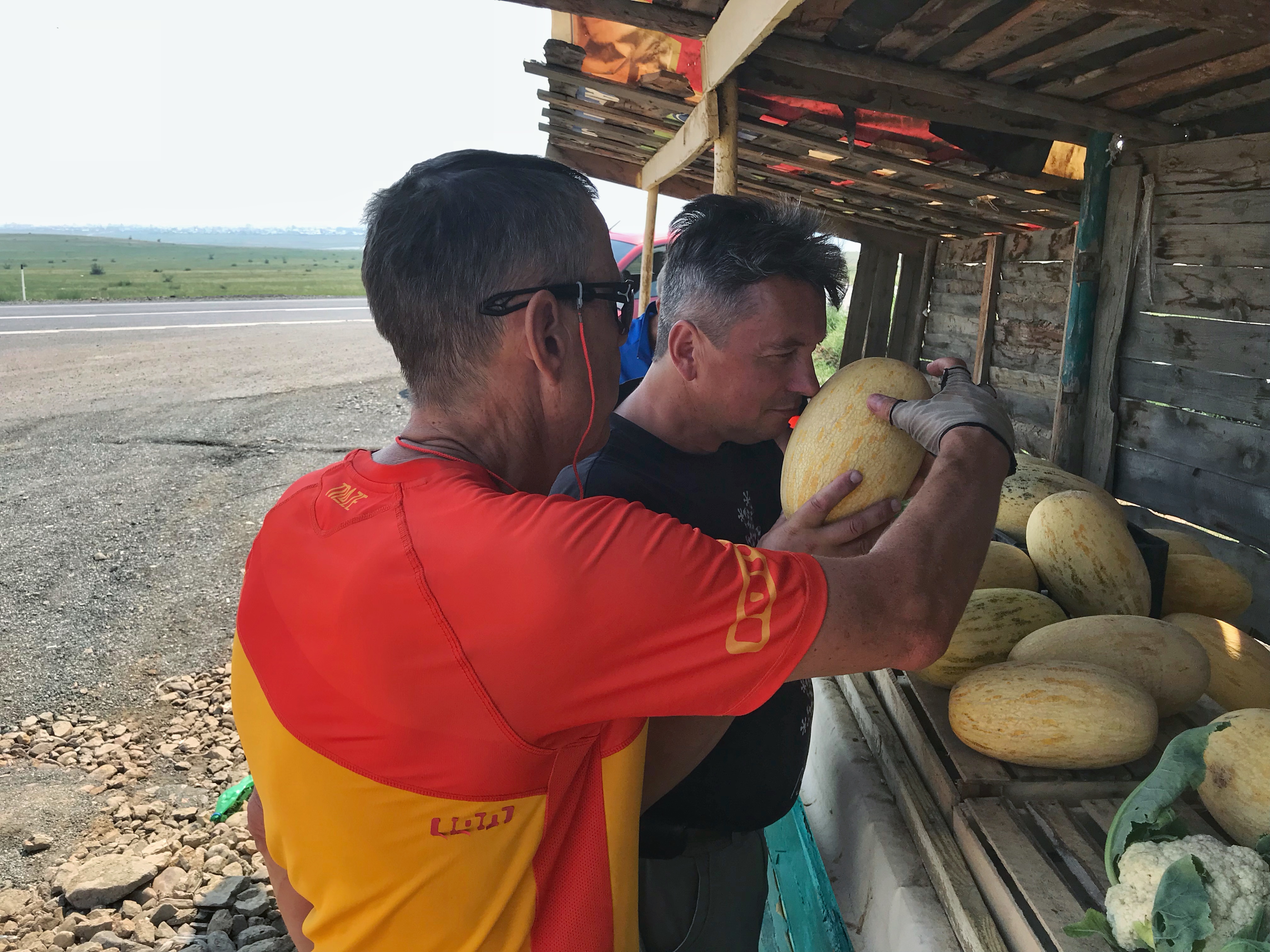 Die Landschaft hat sich später total geändert – es gab keinen Wald mehr, sondern nur noch Hügel und Steppe. Dann kam wieder ein Nadelwald mit Pinien (pinus daurica) und wir dachten, dass dies ein schöner Ort sei, um ein Picknick zu organisieren. Viktor und ich haben einen Platz auf der Spitze eines Hügels gefunden. Nach dem Picknick ging es drei Kilometer den Berg hinunter, gerade nach dem Essen eine herrliche Abfahrt! Aber danach kam die Hitze, über 28 Grad – eine echte Herausforderung.