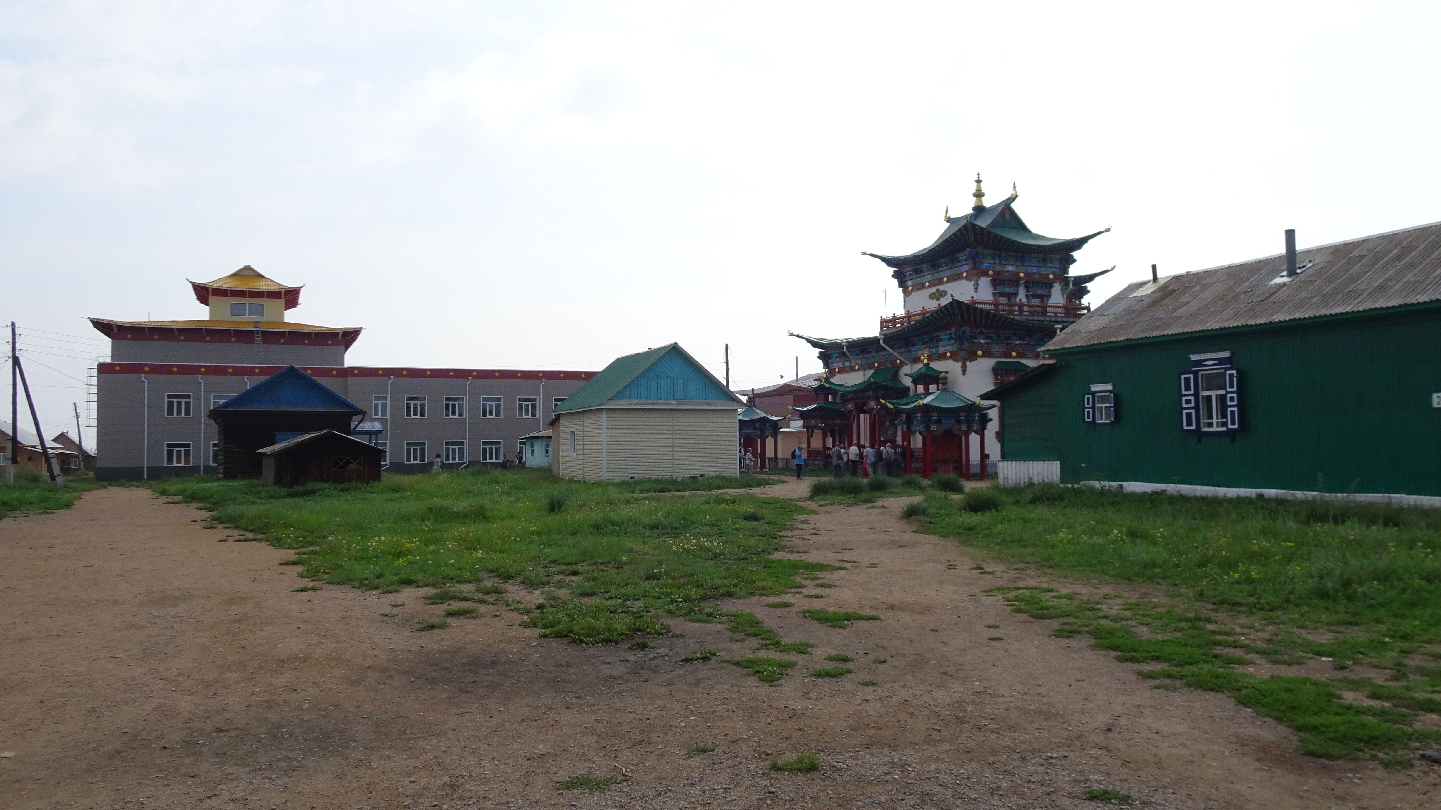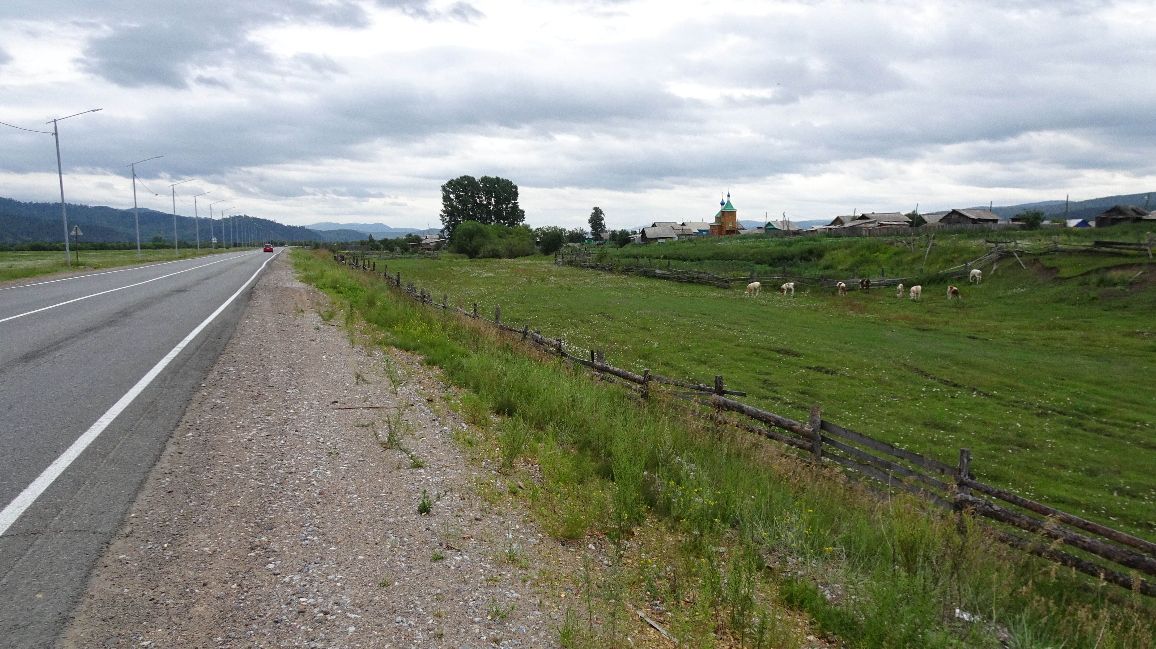 Morgens nach dem Frühstück fuhren wir weiter zur russisch-mongolischen Grenze. Die ersten 51 km waren sehr angenehm – frisch und nicht zu sehr bergauf. Nach einem Anstieg von nur 2 km ging es dann wieder bergab. Unterwegs haben wir 4 Stupas gesehen (in dieser Region liegt der Geburtsort von vier Hauptlamas in Russland), dann ein buddhistisches Kloster und ein paar Kilometer weiter ein orthodoxes Kloster. Danach wollten plötzlich viele, viele Schafe und Ziegen die Autobahn überqueren. Für die Einheimischen ist das eine ganz normale Situation 🙂