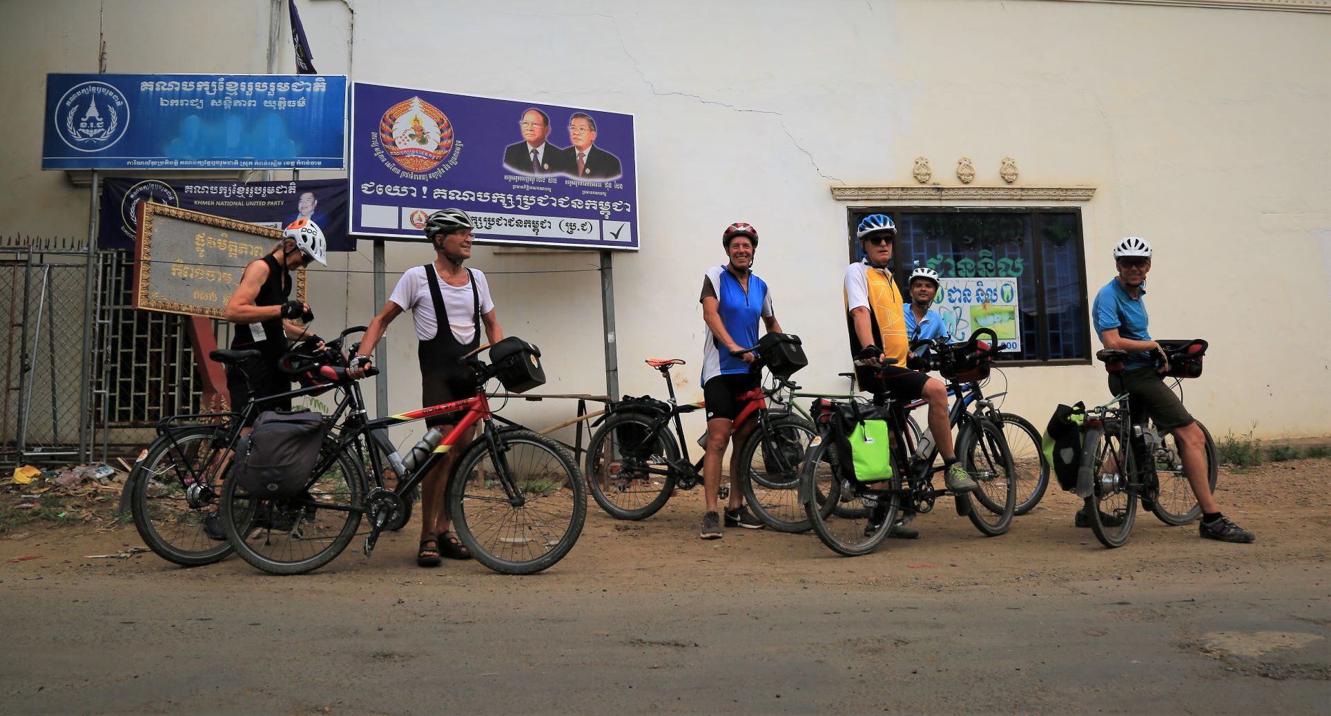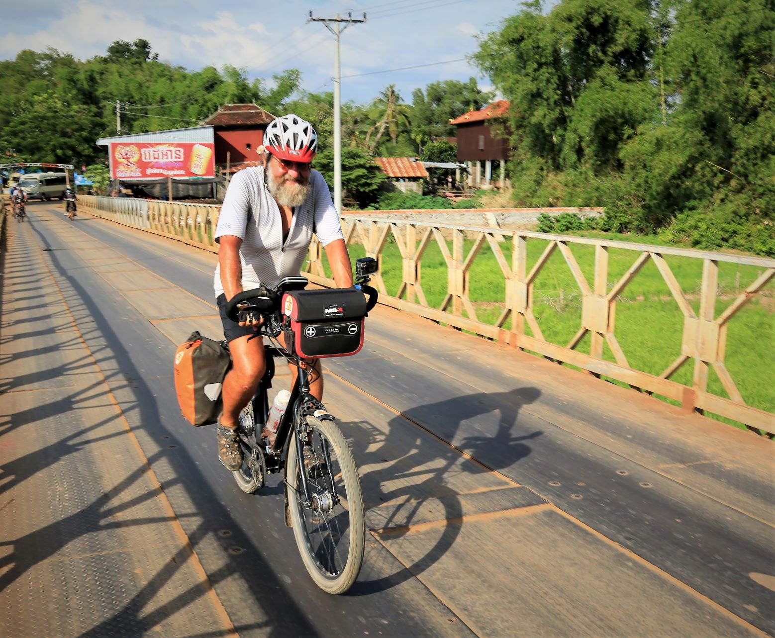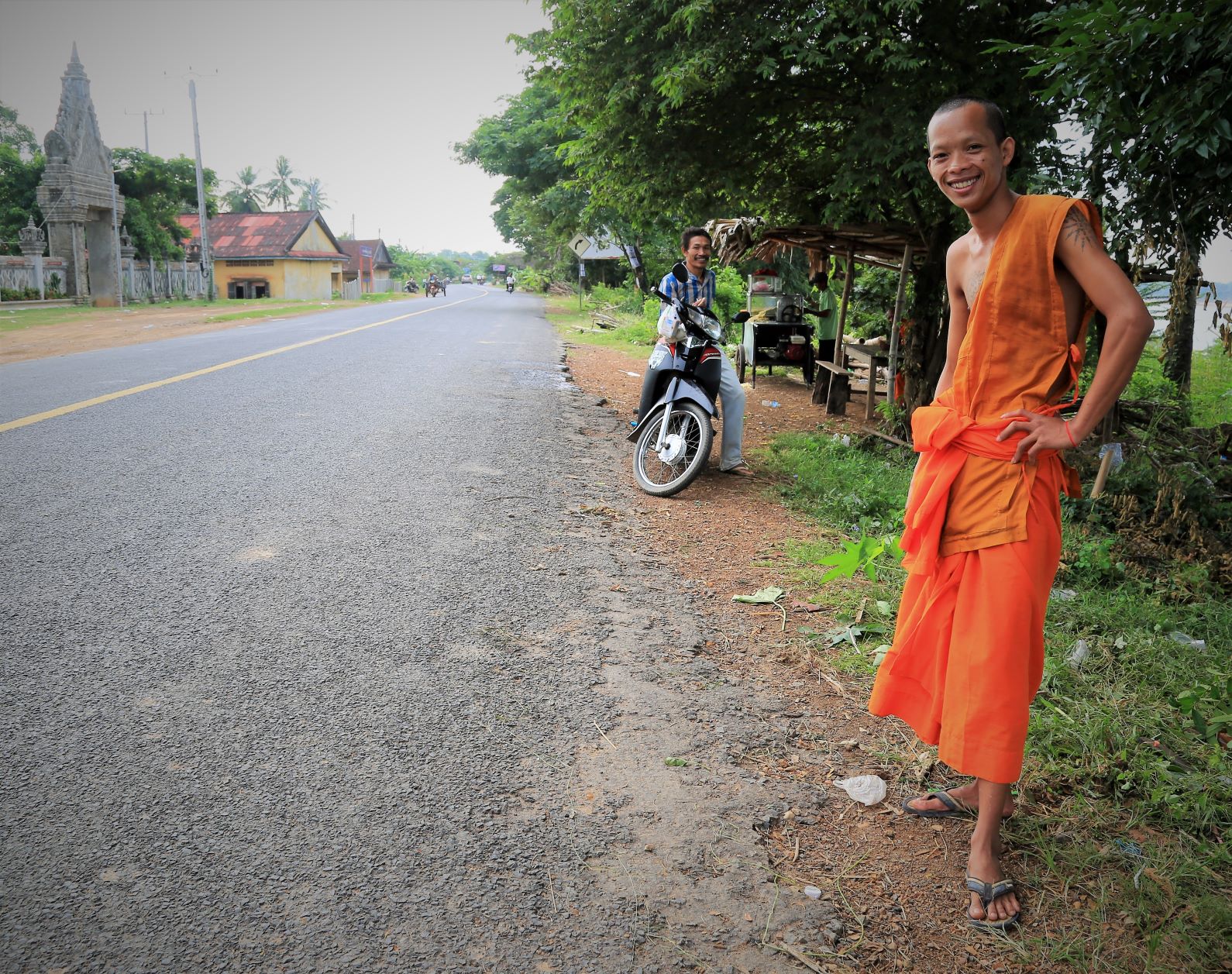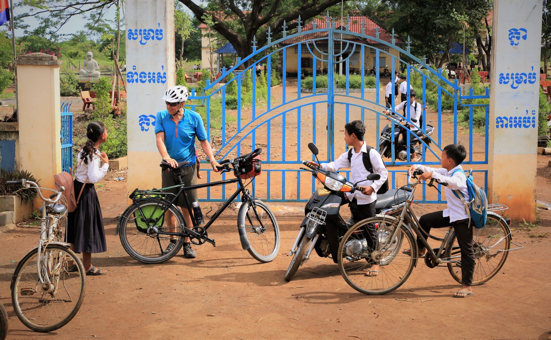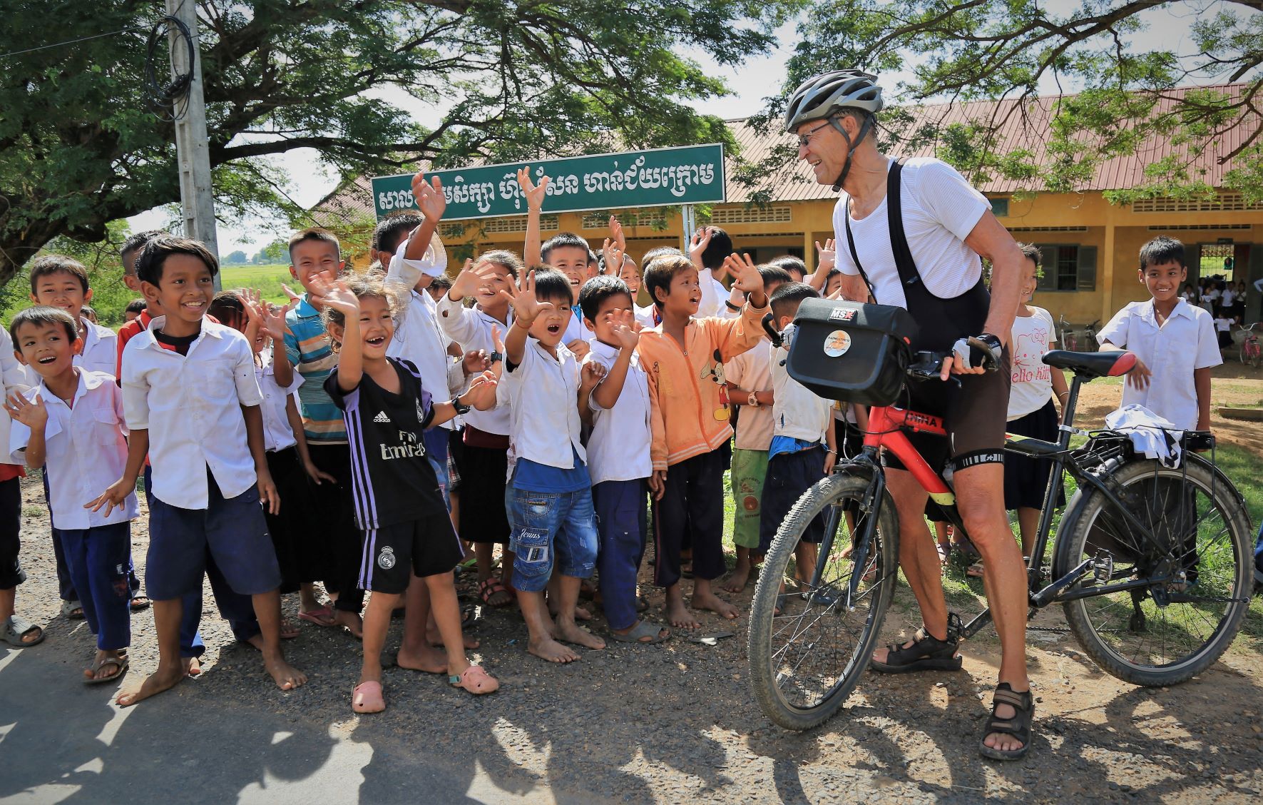 Suor Sdei, geht den meisten von uns Radlern noch schwer über die Lippen. Hello, ist da einfacher. Das weiß auch die kambotschanische Bevölkerung, und schmettert uns den Gruß verbunden mit einem Lächeln und einer winkenden Handbewegung pausenlos entgegen. Die Freude ist ernst gemeint und animiert uns es ihnen gleich zu tun, bzw. ihnen zuvorzukommen. Oft überholen wir Schulkinder auf Fahrrädern oder schwer beladenen Motorräder und überraschen mit einem: `Hello, wie gehts?`, was heute zu interessanten Gesprächen, aber auch zu überstürzten Abbiegemanövern führte.