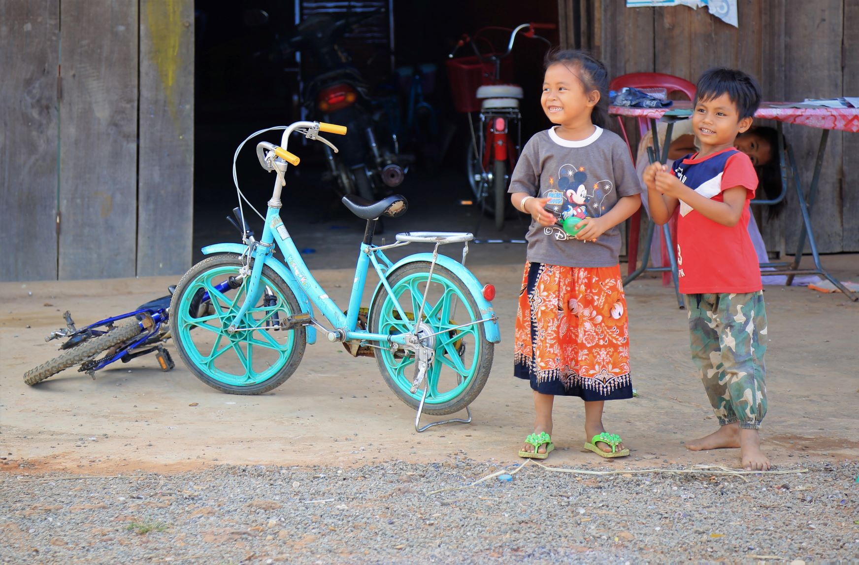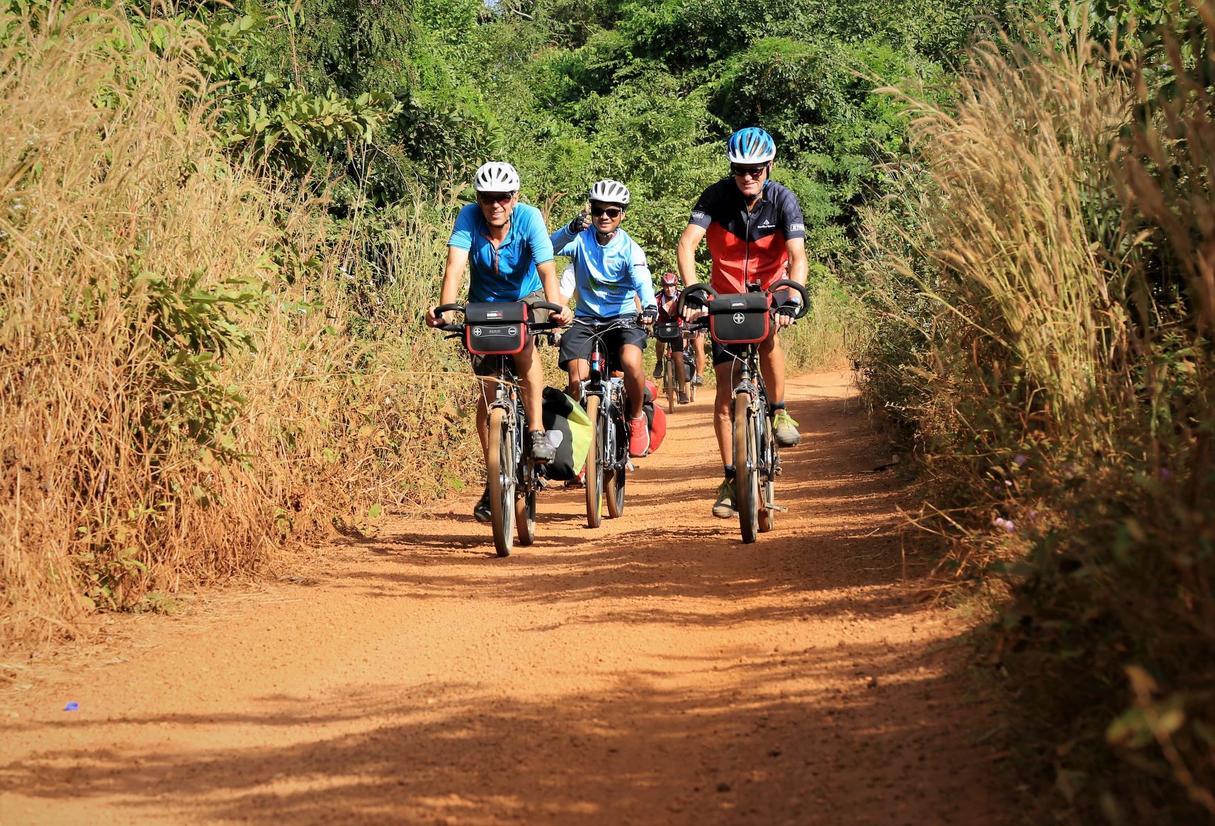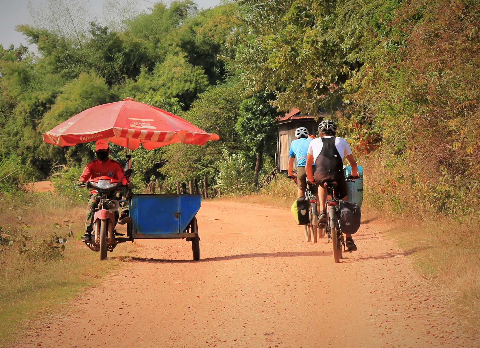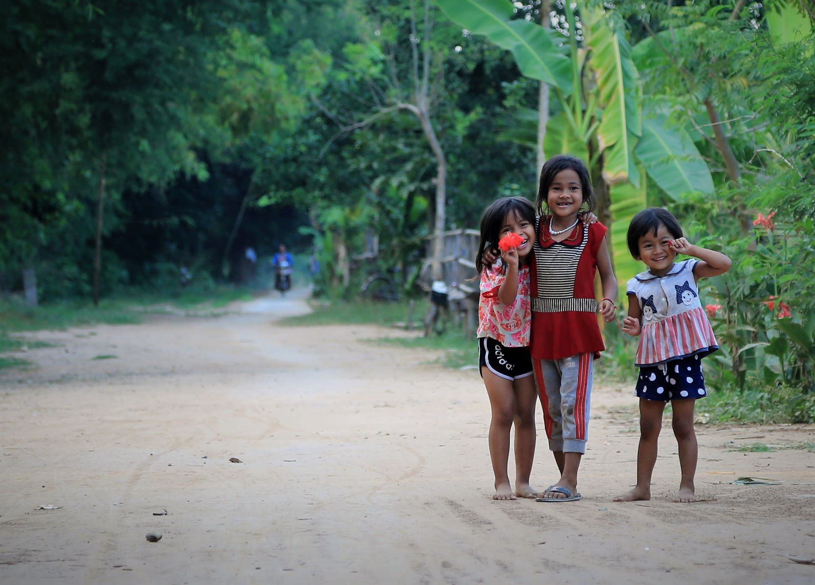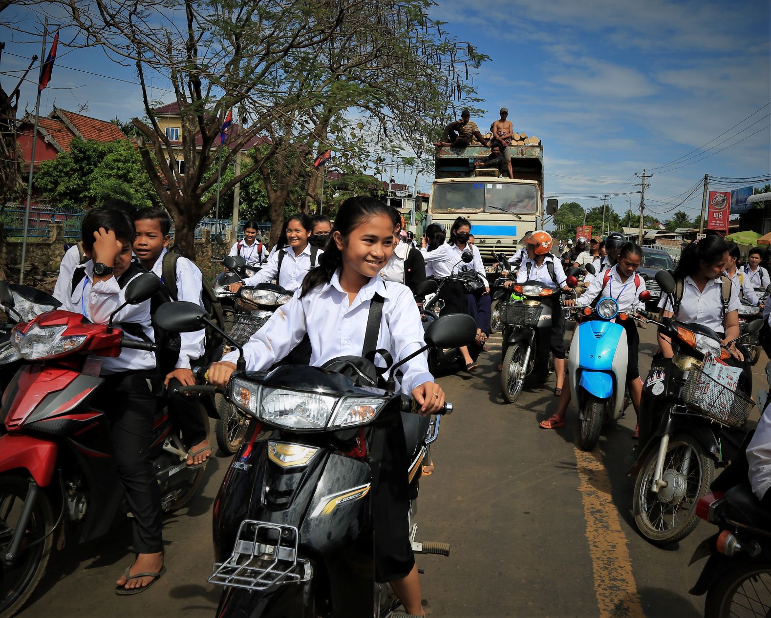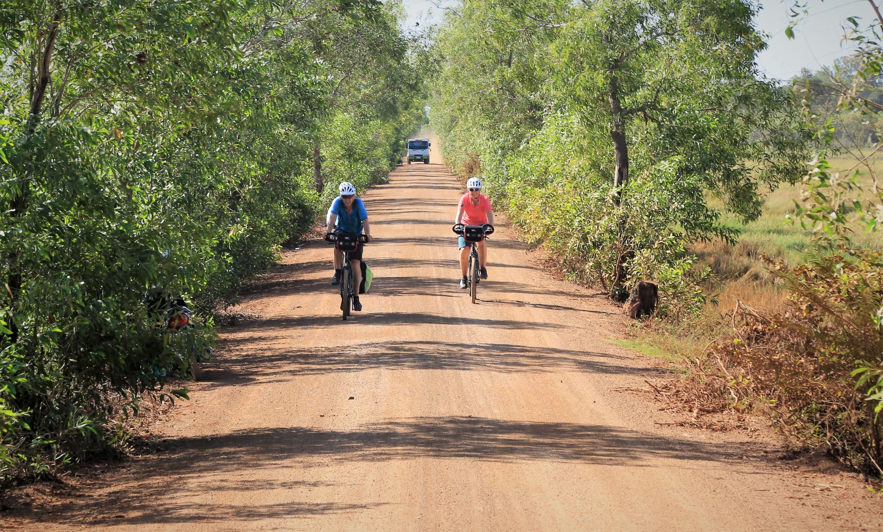 Suor Sdei, geht den meisten von uns Radlern noch schwer über die Lippen. Hello, ist da einfacher. Das weiß auch die kambotschanische Bevölkerung, und schmettert uns den Gruß verbunden mit einem Lächeln und einer winkenden Handbewegung pausenlos entgegen. Die Freude ist ernst gemeint und animiert uns es ihnen gleich zu tun, bzw. ihnen zuvorzukommen. Oft überholen wir Schulkinder auf Fahrrädern oder schwer beladenen Motorräder und überraschen mit einem: `Hello, wie gehts?`, was heute zu interessanten Gesprächen, aber auch zu überstürzten Abbiegemanövern führte.