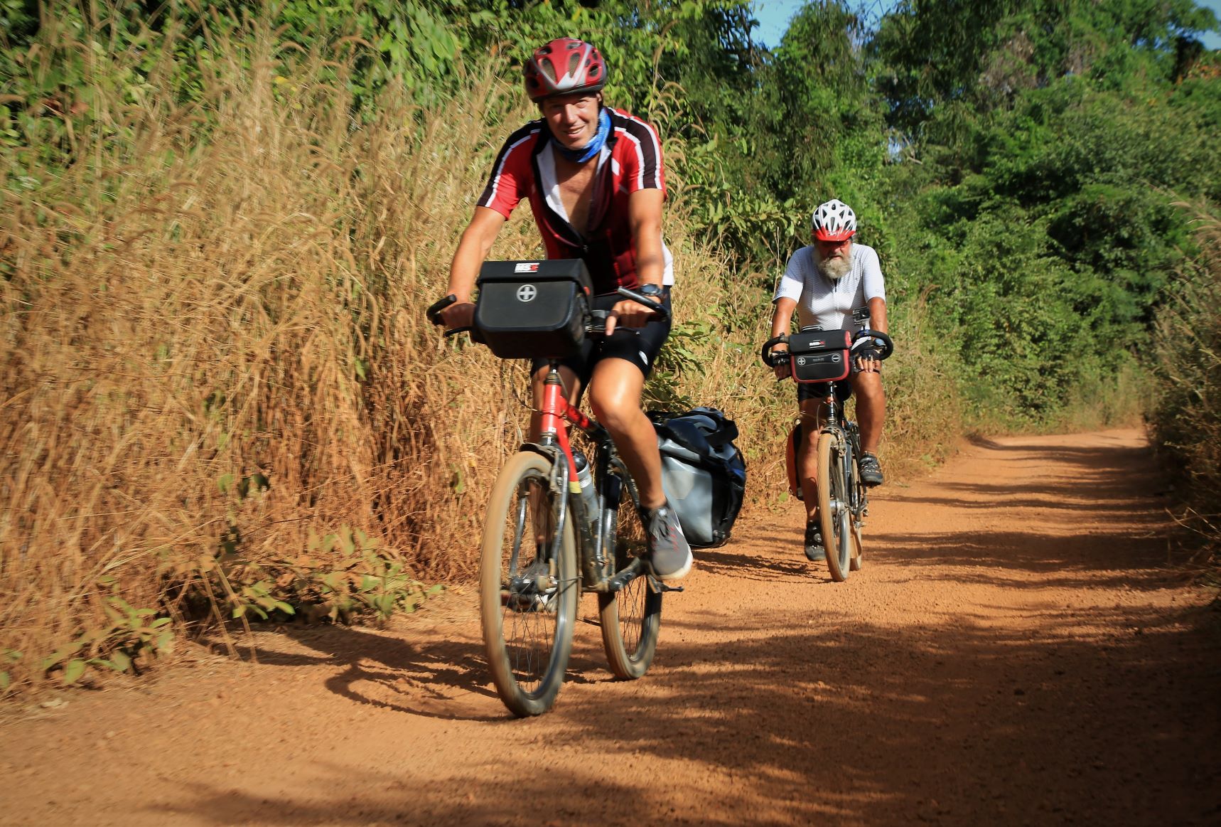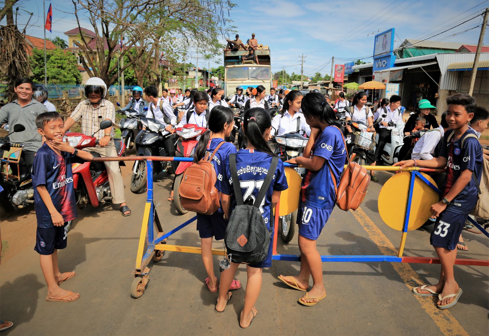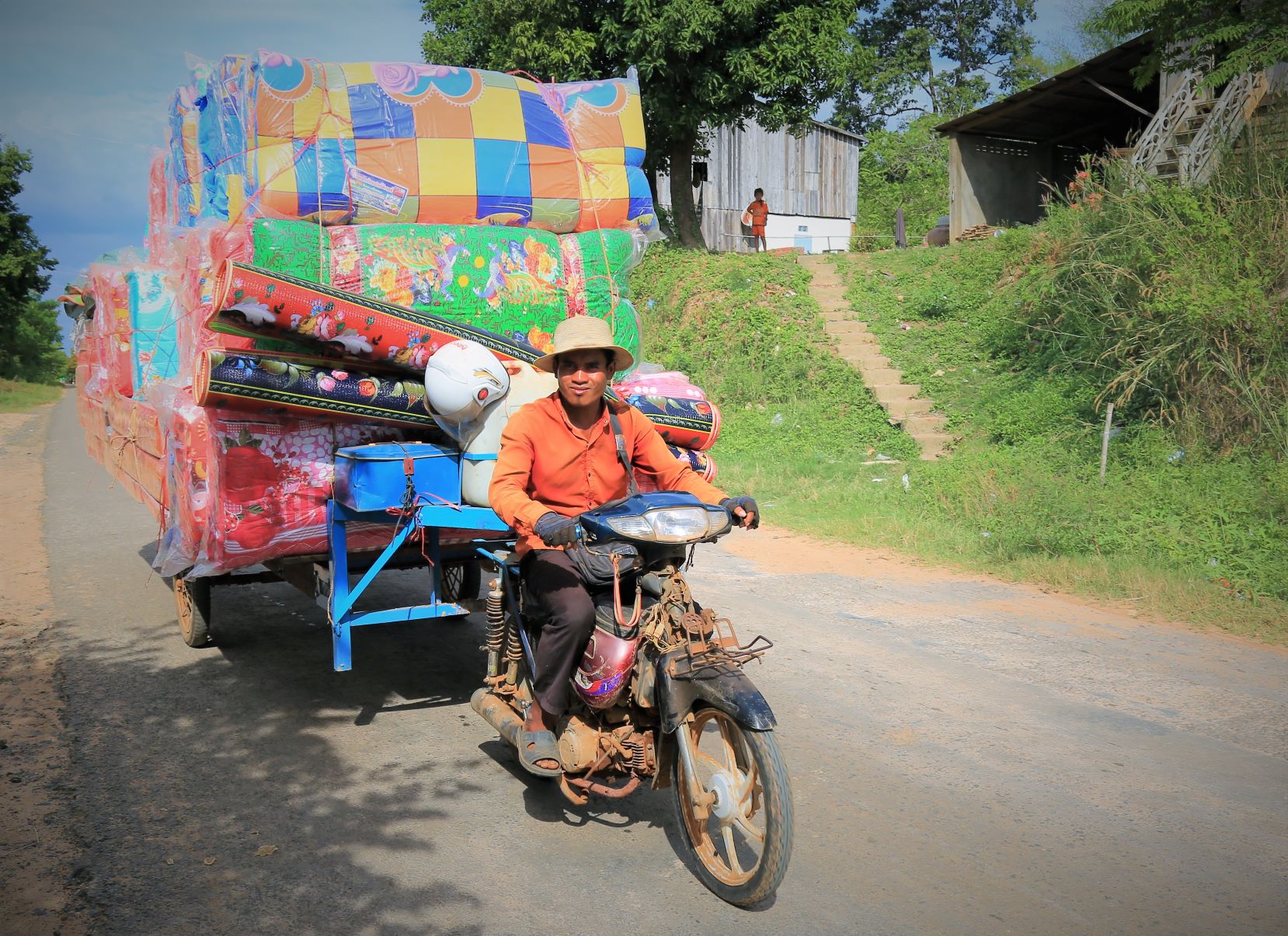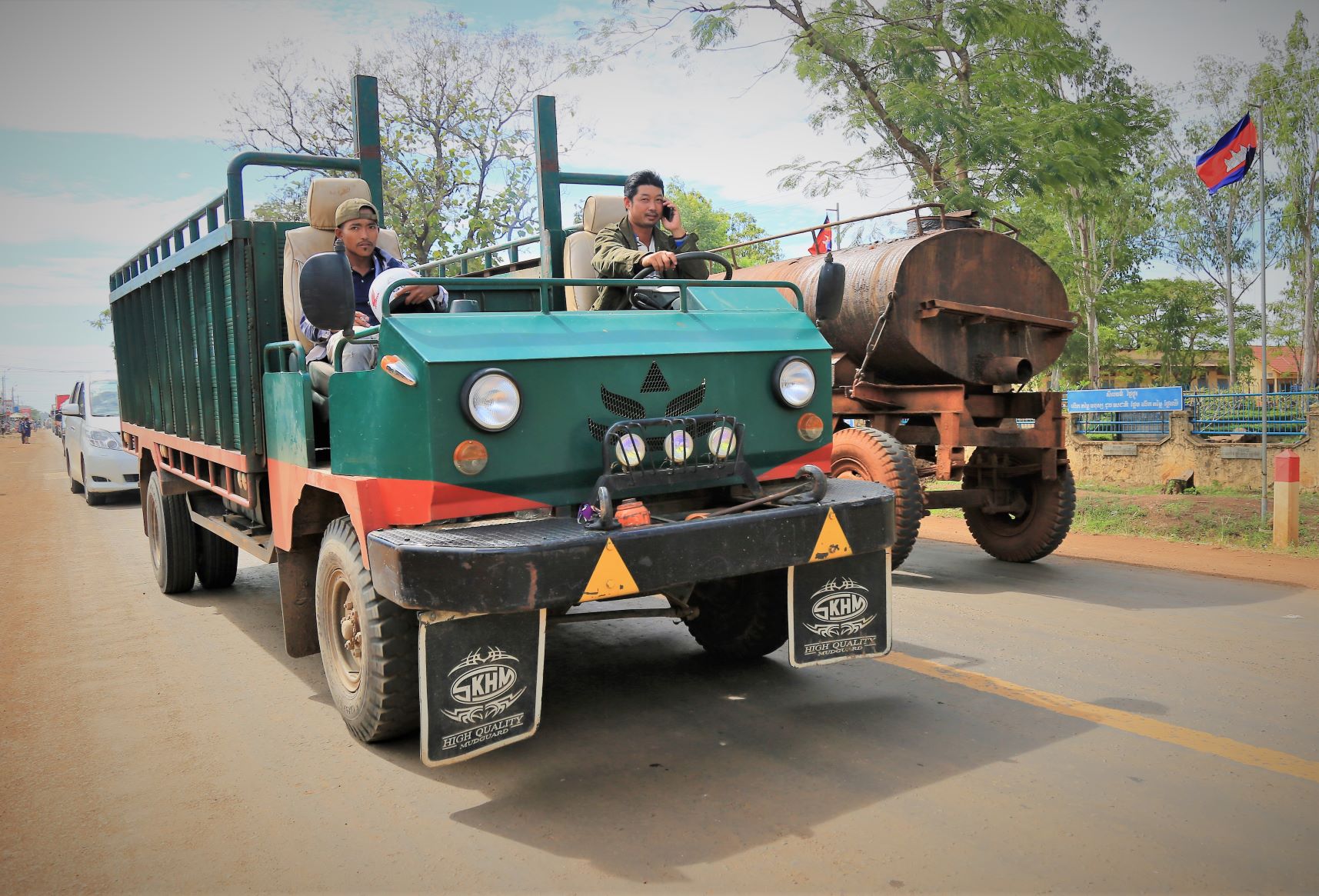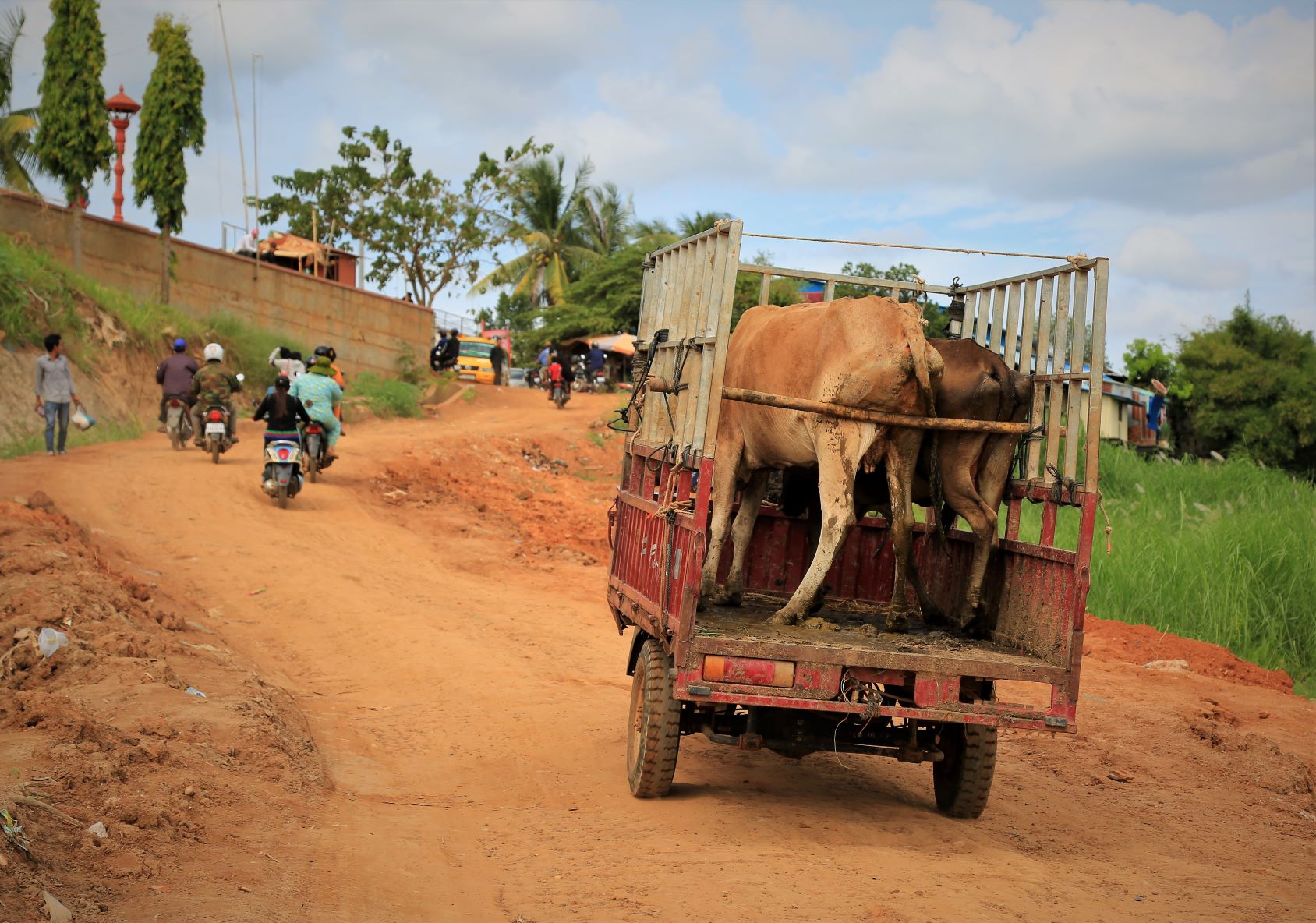 Suor Sdei, geht den meisten von uns Radlern noch schwer über die Lippen. Hello, ist da einfacher. Das weiß auch die kambotschanische Bevölkerung, und schmettert uns den Gruß verbunden mit einem Lächeln und einer winkenden Handbewegung pausenlos entgegen. Die Freude ist ernst gemeint und animiert uns es ihnen gleich zu tun, bzw. ihnen zuvorzukommen. Oft überholen wir Schulkinder auf Fahrrädern oder schwer beladenen Motorräder und überraschen mit einem: `Hello, wie gehts?`, was heute zu interessanten Gesprächen, aber auch zu überstürzten Abbiegemanövern führte.
