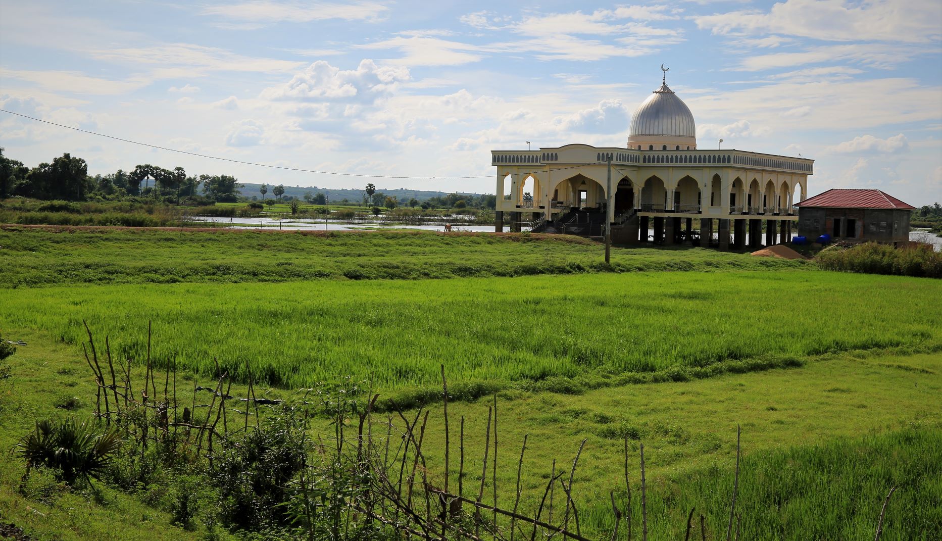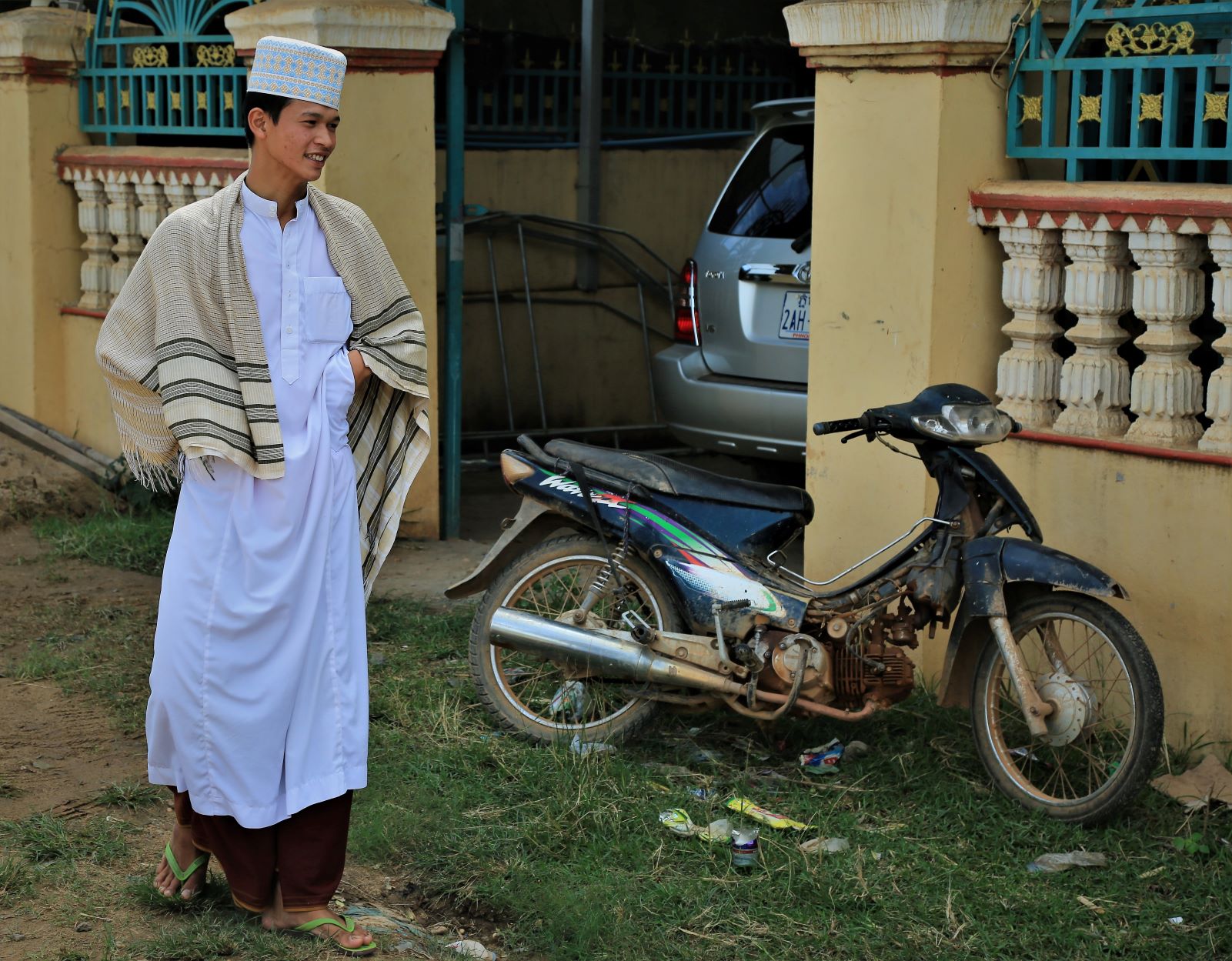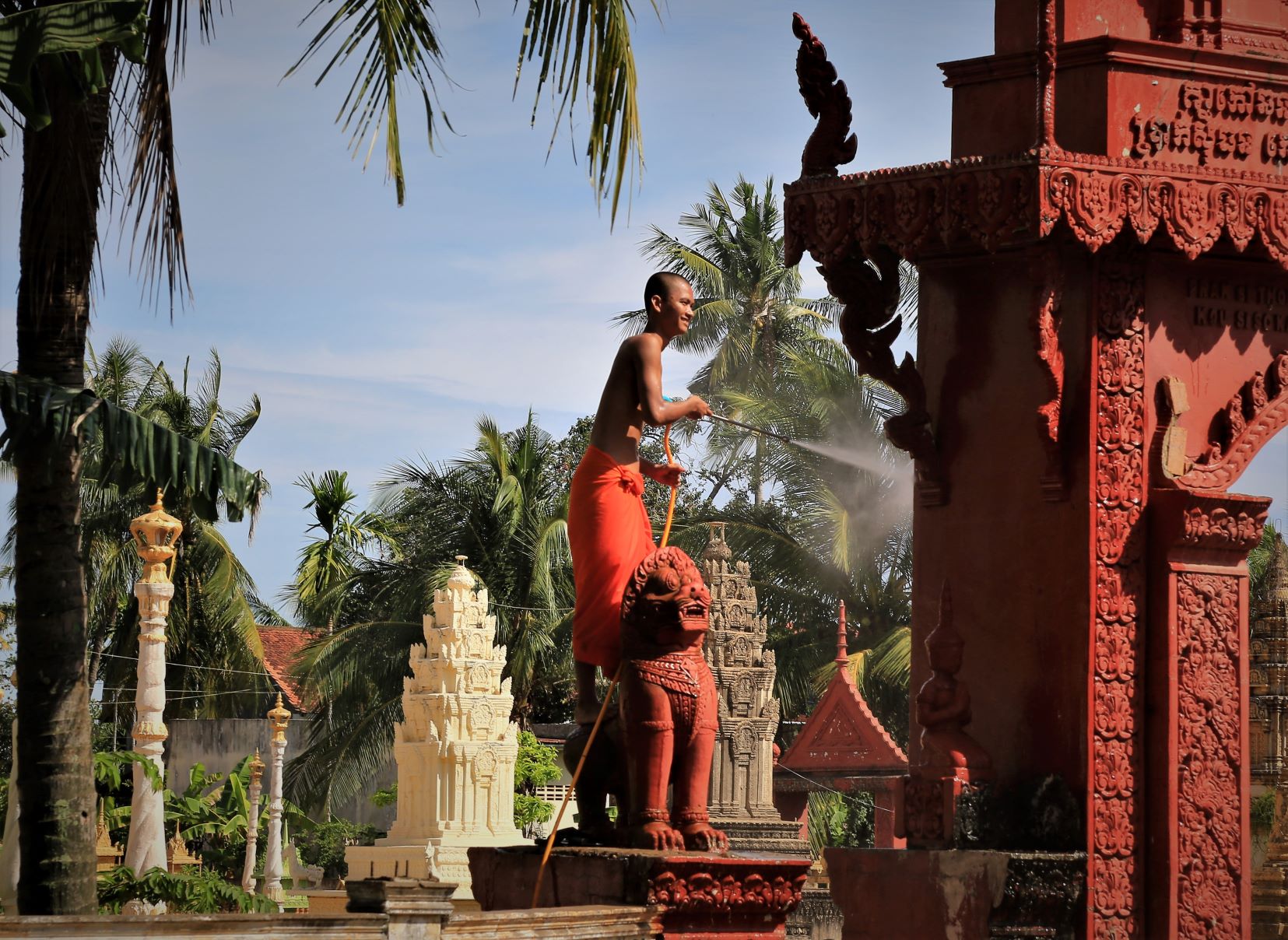 Die meisten der großen Religionen waren am heutigen Tag präsent. Da eine katholische Kirche, dort ruft der Muezzin (mit einer wunderbaren sonoren Stimme) zum Freitagsgebet und hunderte Menschen der ethnischen Minderheit der Cham , folgen und an der nächsten Ecke reinigt ein buddistischer Mönch den Torbogen zur üppigen Tempelanlage. Keine Ahnung wie sie zu ihren spitituellen Konkurenten stehen, aber scheinbar existieren die unterschiedlichsten Weltanschauungen in diesem Bereich der Erde friedlich nebeneinander. Muss am Klima liegen …