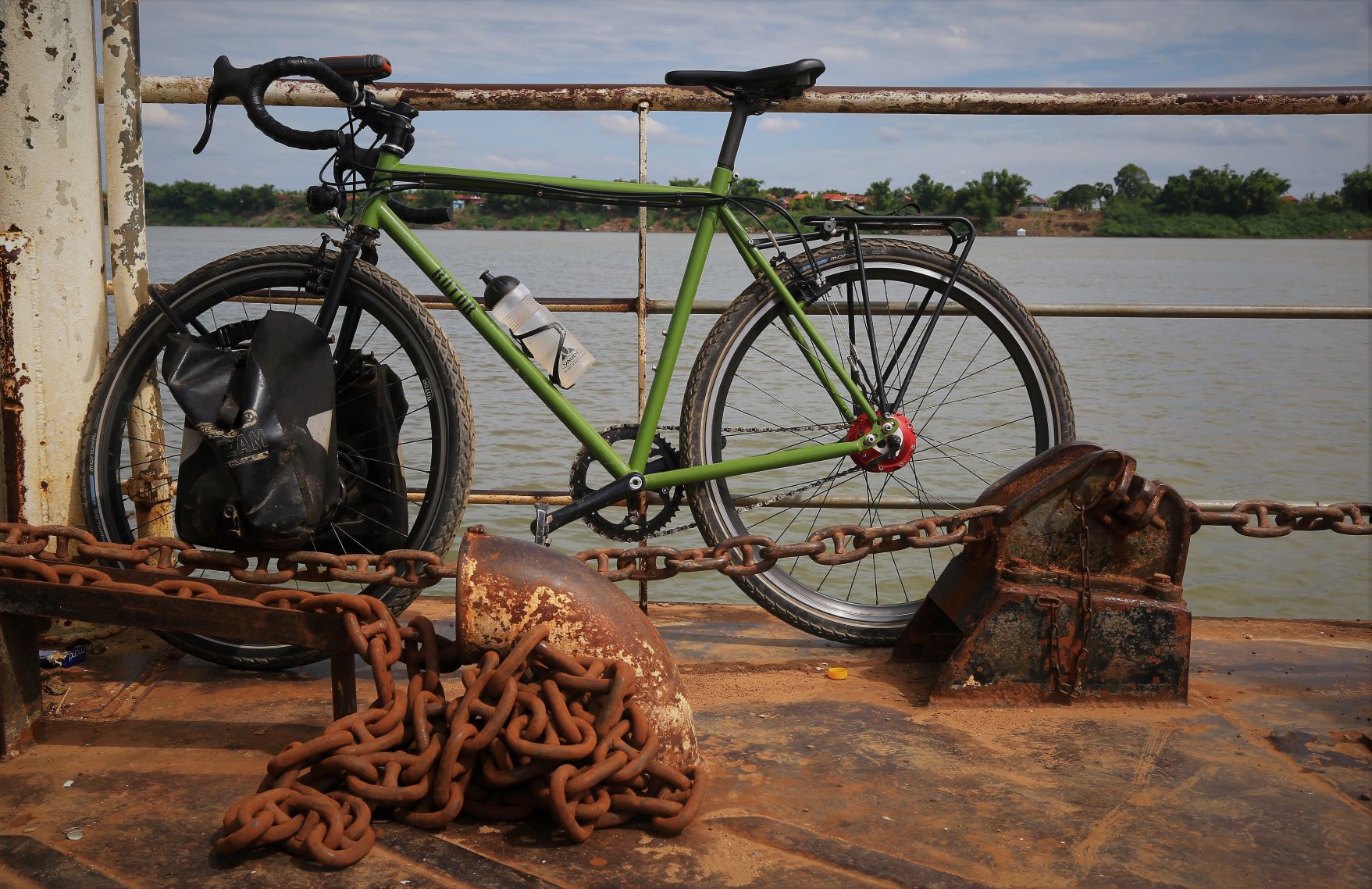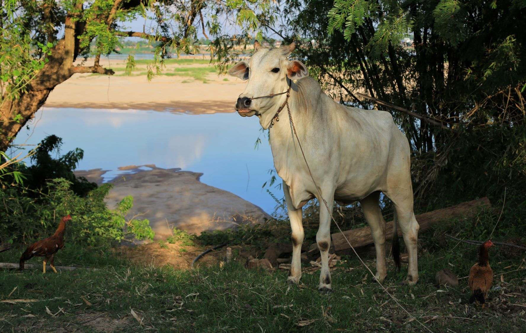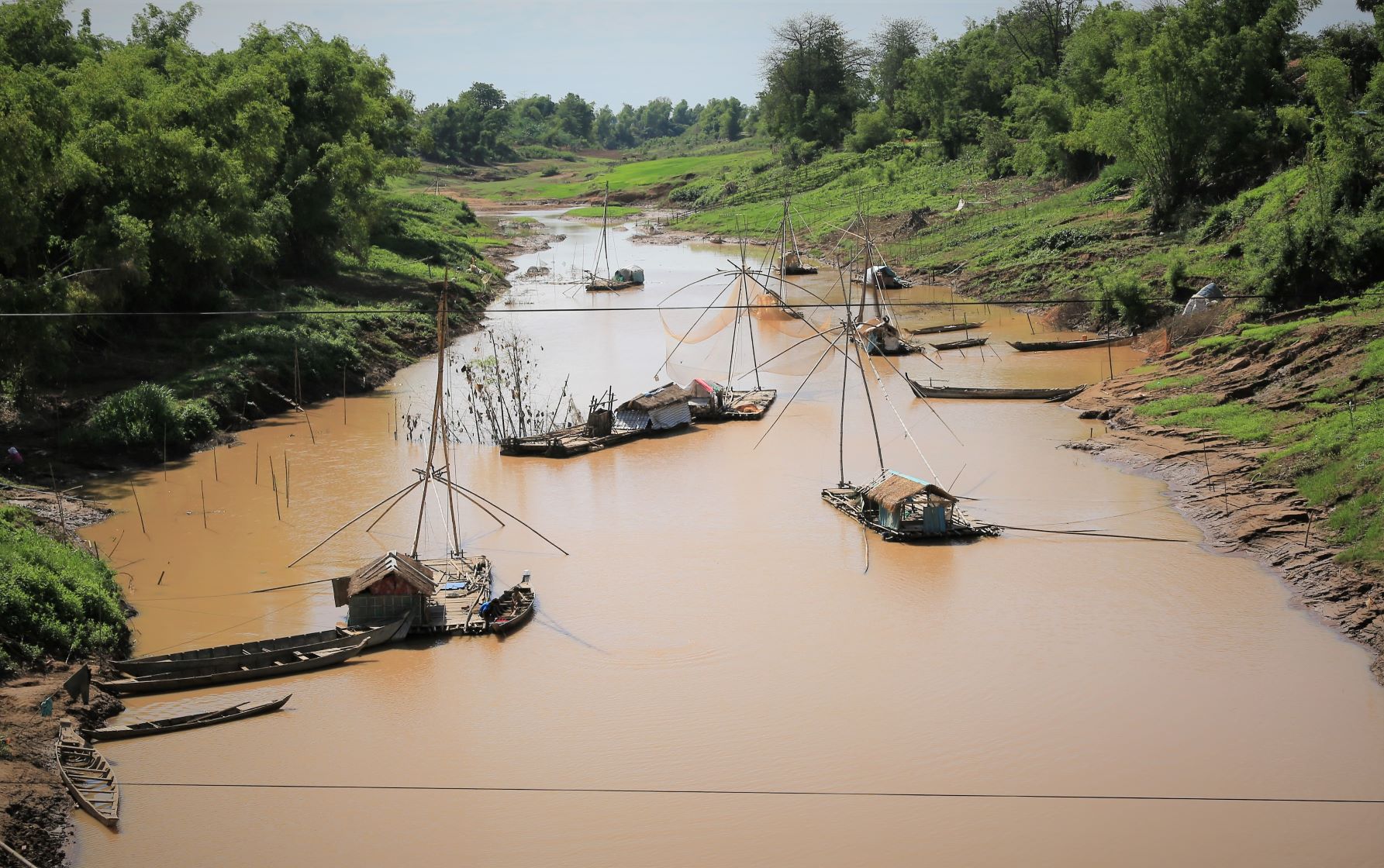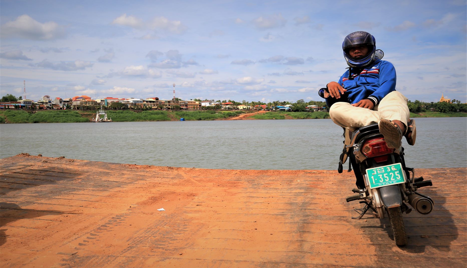 Wir radeln durch Reis- und Maisfelder, Mango- und Bananenplantagen und einem scheinbar endlosen Straßendorf. In Stung Trong überqueren wir mit einer Fähre letztmalig den Mekong., besuchen noch die Pagode Han Chey und lassen uns nach Kampong Chan unserem Tagesziel, mit 150.000 Einwohner die drittgrößte Stadt Kambotschas, ausrollen.