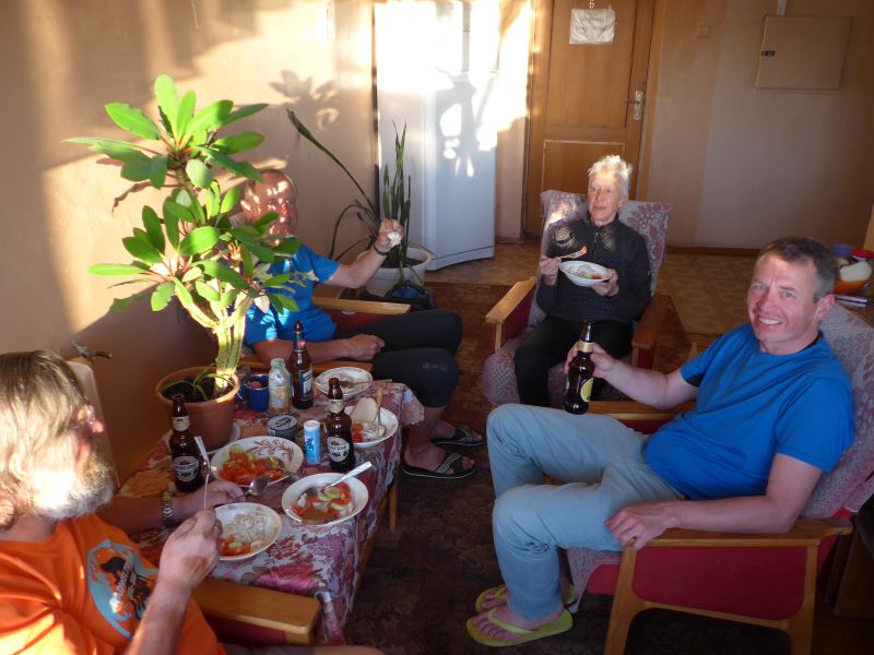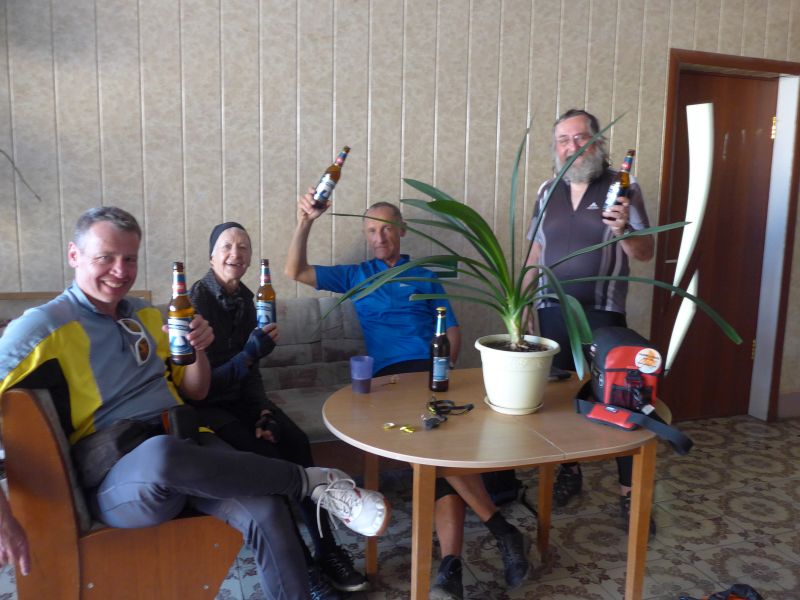 Als uns dann noch Viktor mit seinem frisch ausgebauten Mercedes-Bus hinter der Grenze mit Keksen, Schokolade und Tee empfangen hat, war die Anspannung vollkommen abgefallen. Nur noch ins Hotel ein Bier und alles hat / hätte wie am Schnürchen geklappt. Ein perfekter Tag…