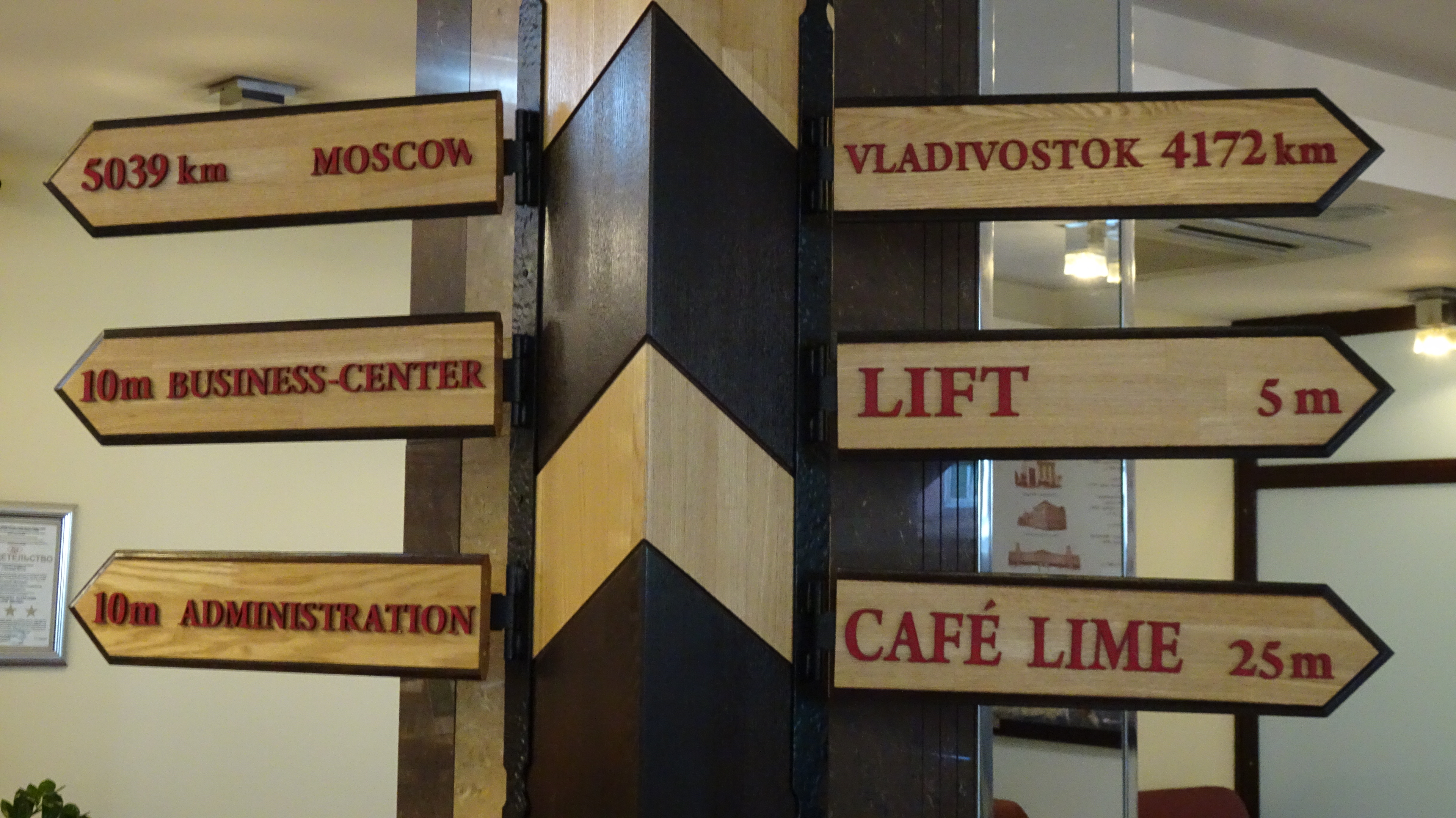 Noch unglaublicher ist dieser Vergleich, s.a. das Foto aus der Hotelhalle (des „Empire“, gleich neben der Brotfabrik, in dem wir 3-sternig komfortabel ruhetagen): Bis Wladiwostock sind es „nur“ noch 4172 Kilometer, bis Moskau dagegen 5029 Kilometer!