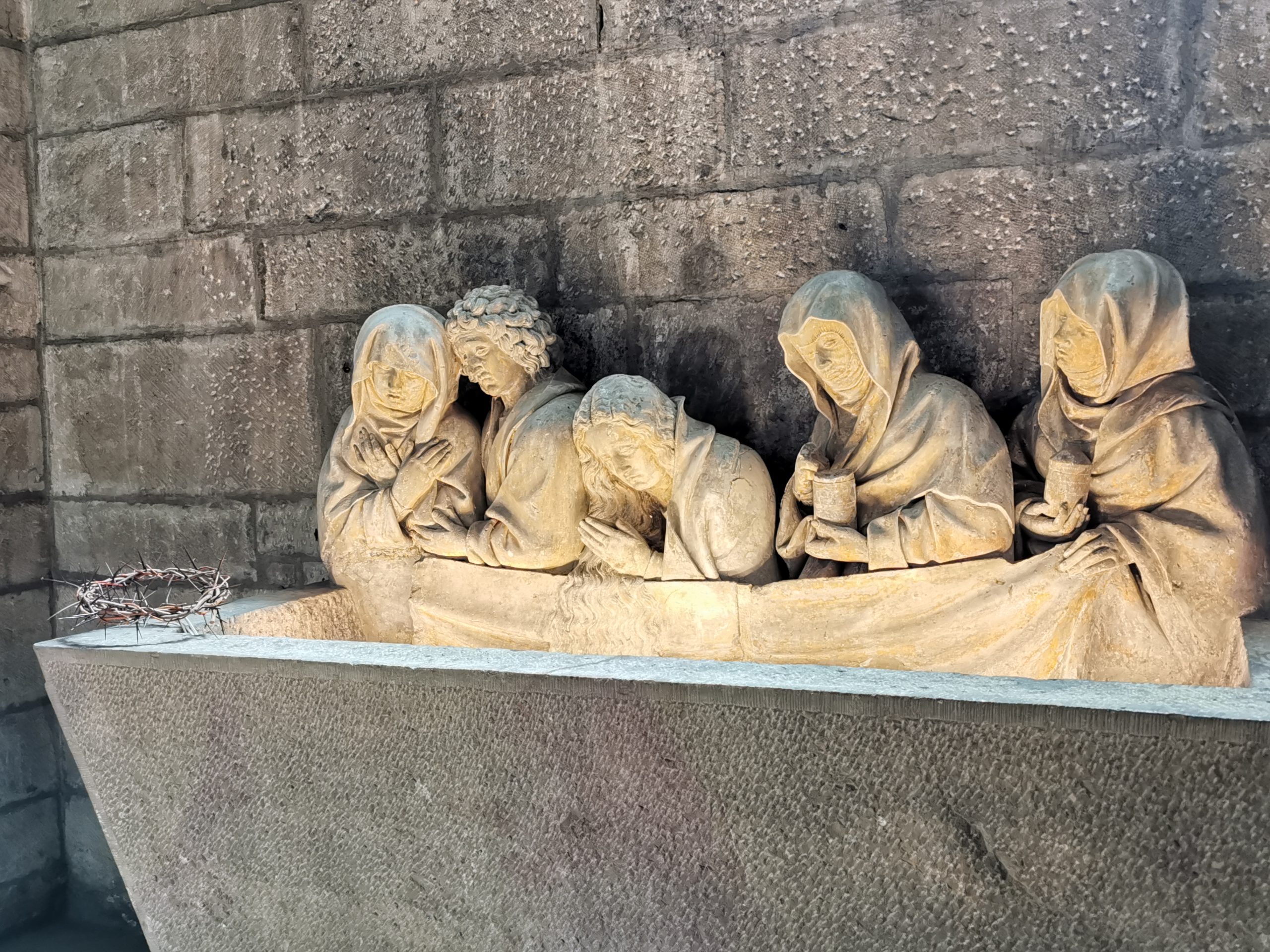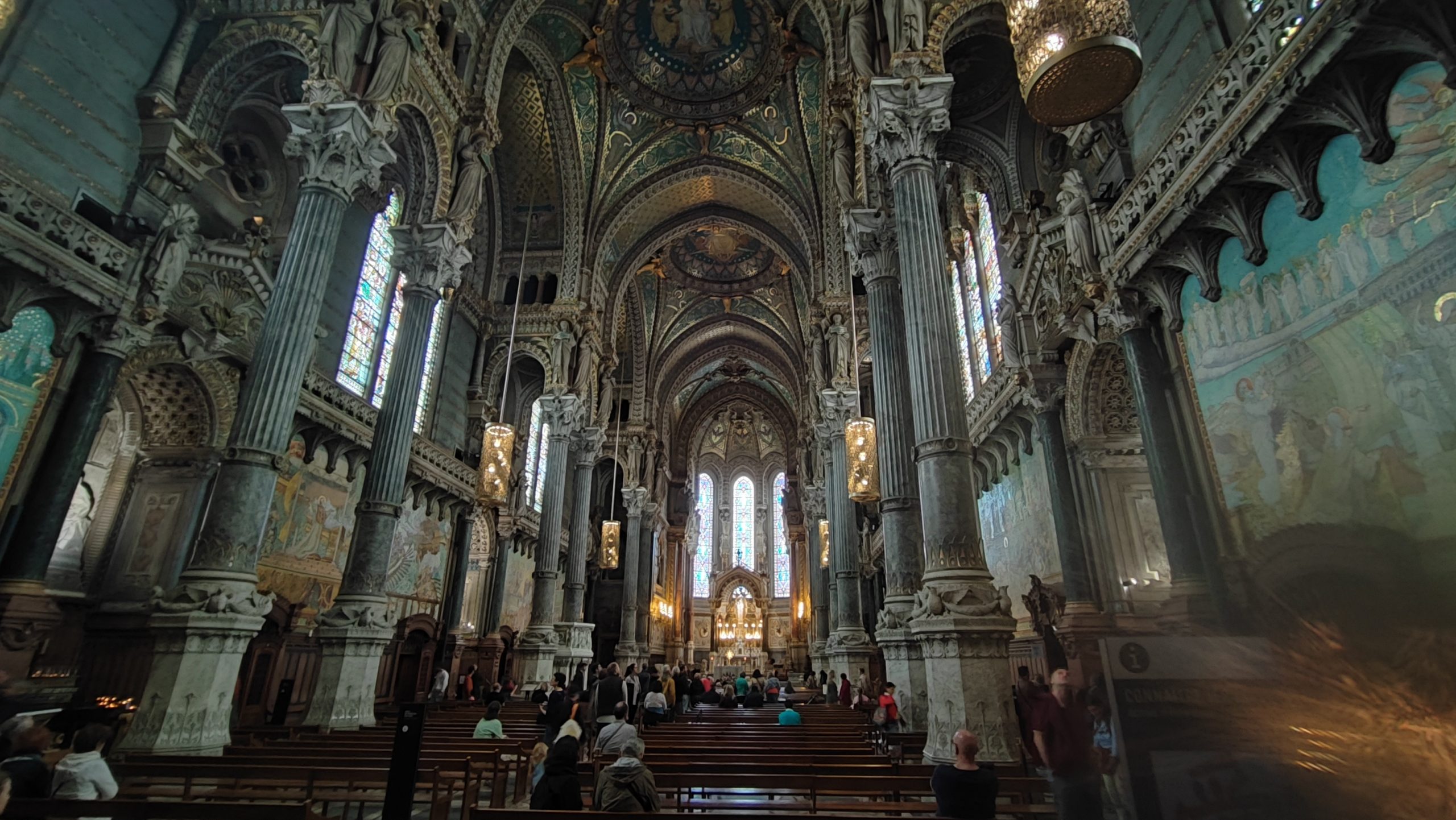 Wenige Schritte entfernt fahrt die Funiculaire (eine Kabinenbahn – im Preis des Tagestickets inkludiert) hinauf auf den Fourvièrehügel und spuckt uns direkt vor der der Wallfahrtskirche Notre Dame aus. Die Kirche wurde im 19. Jahrhundert im historische-eklektizistischen Stil erbaut, will sagen, der Architekt hat sich bei den Byzantinern und der Romanik bedient.