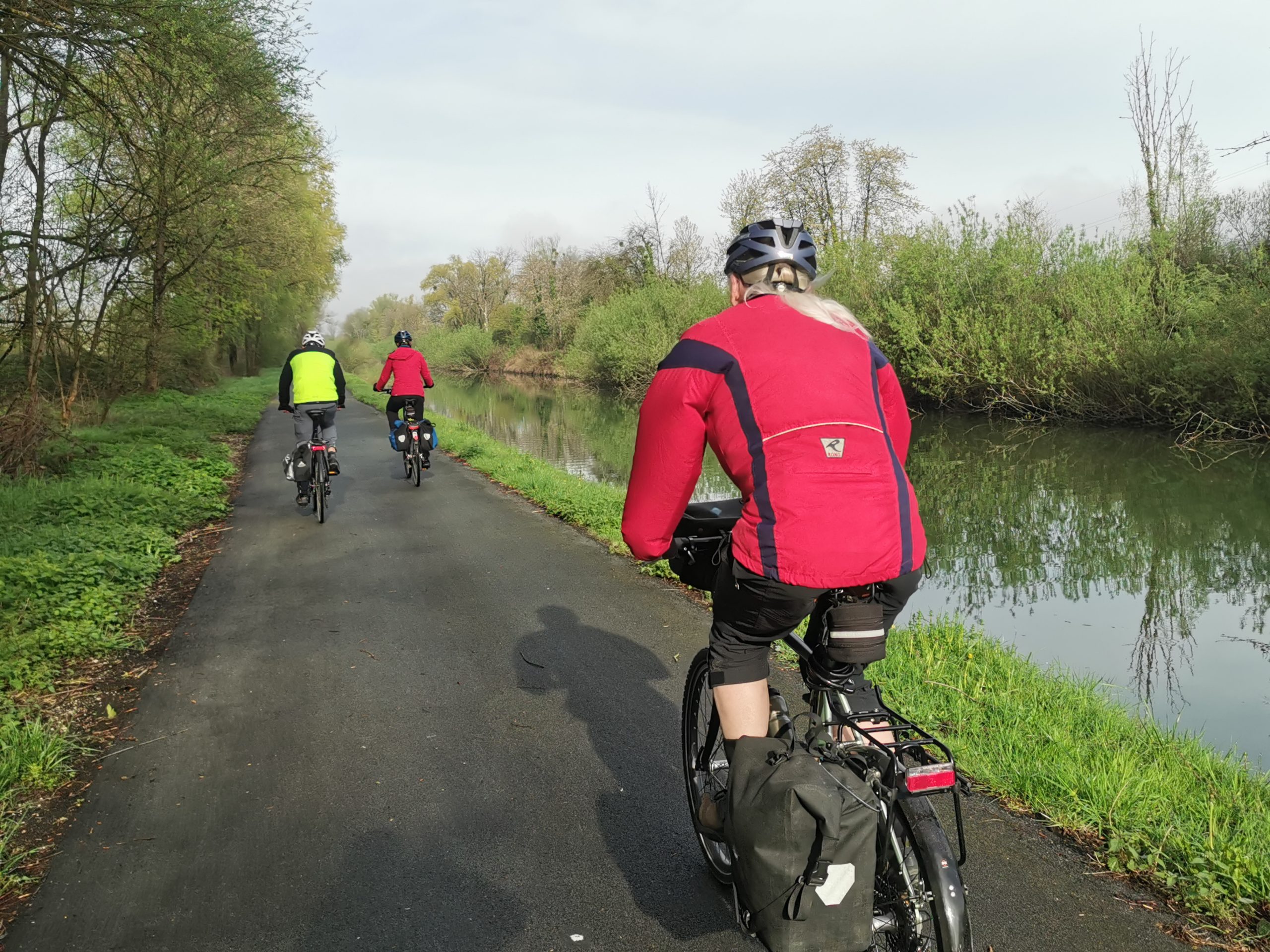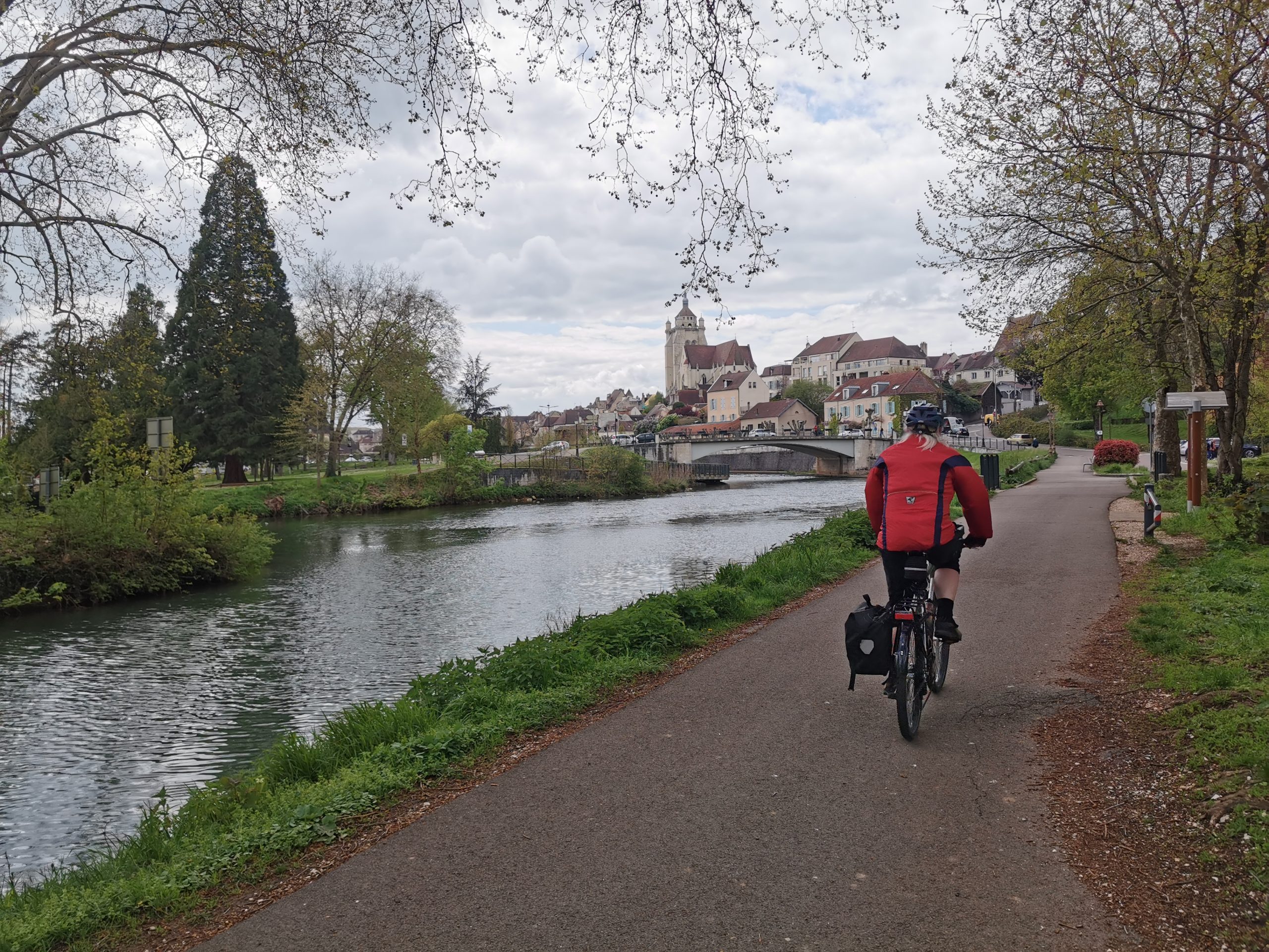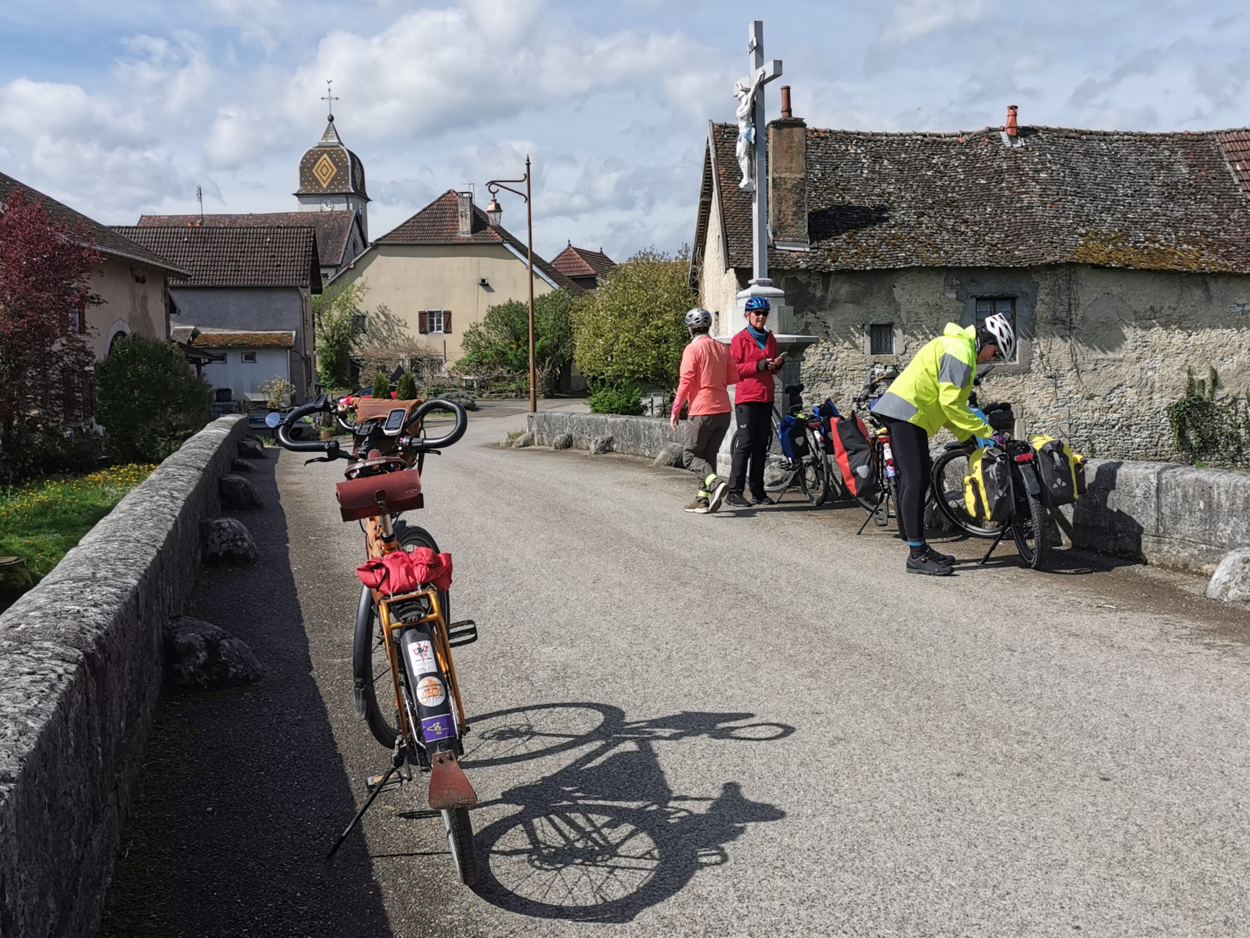 Die Schweiz verabschiedet uns nach eintägigem Gastspiel mit einem kleinen Anstieg, dann geht es wellig durch die ersten Kilometer Frankreich, die Kaffeepause überrascht mit einer kleinen Kapelle aus dem 10. Jahrhundert und dann rollt es am Rhein-Rhône-Kanal entlang nach Montbéliard, den alten Württembergern (zwei T und ein M, wer denkt sich sowas aus!) auch als Mömpelgard bekannt. Das Picknick am Kanal bei wunderbarem Frühlingswetter steigert die ohnehin gute Laune zusätzlich.