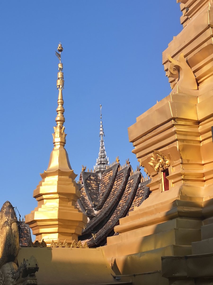 Mit angenehmer Schärfe im Mund radeln wir die letzten zwei Kilometer, checken in unserem Dai-Dorf-Haus 2.0 (traditionelle Holzverkleidung auf Betonstruktur) ein und gehen dann Neujahr feiern. Wie die lokale Dai-Ethnie jeden Tag, für eine Scharr jubelnder chinesischer Touristen. Ein paar ältere Damen tanzen mit und lassen sich mit Wasser bespritzen. Ein paar erfrischende Tropfen bekommen auch wie ab und dann steht noch der Manchuman-Tempel auf dem Programm. Wie immer wunderbar pitoresk und fotogen, aber leider kein Ort der Andacht mehr.