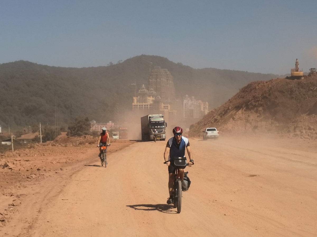 Schließlich satteln wir auf und radeln direkt in die Grenzapokalype. Es wird gebaut: Ein Spielkasino, dessen Vorbild wohl im von Größenwahn geplagten Las Vegas steht. Die Eisenbahnstrecke Kunming – Vientiane, samt Bahnhof. Logistikzentren, Wohnhäuser, Hotels. Und das in einer Größenordnung und mit einem Aufwand, wie es nur die Chinesen hinbekommen.