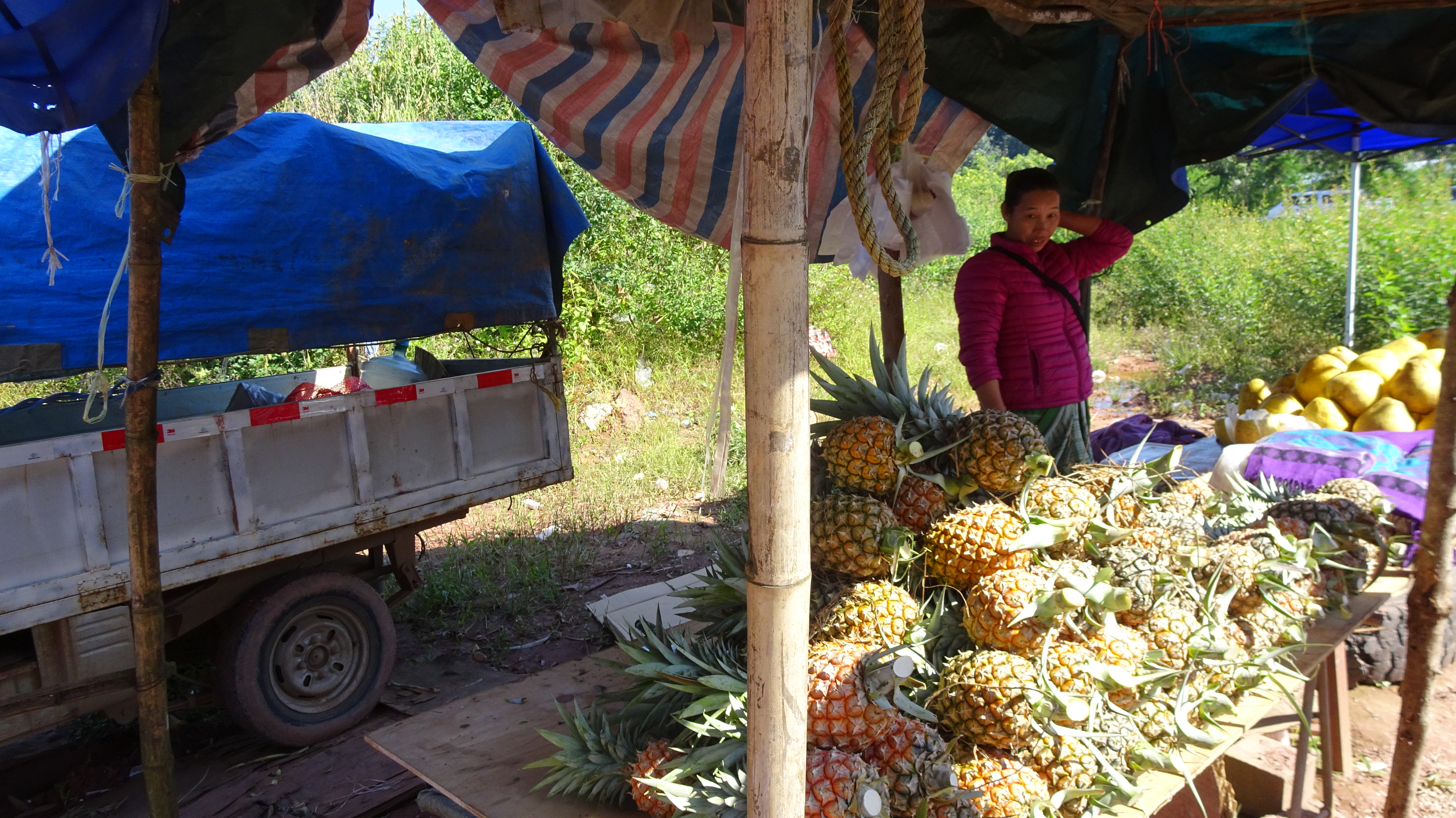 Nun, liebe Karin, heute kaum Dreck, das einzige, was Dir fruchtig-spritzig entgegenspringen könnte, wäre eine unglaublich frische und leckere Ananas. Die kleine Passhöhe des heutigen Tages wurde zwar in den fünf Jahren, die ich nicht mehr auf dieser Strecke war, verbreitert, aber den Ananasstand gibt es immer noch. Genauer gesagt, einen Ananasstand, und da köpfen wir dann gleich zwei Früchte.