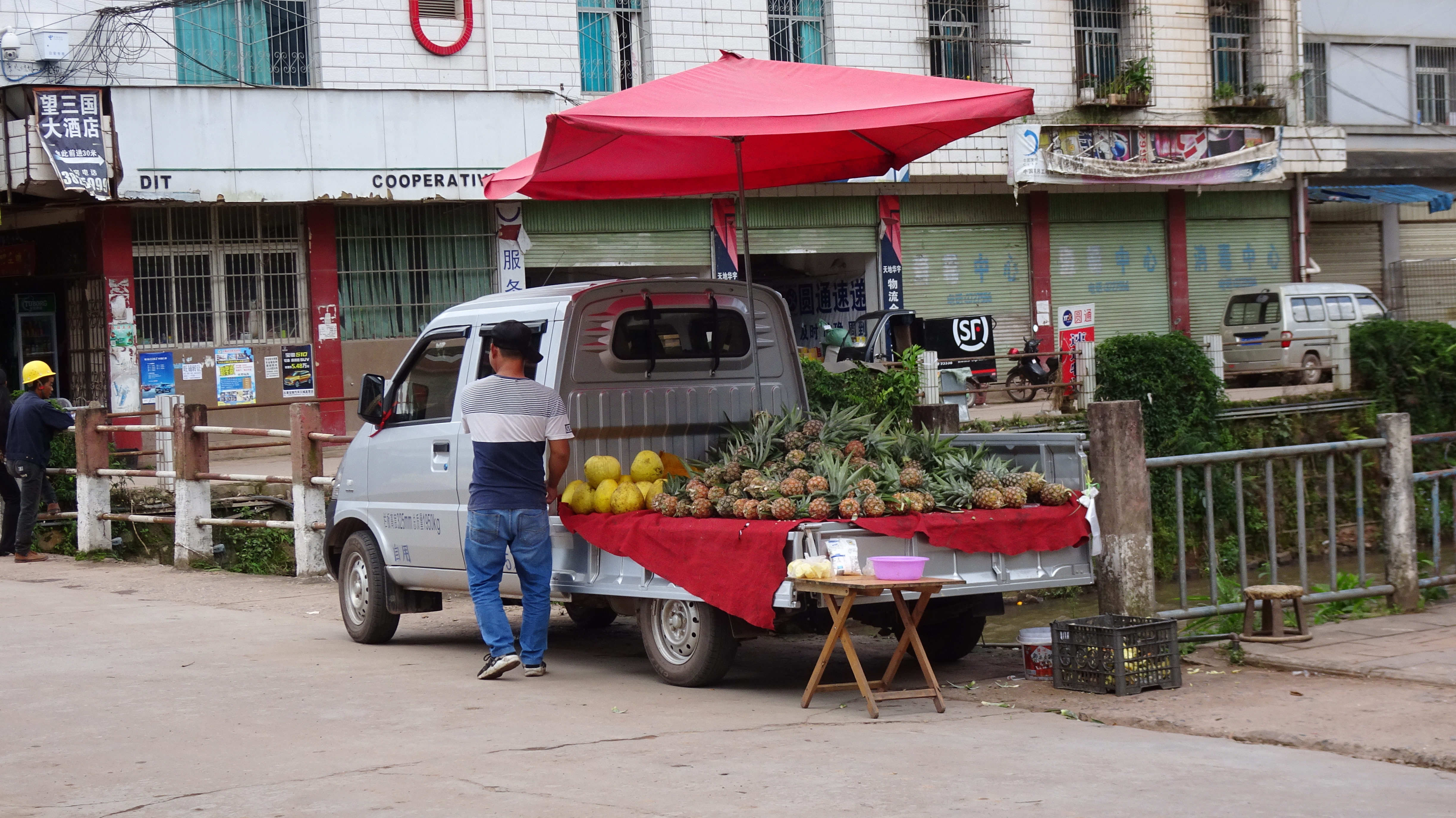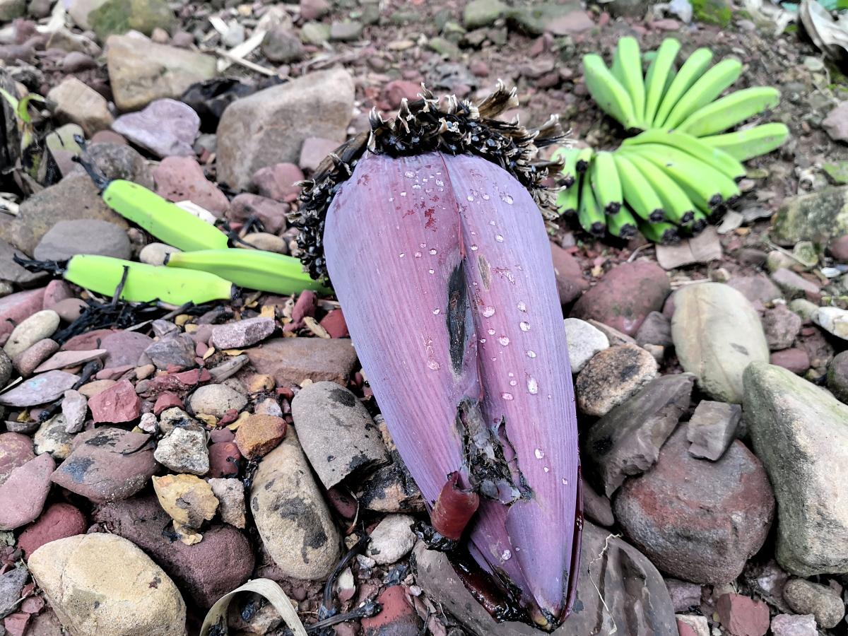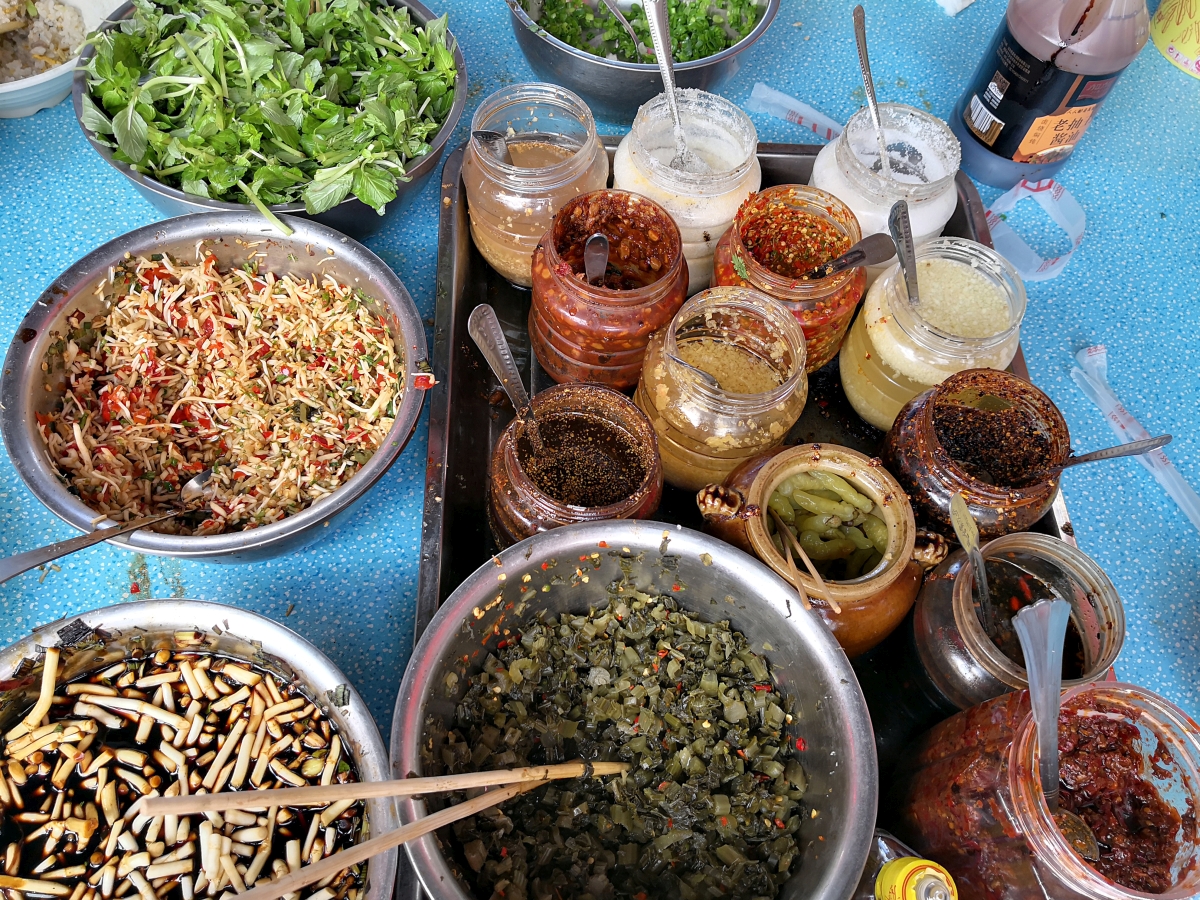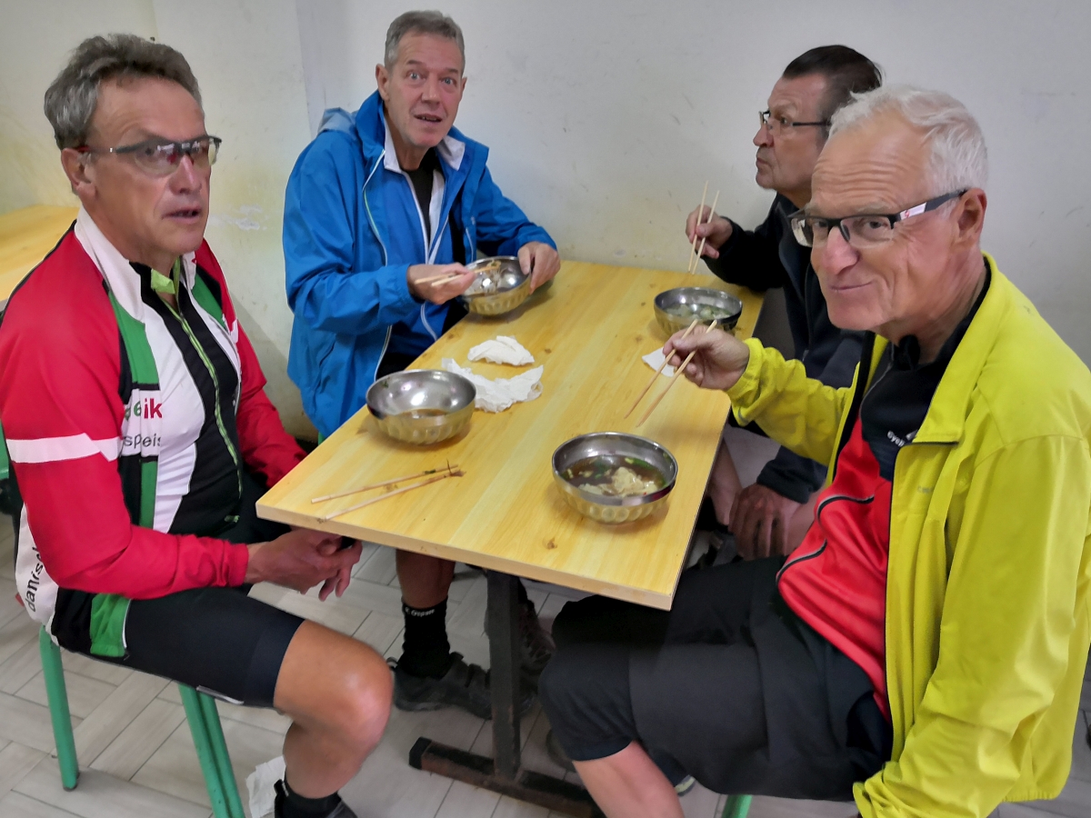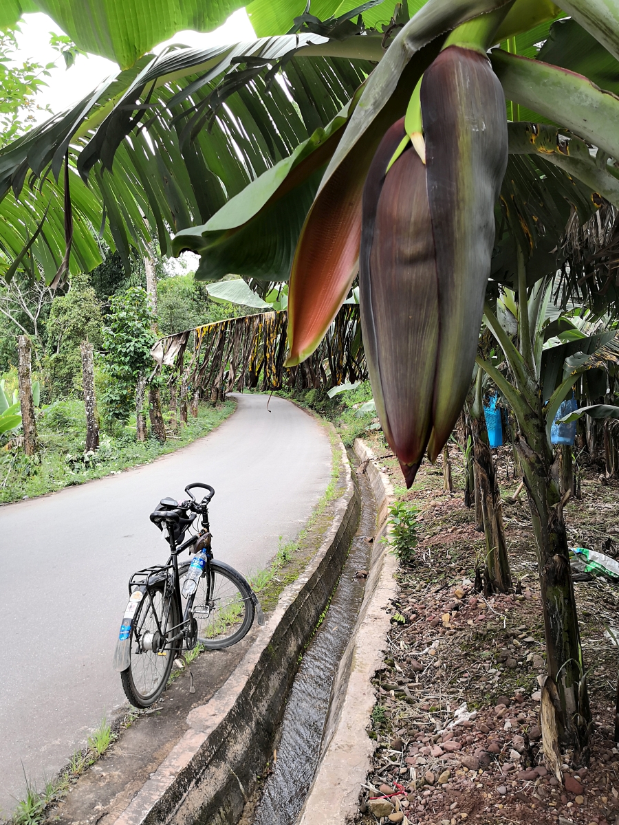 Später dann machten wir uns mit Transporthilfe eines örtlichen Minibusfahrers auf den Weg in den nächstgelegenen Ort, wo ich ein für einige etwas schmerzhaftes (da ziemlich chililastiges) Essen bestellt hatte. Meiner Meinung nach köstlich, aber ab Morgen dann wieder etwas mund- und verdauungsfreundlicher! Unser interessantes Gericht heute wohl das Innere des Bananenbaumstammes. Morgen geht es dann wohl auskuriert auf den Weg nach Lüchun. Hoffentlich regenfrei!