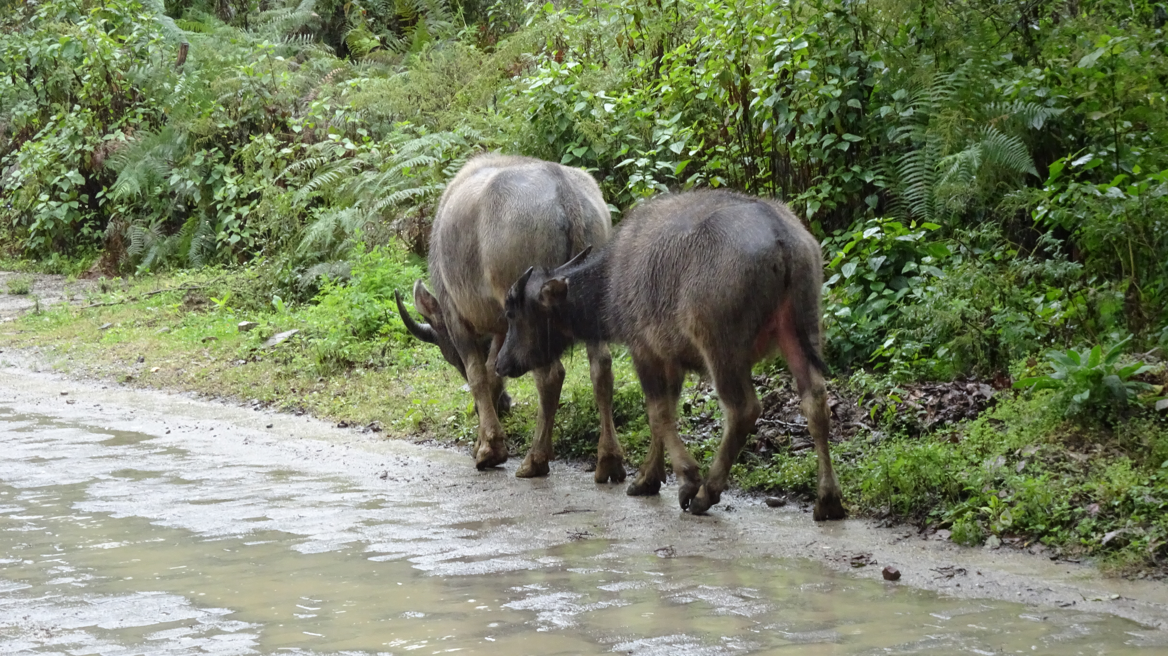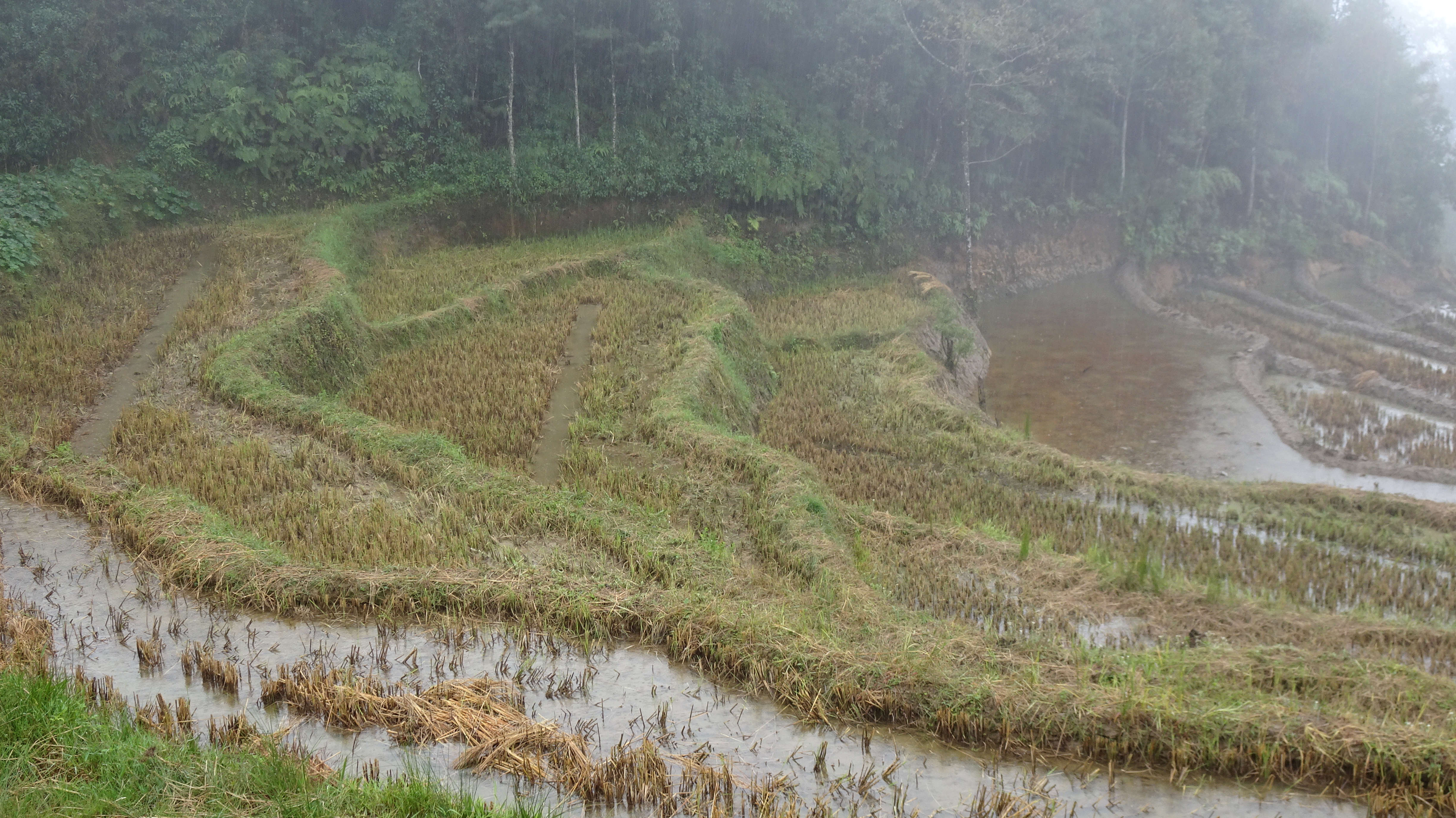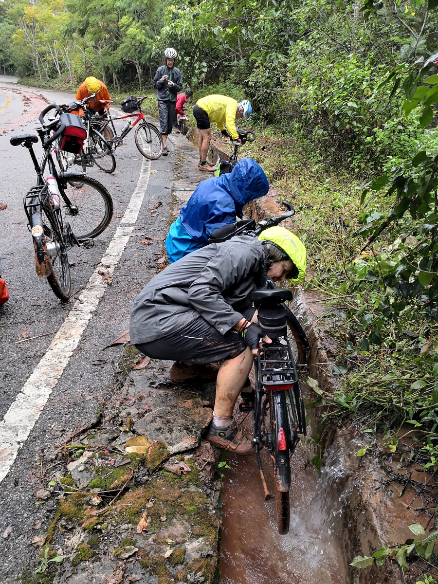 Einer jedoch scheute weder Regen, noch Huppel, rutschigen Boden oder sonstige Gefahren: Reinold machte sich heute trotz aller Widrigkeiten zu einem Spaziergang bis in die untersten Hänge der Reisterrassen auf. Ihn trafen wir auf der Hälfte unseres Weges. Mitnehmen lassen wollte er sich aber nicht; er genoss es, sich nach all den Radkilometern auch einmal einfach nur die Beine zu vertreten.