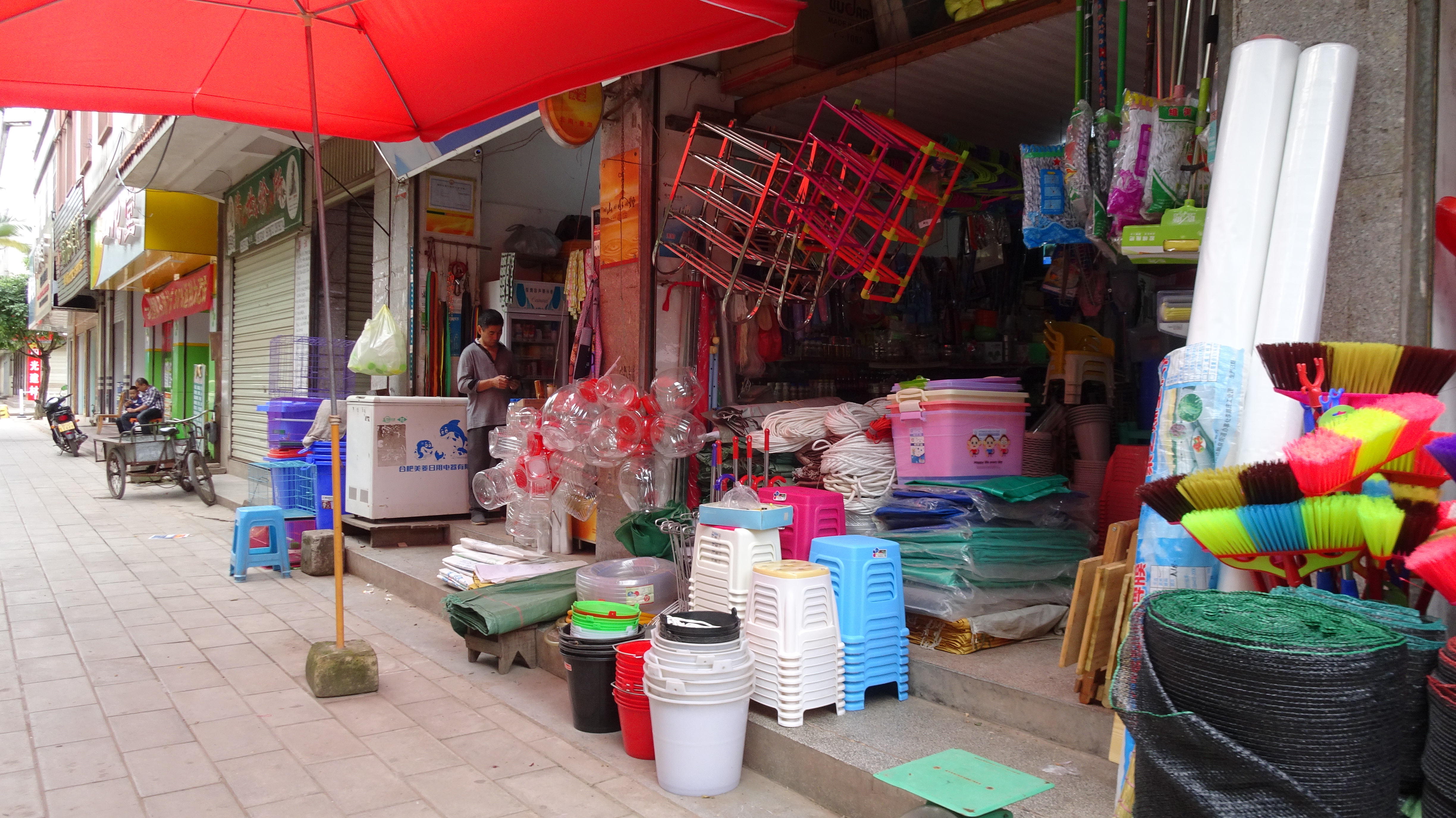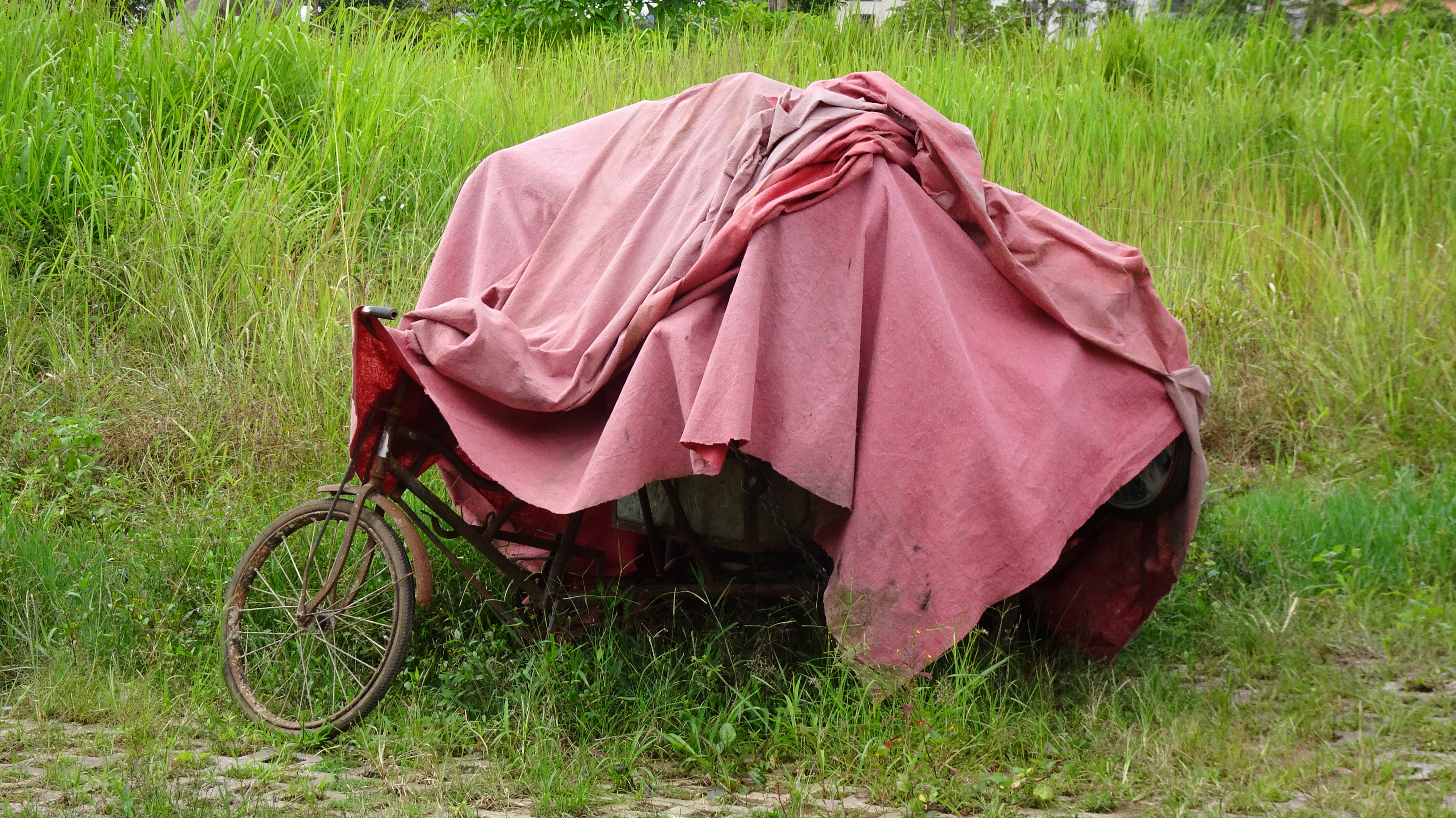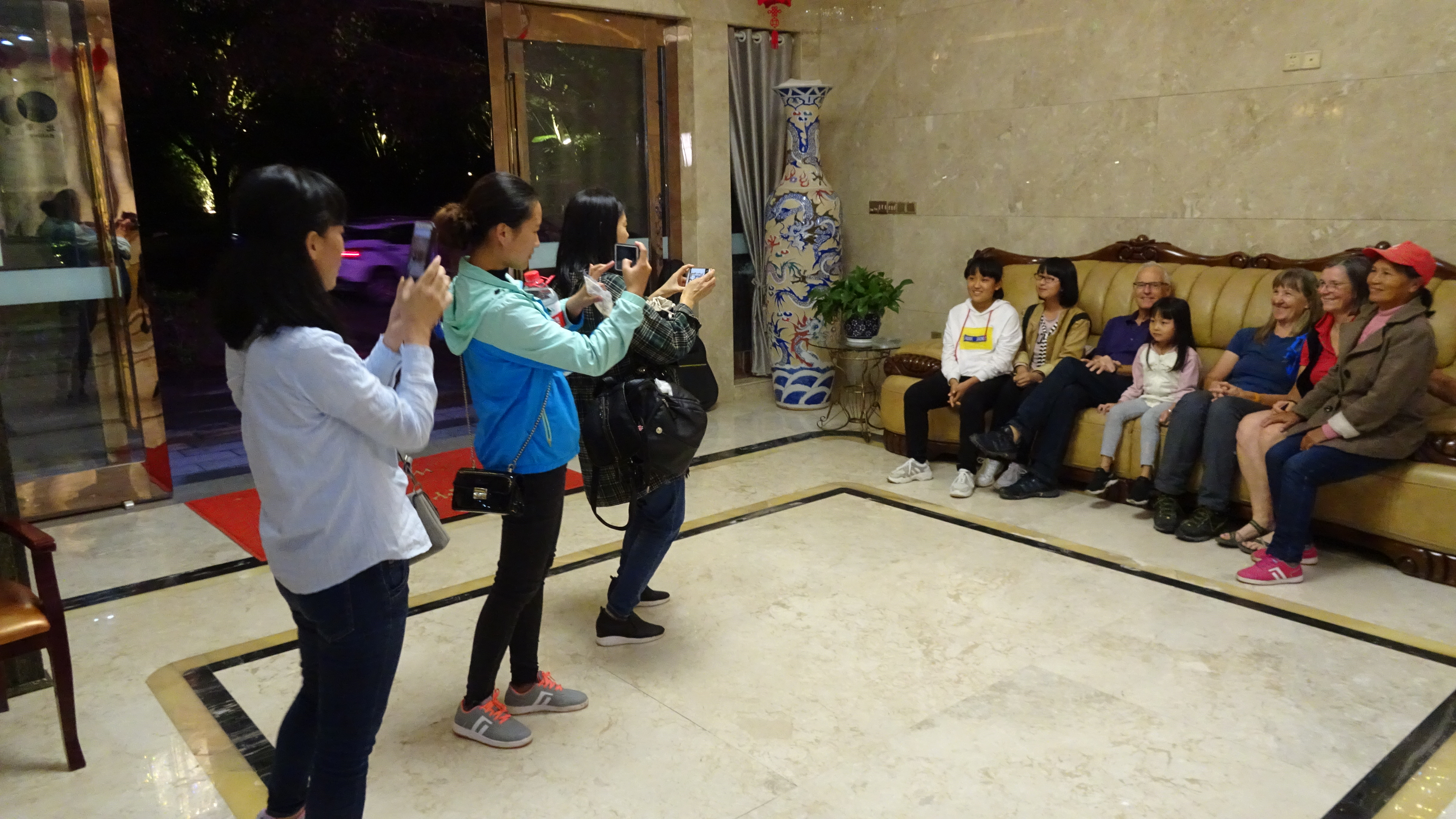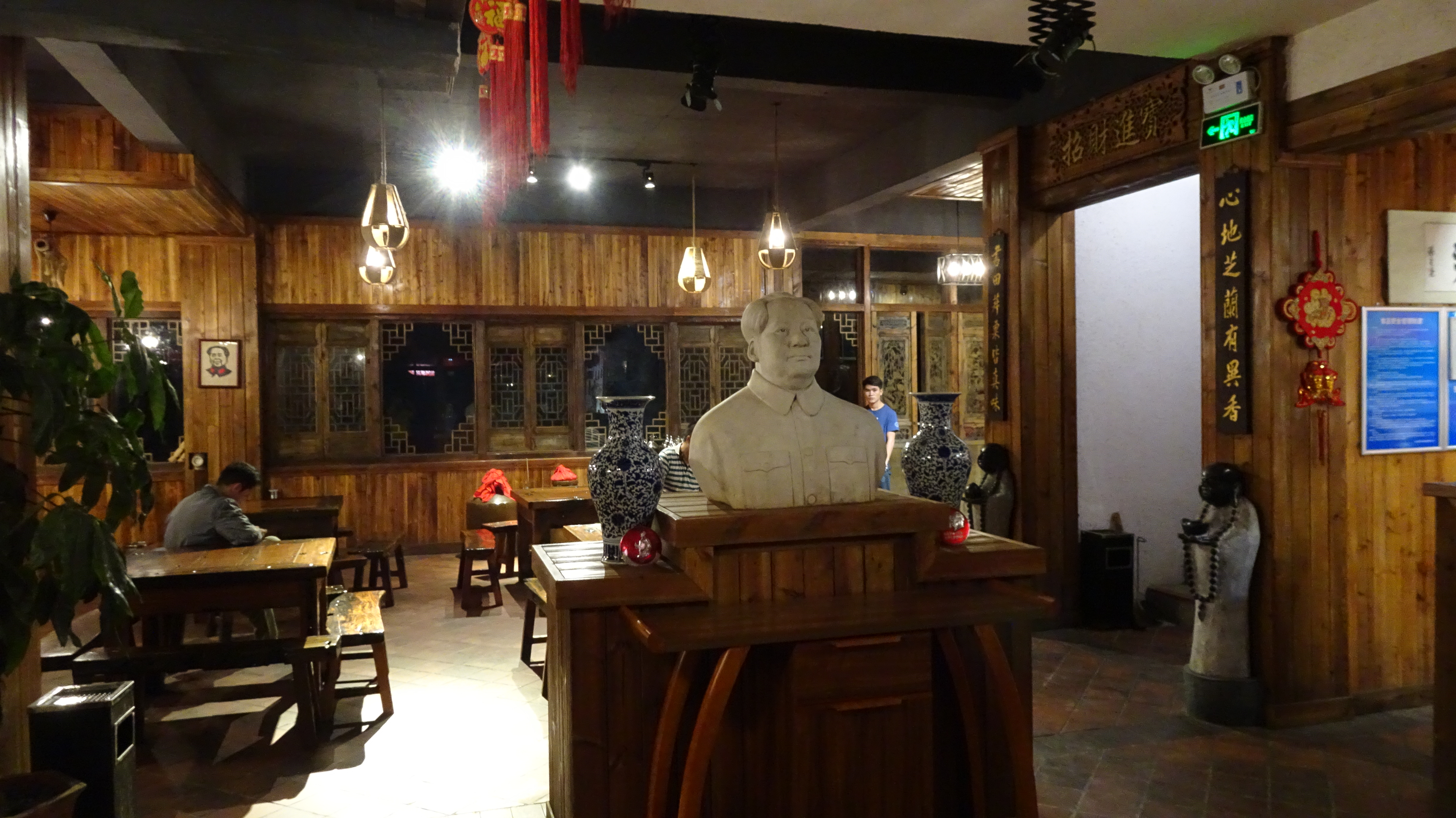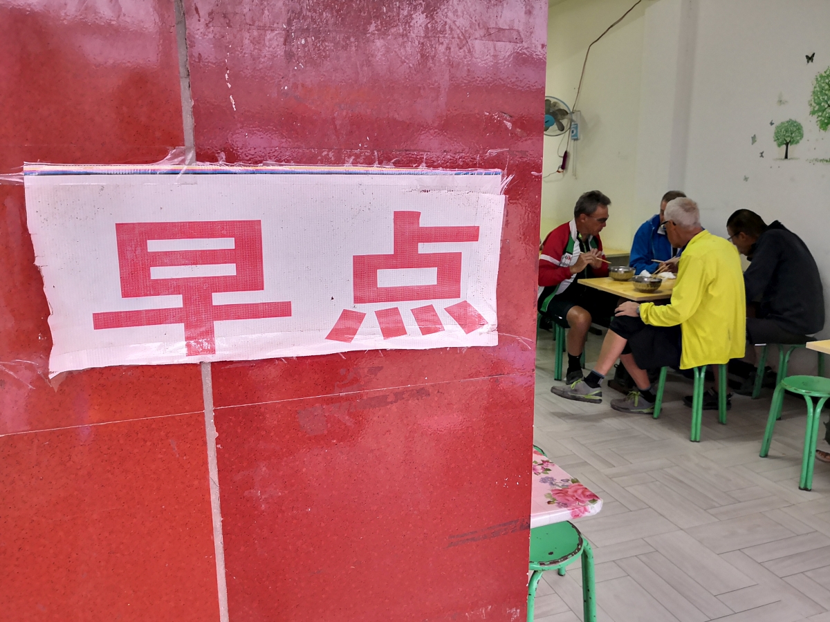Erwacht vom Plätschern und Scheppern des starken Regens war eigentlich schon morgens klar, dass auch dieser Tag ein nasser werden würde. Dementsprechend wurde selbst unsere kleine, auf den späten Vormittag gelegte „Privattour“ für Peter und Hans, die am ersten Tag nicht mitkommen konnten, in der Hoffnung auf nachlassenden Wolkenguss um zwei Stunden verschoben. Der Himmel aber blieb uns ungnädig und so entschieden wir uns dafür, Xiao Leis Angebot, den kleinen Trip im Auto zu fahren, dankend anzunehmen und ließen uns im kalten Nass brummend übers Huppelpflaster fahren. (Man erinnere sich: Dasselbe Huppelpflaster, das Ingemarie und co. auf dem Fahrrad bis in die Haarwurzeln durchdrang! „Je weiter wir kommen, umso weniger bereue ich, diese Strecke nicht mit dem Fahrrad gefahren zu sein“, kommentierte Peter ganz passend.)