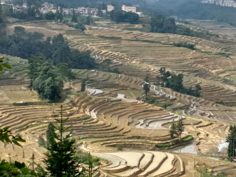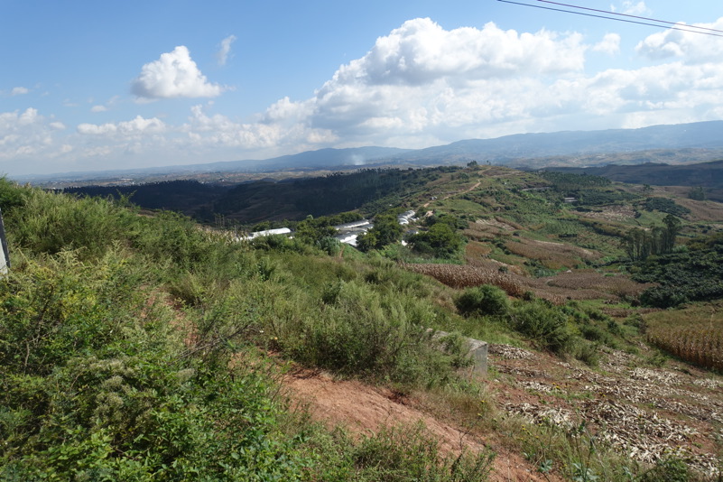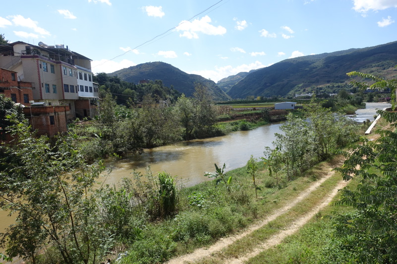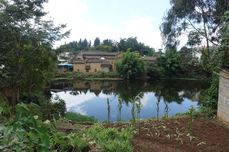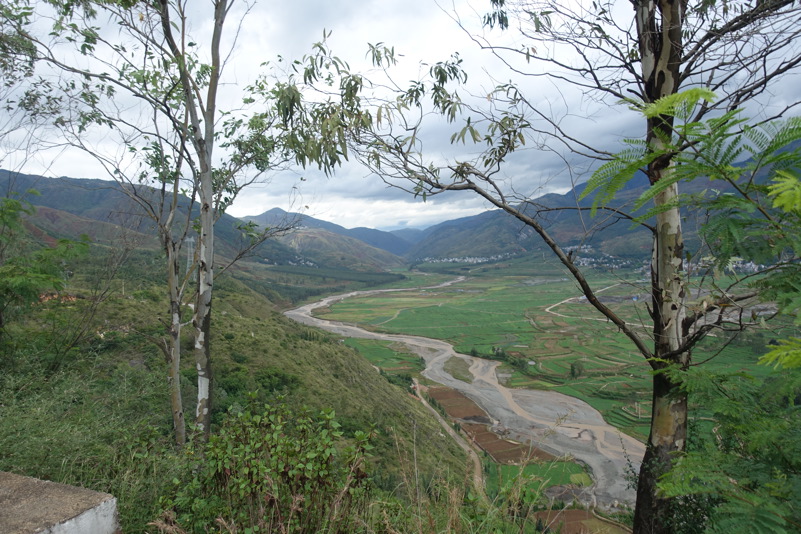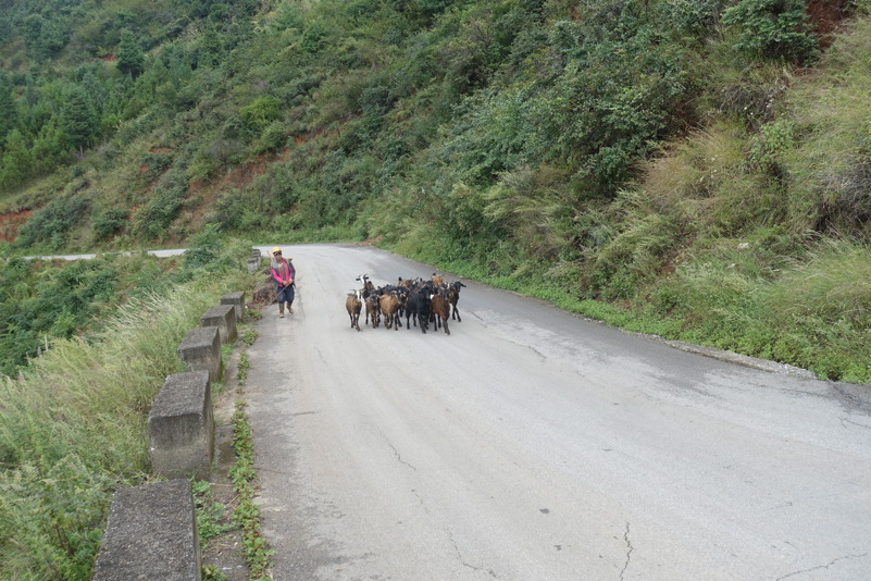 500 m schräg gegenüber in der LVANG LU (= Grüne Straße, beschriftet in der Sprache der Yi sowie in chinesisch, erfahre ich von Isabelle) sei der Eingang zur „Stone Forest Scenic Area“, so die Auskunft der Insiderinnen an der Hotelrezeption. Im Prinzip ja, aber hinter dem Zaun und das Tor daneben, erklärt ein aufmerksamer Mann in Uniform, dürfen wir nicht passieren.