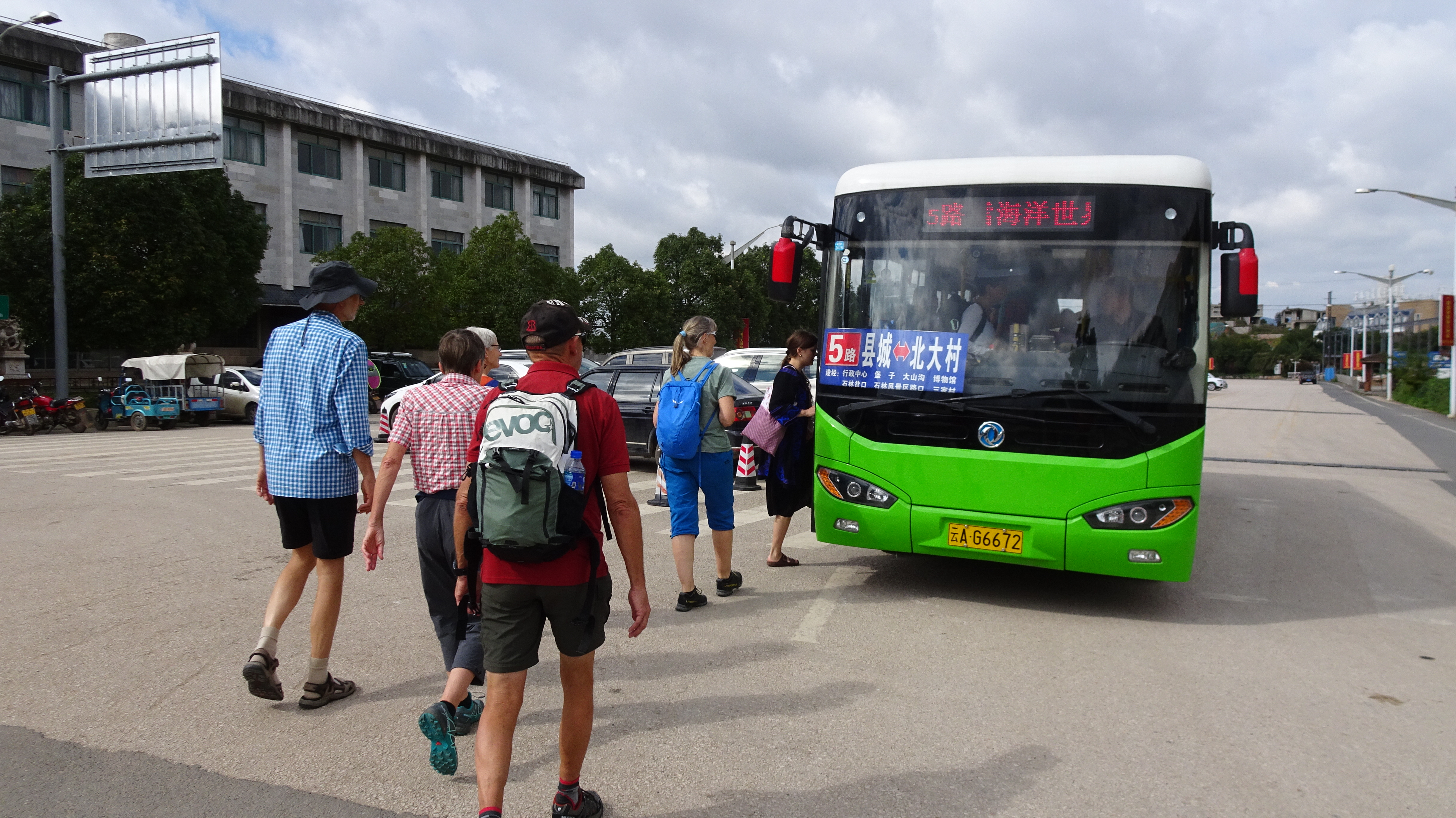 Die Rettung naht alle 15 Minuten auf 4 Rädern: Der Linienbus für 2 Yuan pro Langnase. Keine 10 Minuten Fahrzeit.