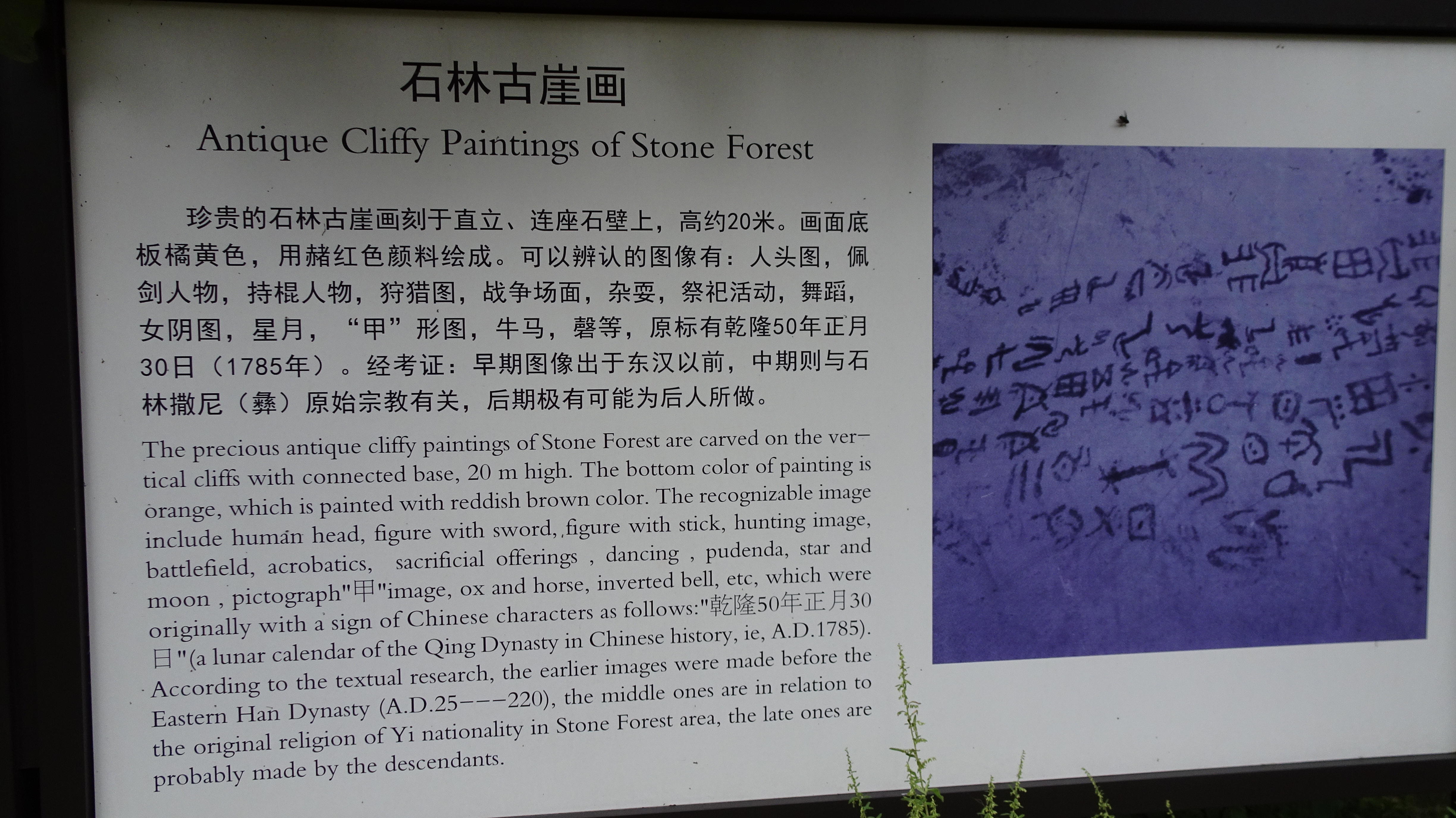 Meinereiner schafft in 4 Stunden (ca. 14 km und nur 155 Höhenmeter 😉 ) große Teile des „Minor-“ und des „Major Stone Forest“, der „Bushao Mountain Scenic Area“ sowie der „Liziyuanqing Scenic Area“ und ich tappe zwischendurch den Weg und die Treppen durch große und kleine Spalten im dichten Steinwaldgestrüpp entlang, auf den der Weiser Richtung „Antique Cliffy Painting“ zeigt (siehe extra-Bilderbuch dazu).
