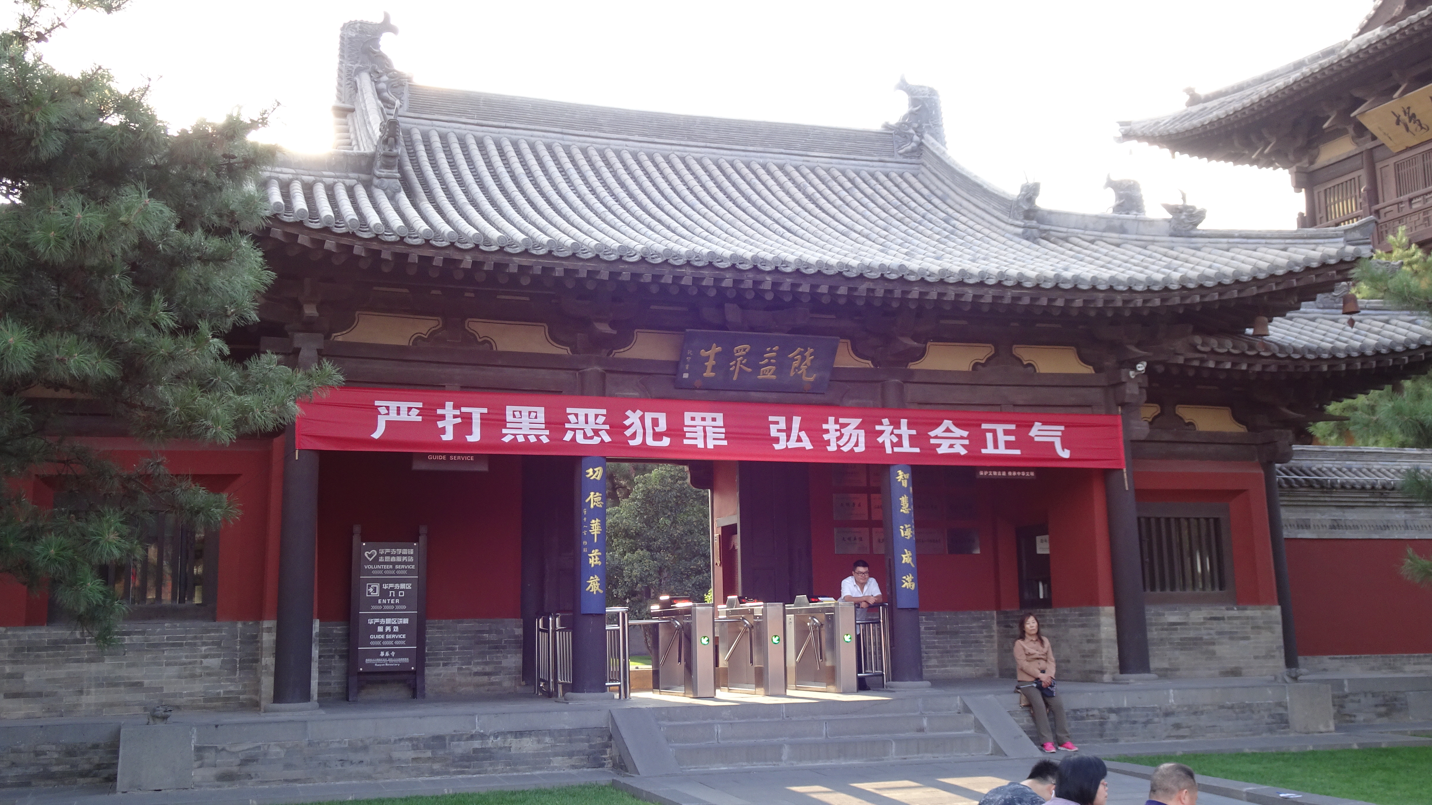 Der Tayuan Si ist etwa 4 km vom Hotel entfernt und wir zwängten uns zu acht in ein kleines Bus-„Taxi“ mit 6 Sitzplätzen. Der umtriebige Fahrer achtete aber darauf, 8 x je 5 Yuan Fahrgeld zu kassieren (der Linienbus kostet nur 2 pro Nase …).