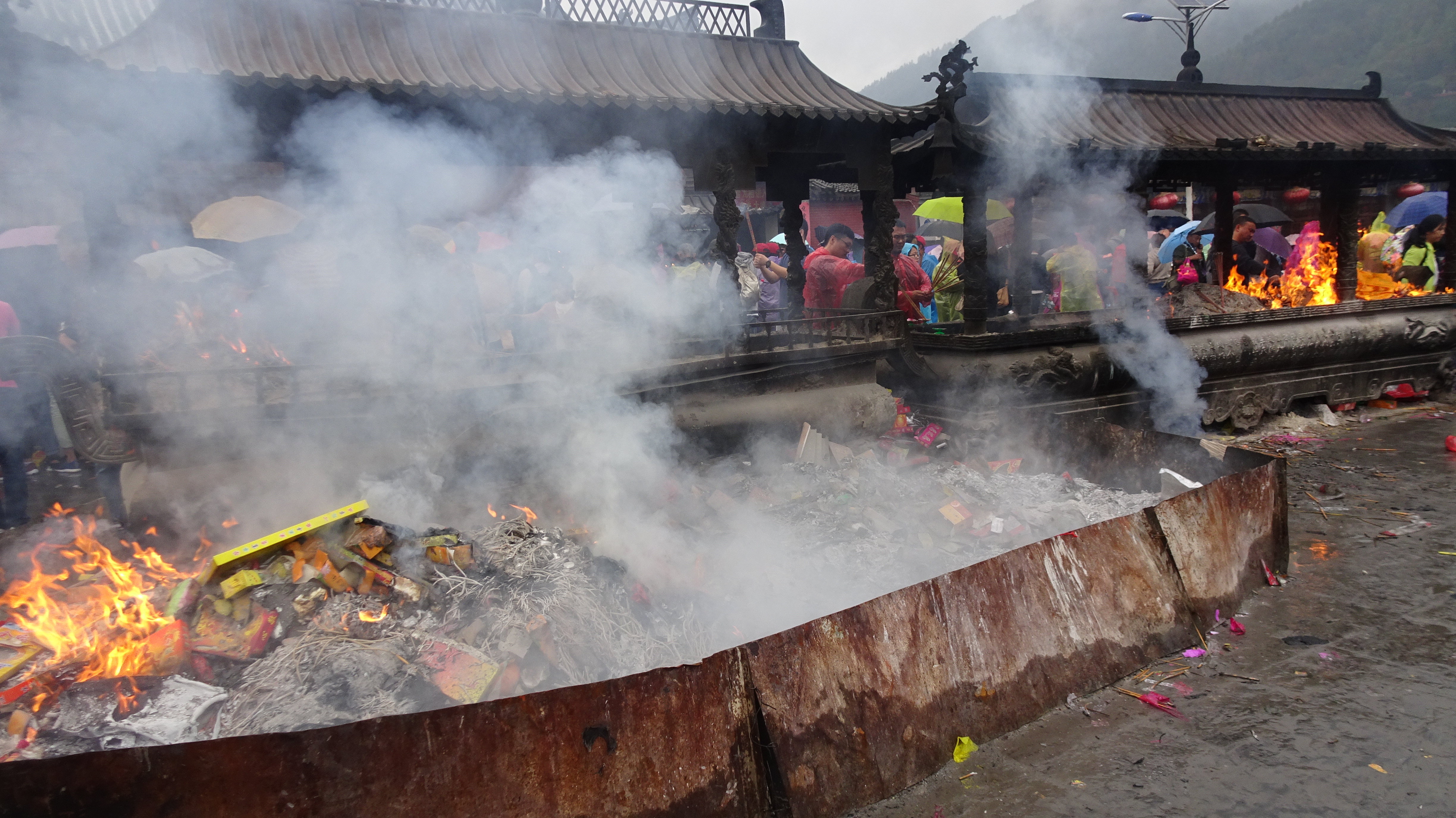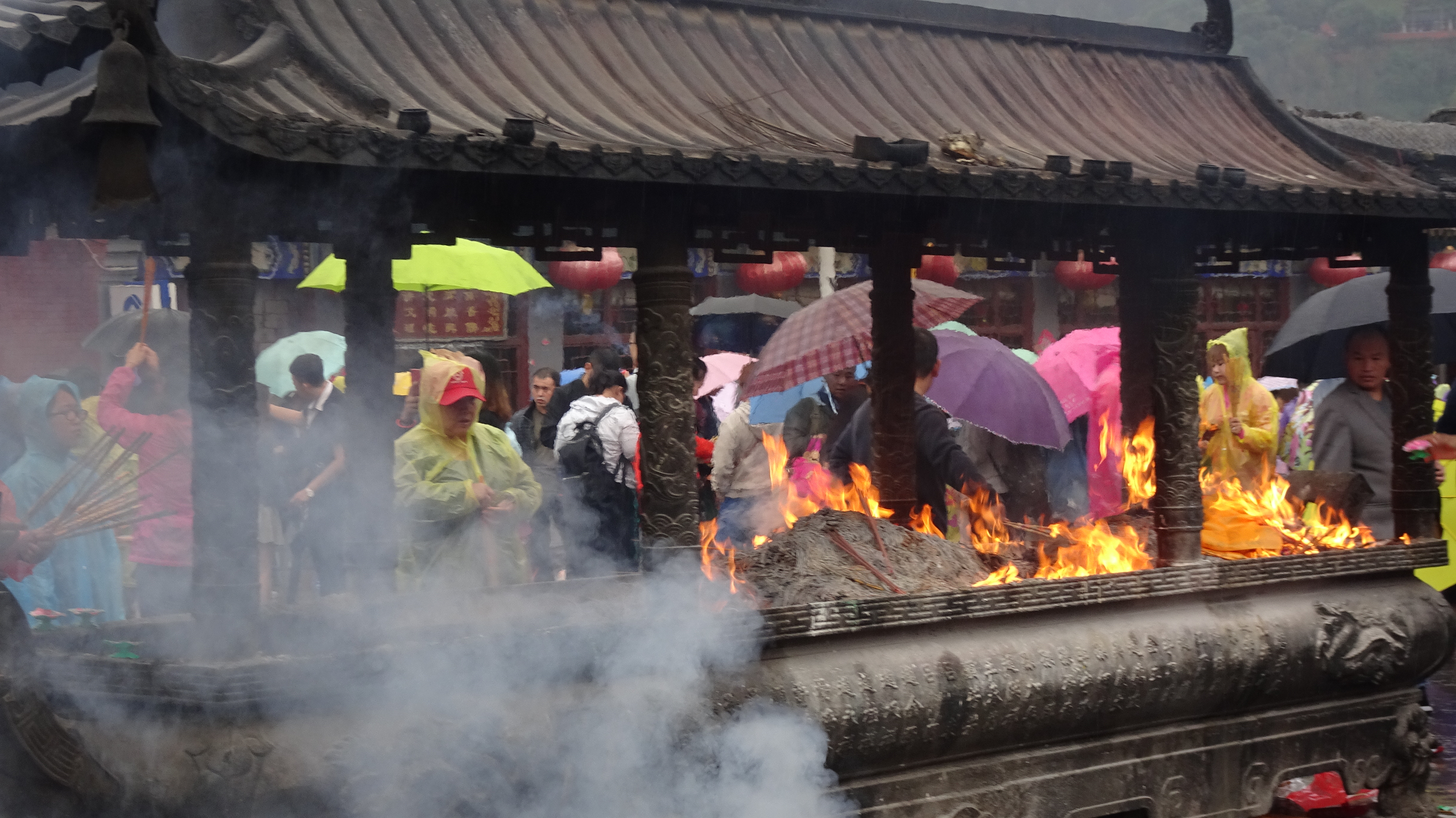 Geduldig wartend oder ungeduldig drängelnd verneigen sie sich dann vor den Tempeln und schicken ihre Bitten an die Götter. Einige halten dazu brennende Blumenkerzen oder gannze Bündel von Räucherstäbchen in den Händen.