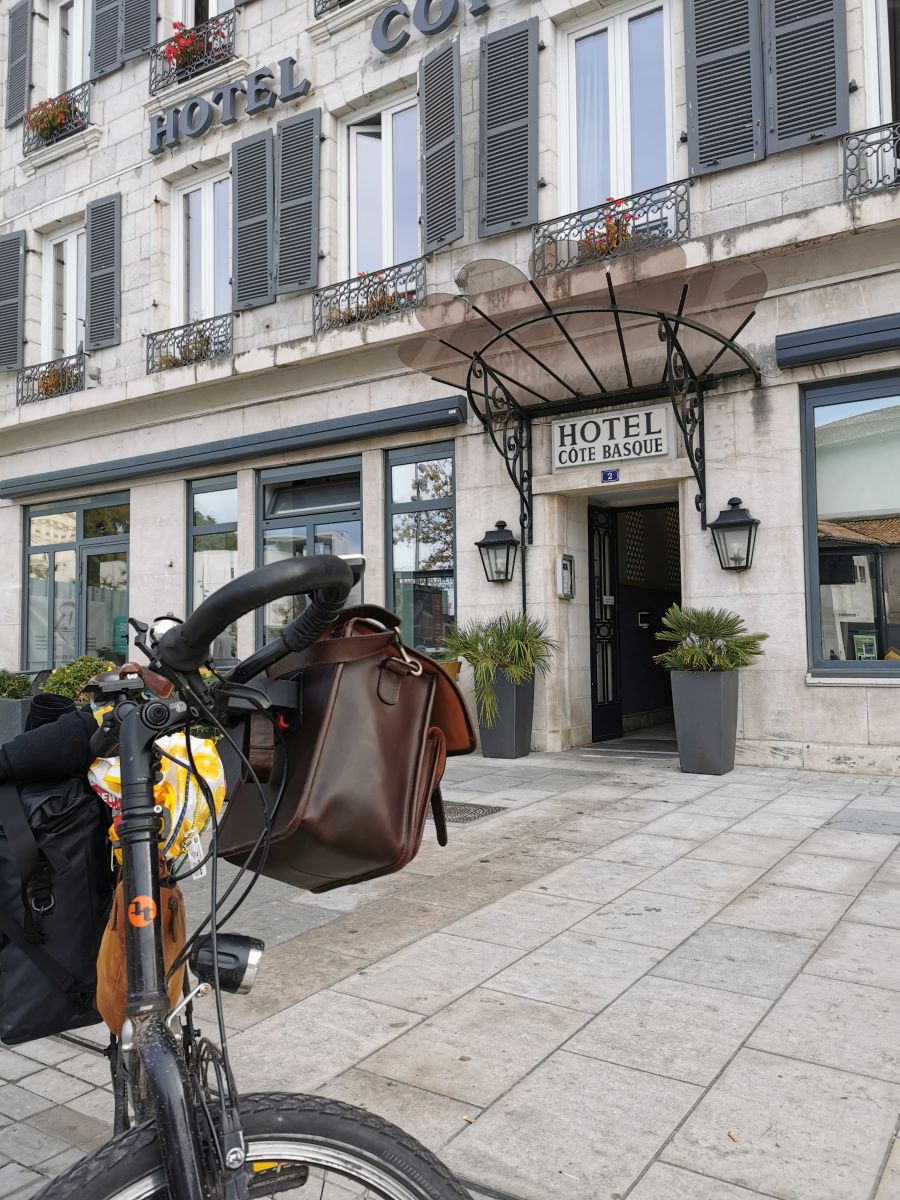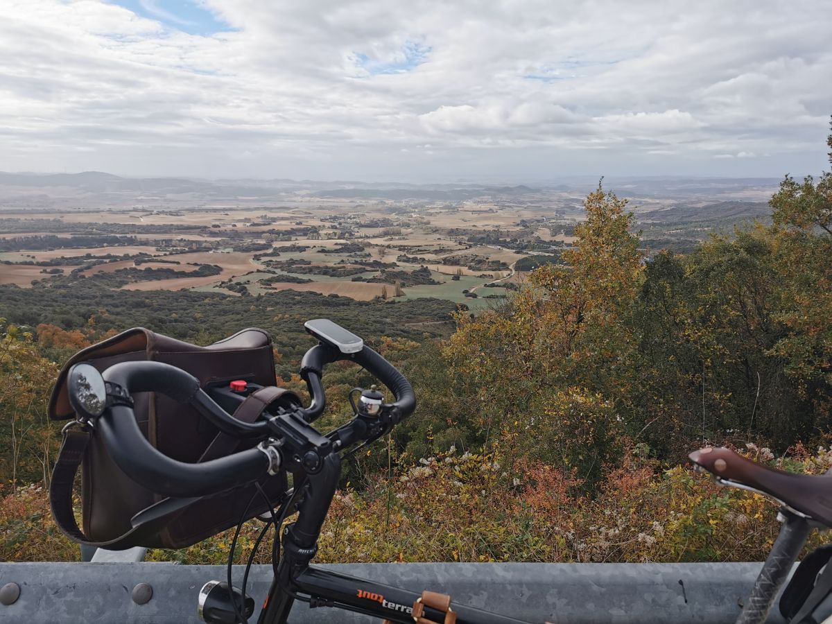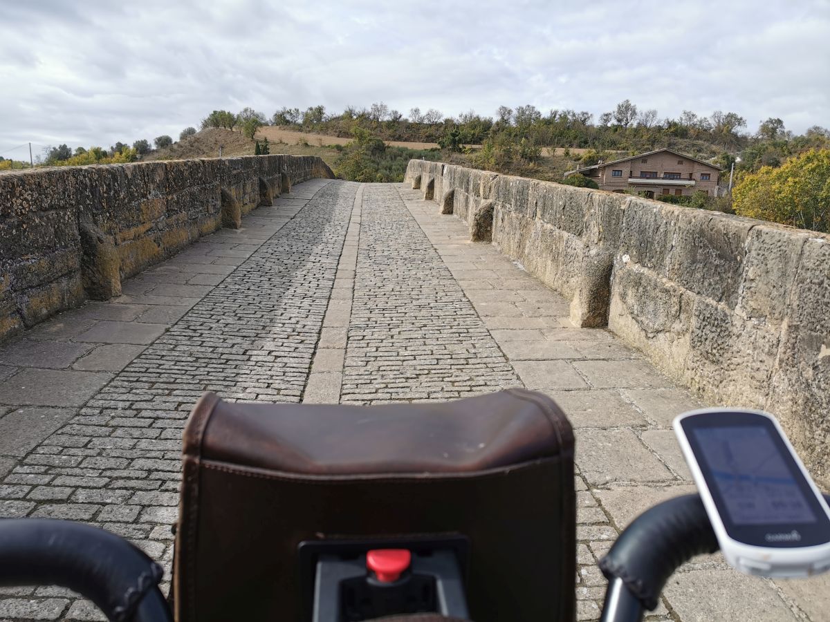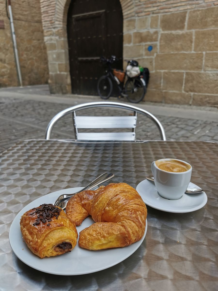 Für die folgenden Tage hatte ich mir Entschleunigung vorgenommen. Das passt auch ganz gut, weil der Wind weiterhin in Orkanstärke von vorne kommt und die beiden Tage immerhin knapp 1.400 Höhenmeter bereit halten (nach gut 1.200 HM am Vortag). So schleiche ich gemütlich vor mich hin, mache viele Pausen, gönne mir hier einen Café und da ein Croissant, fahre einige Stücke auf dem eigentlichen Jakobsweg, also dort, wo man eigentlich wandert. Gutes Feldwegniveau, und gut zu fahren. Meine Übernachtungsstation ist Santo Domingo de la Calzada, ein überraschend sympathisches Ort mit einer spannenden Kathedrale (googled mal „Hühnerwunder“!).