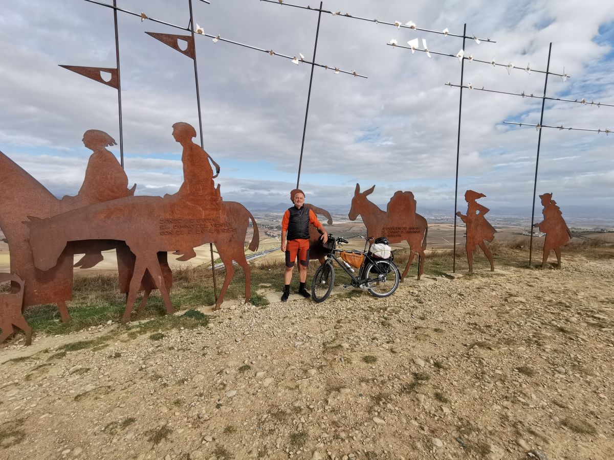 Wie auch immer: Gestern saß ich noch um 22 Uhr draußen, heute bläst mir nicht nur wieder ein starker Wind entgegen, es ist zudem noch kalt. Nein nicht wirklich, es wird schon so um die 12-15 Grad haben, fühlt sich aber durch den Wind nicht so an. Für die innerliche Wärme sorgt der Anstieg auf den Alto de Perdon und der Ausblick über die weite Landschaft. Und da steht ja noch diese berühmte Skulpturengruppe!