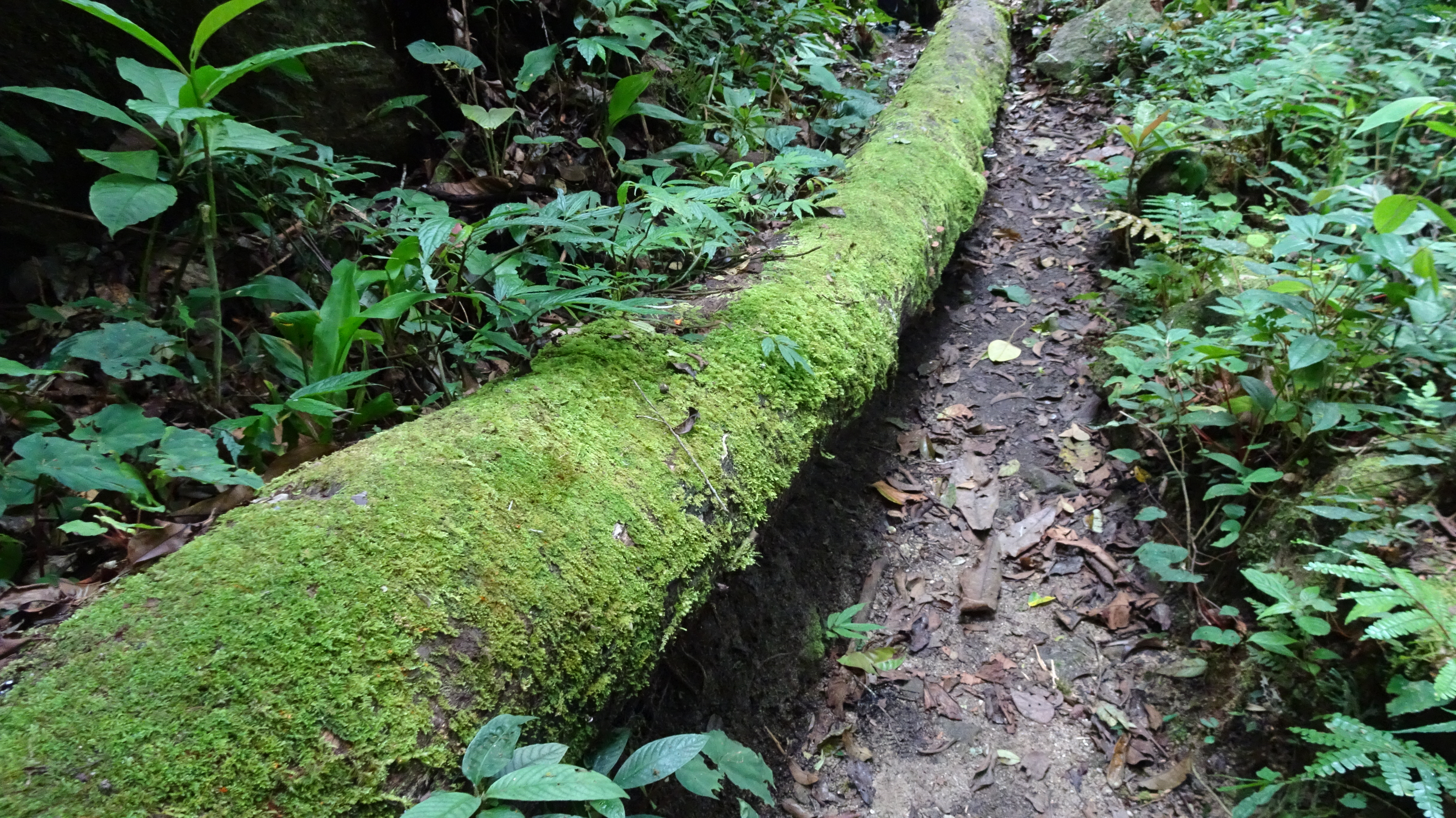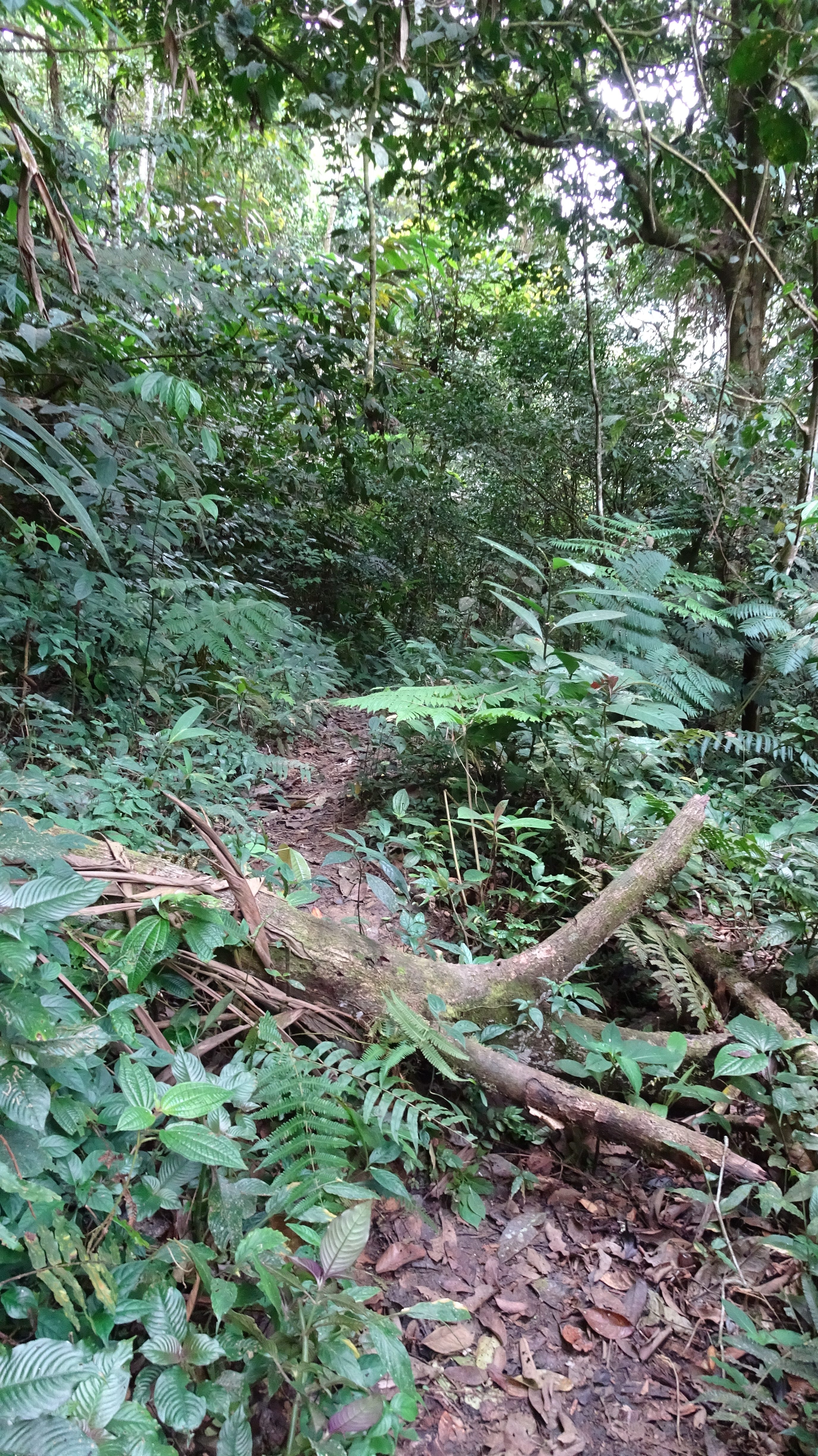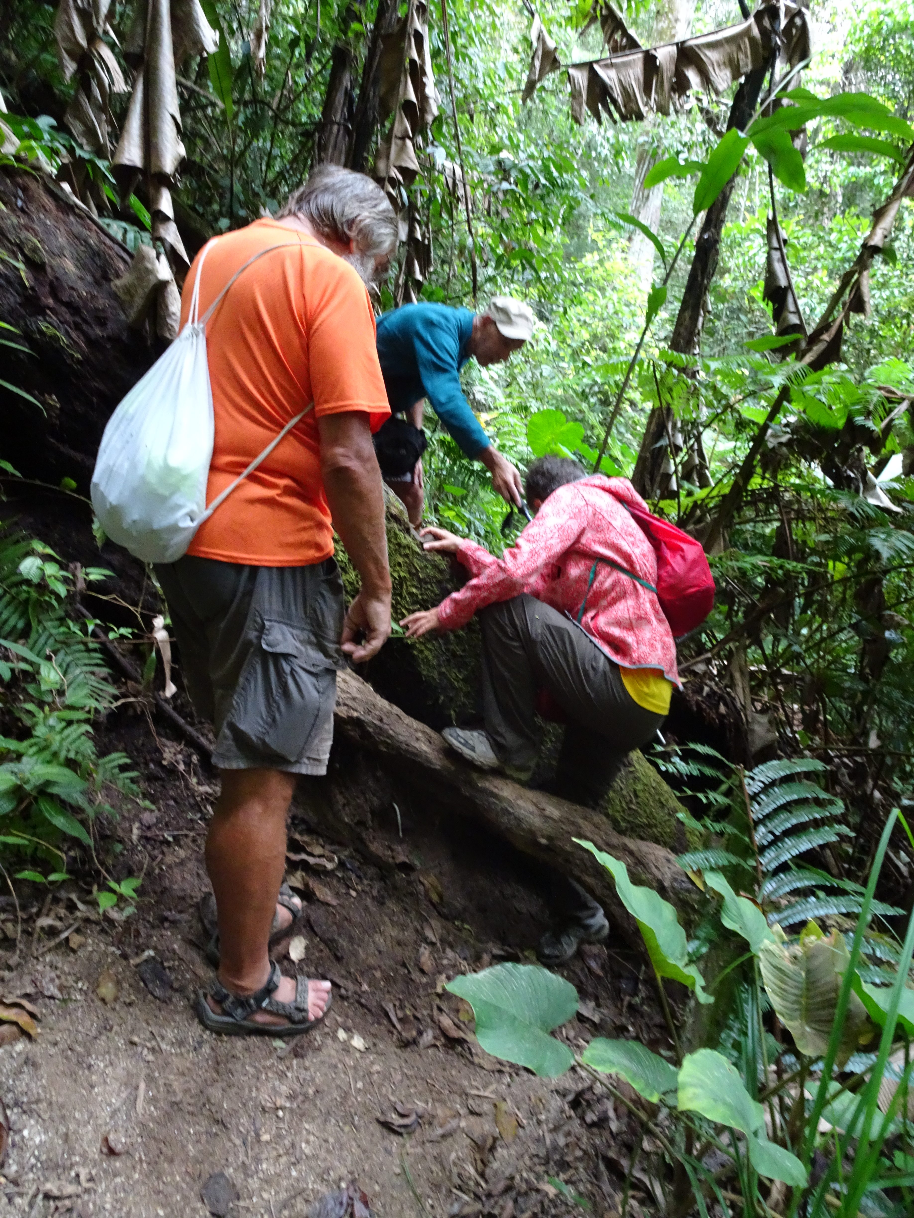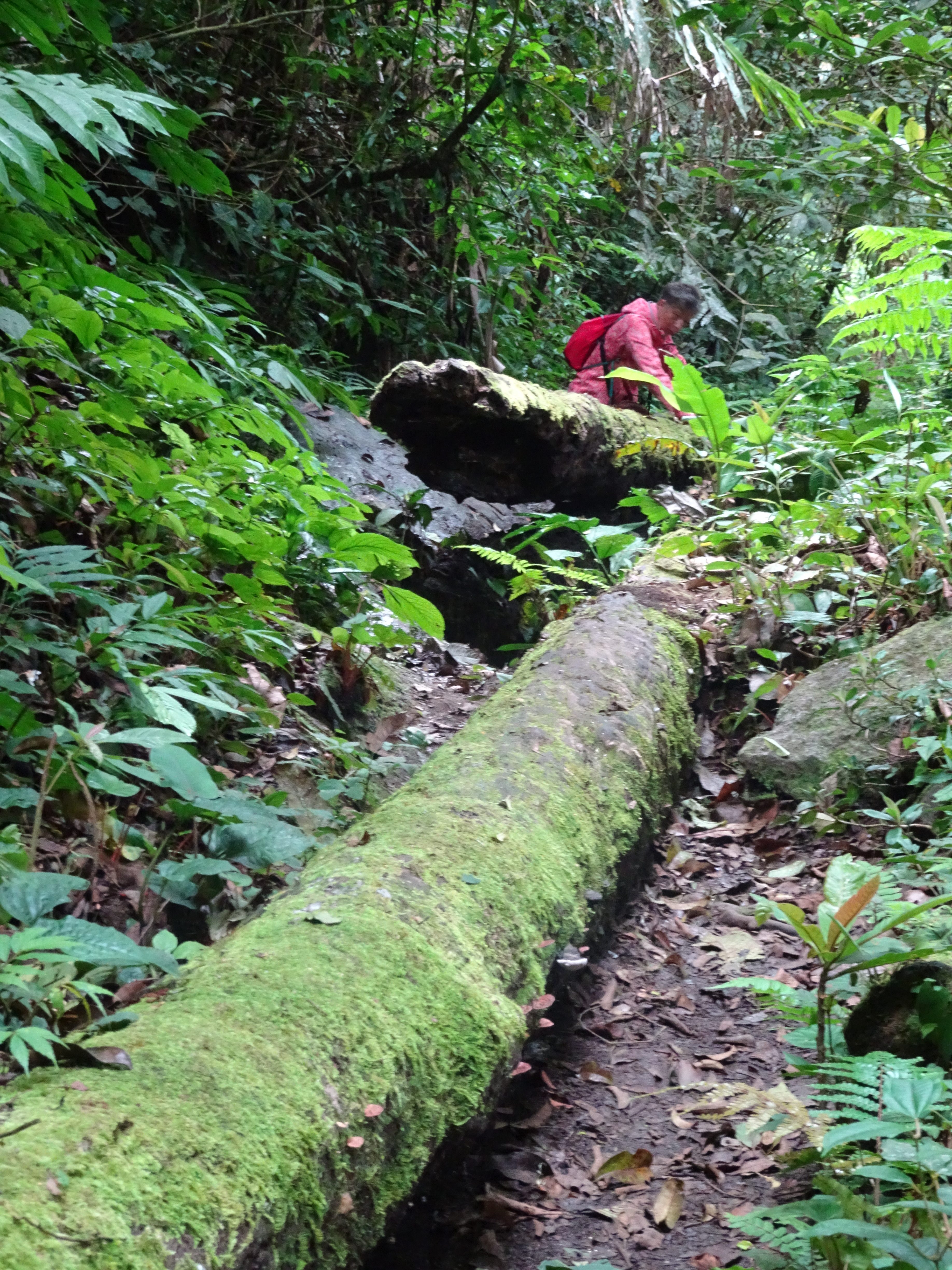 Einfach schön, auf dem schmalen Pfad durch den tropischen Wald zu wandern. Dabei sind zuweilen kleinere oder größere „Hindernisse“ zum Überklettern oder untendurchschlüpfen zu passieren. Wurzeln und Äste bieten ihre Hilfe an, wenn es mal steiler runter oder rauf geht.