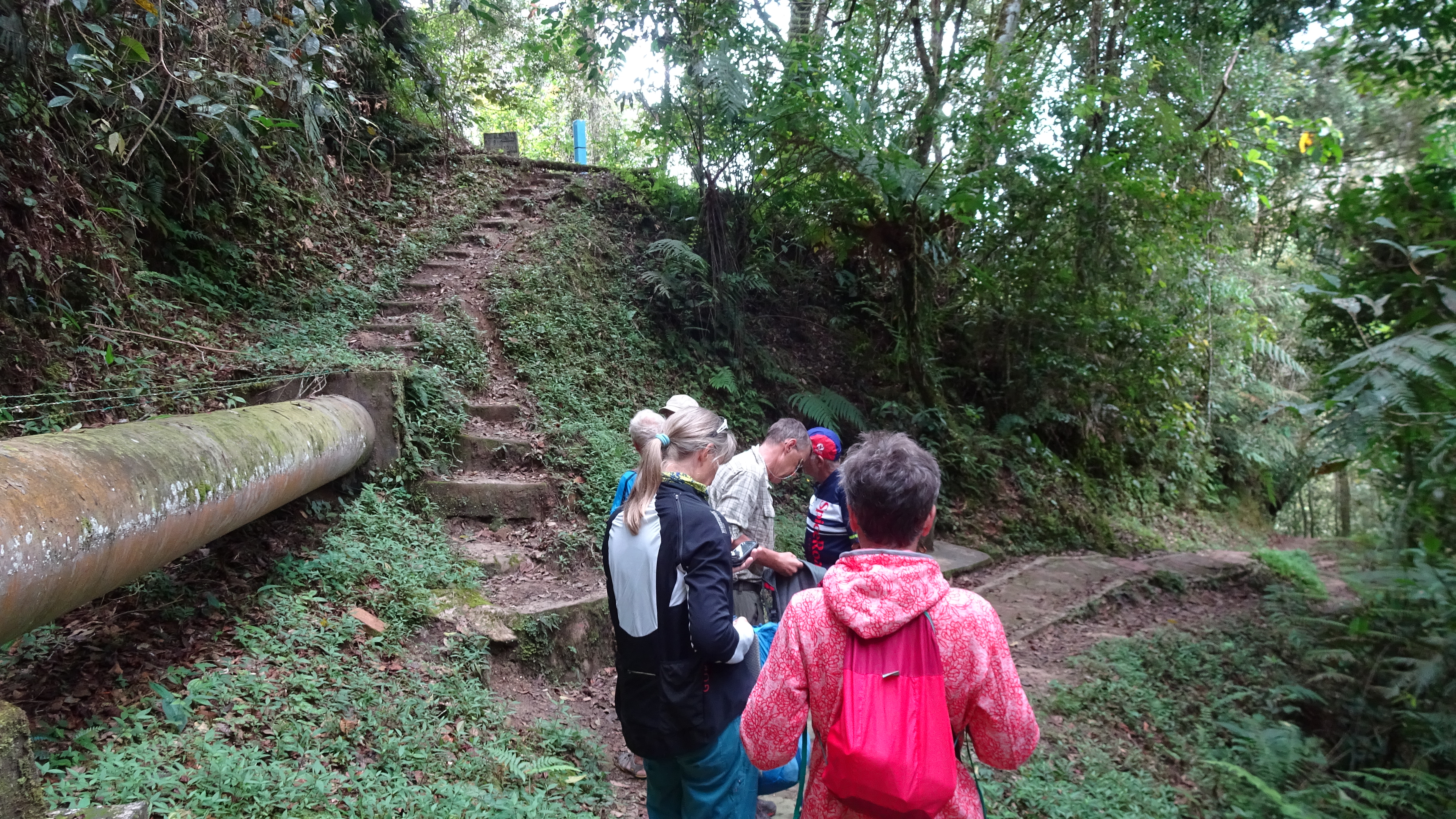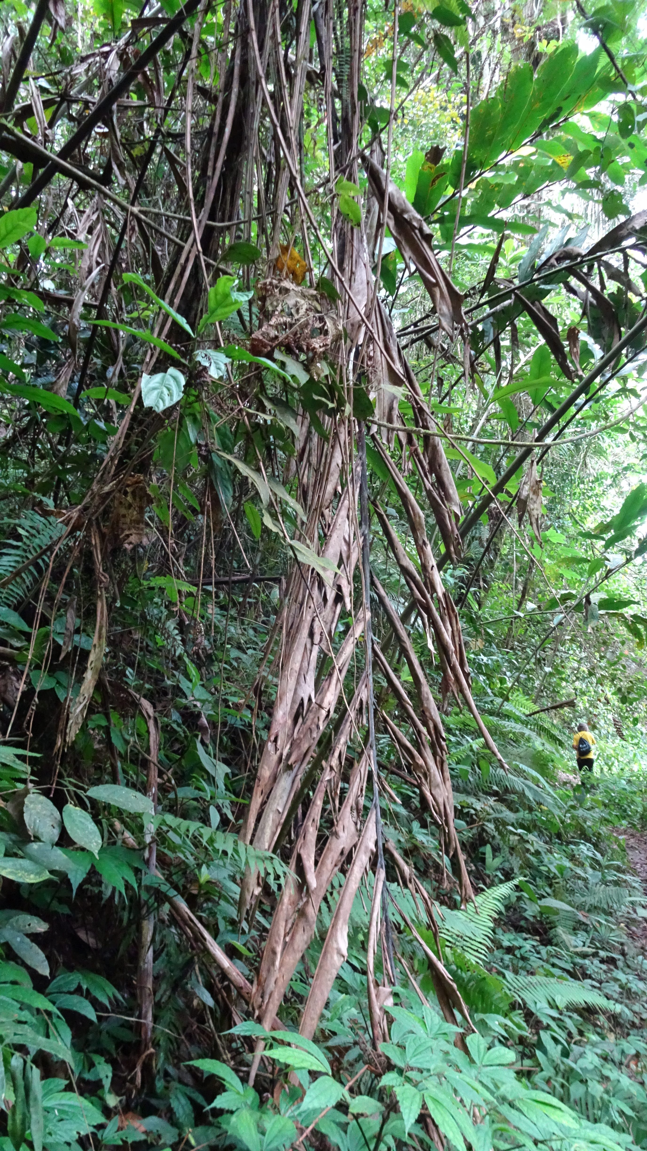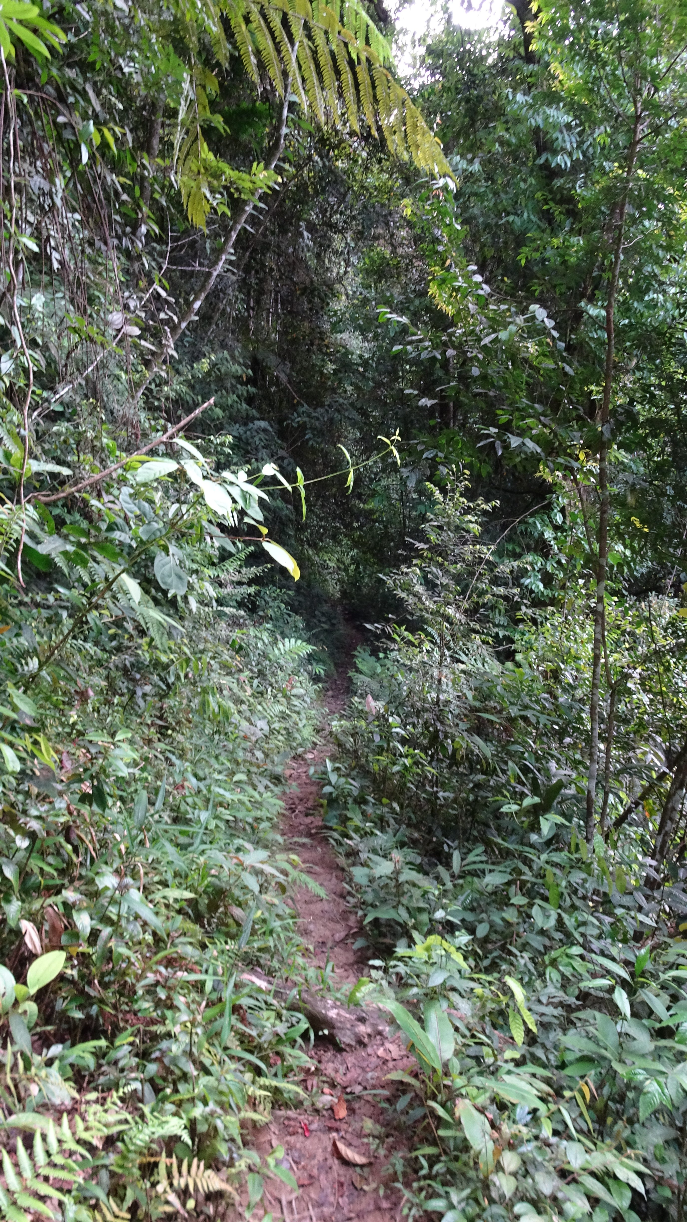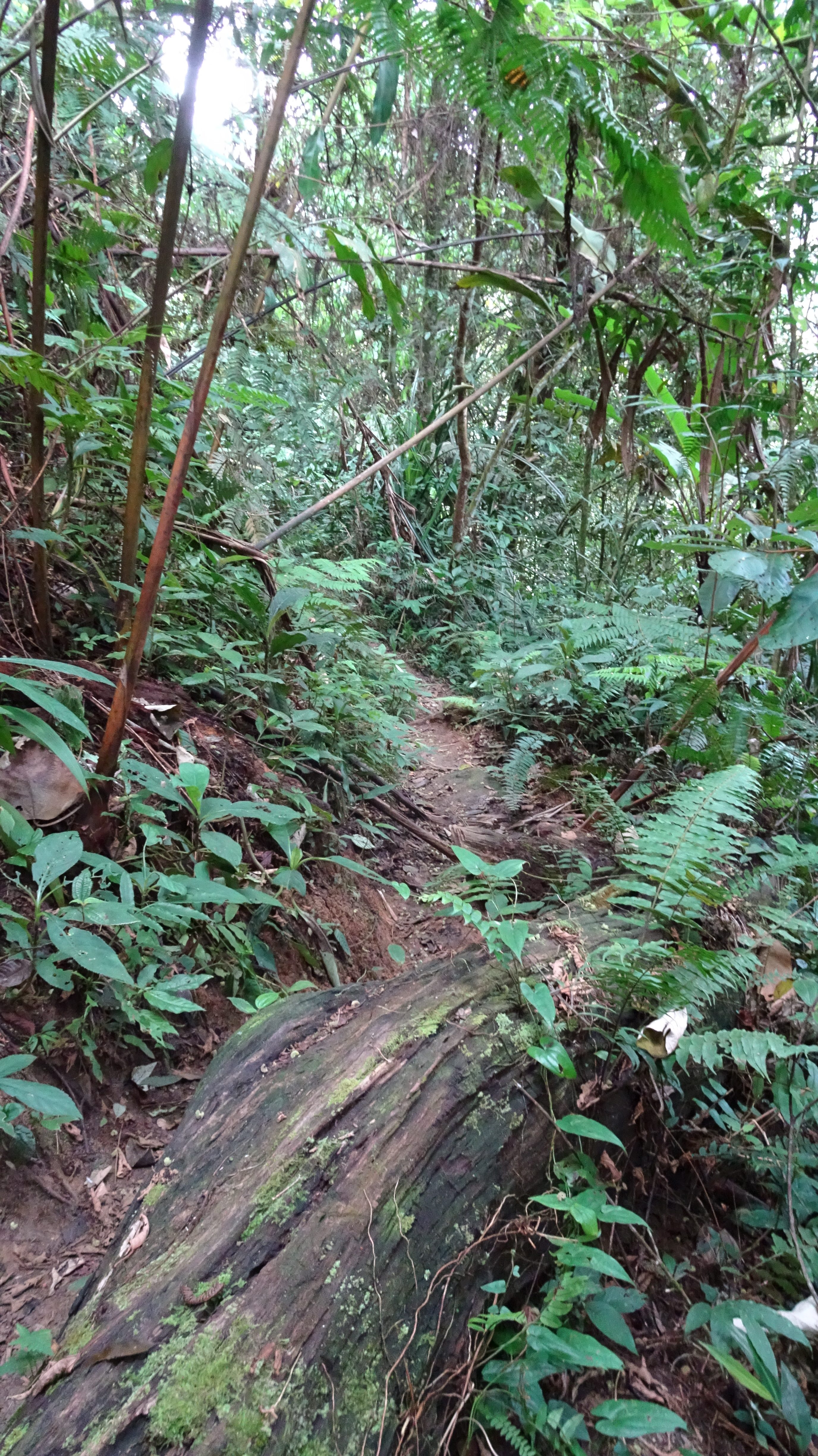 Einfach schön, auf dem schmalen Pfad durch den tropischen Wald zu wandern. Dabei sind zuweilen kleinere oder größere „Hindernisse“ zum Überklettern oder untendurchschlüpfen zu passieren. Wurzeln und Äste bieten ihre Hilfe an, wenn es mal steiler runter oder rauf geht.