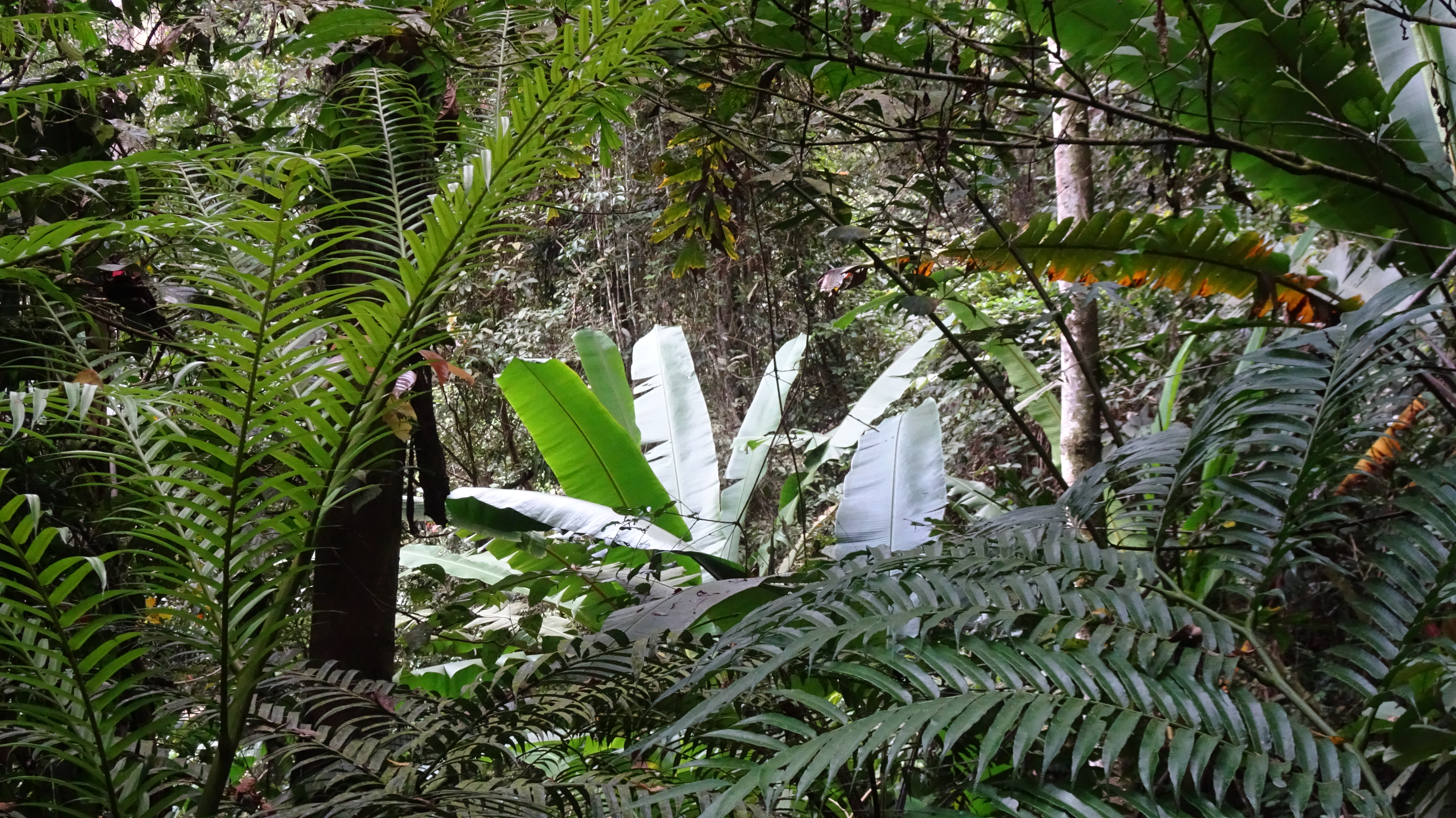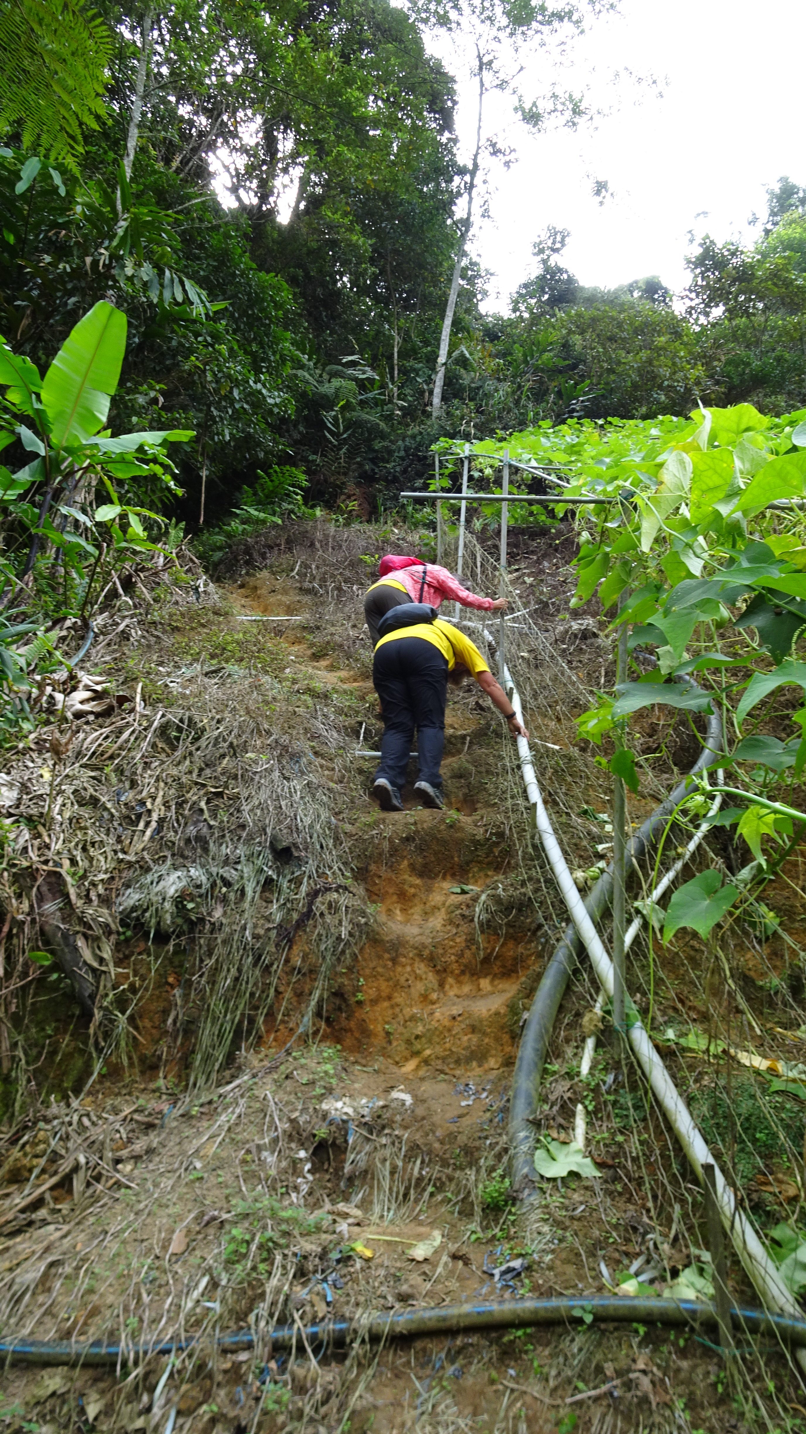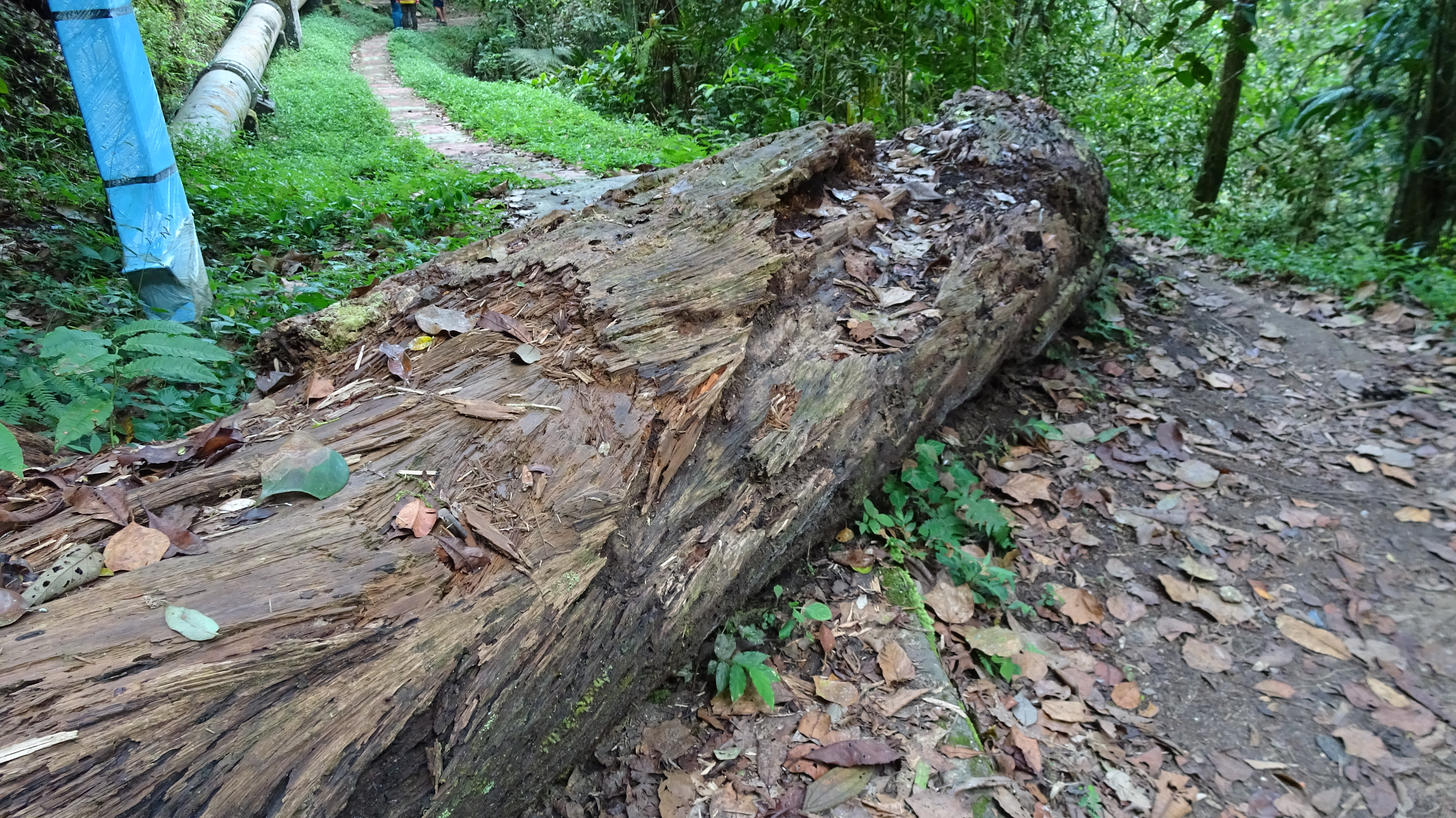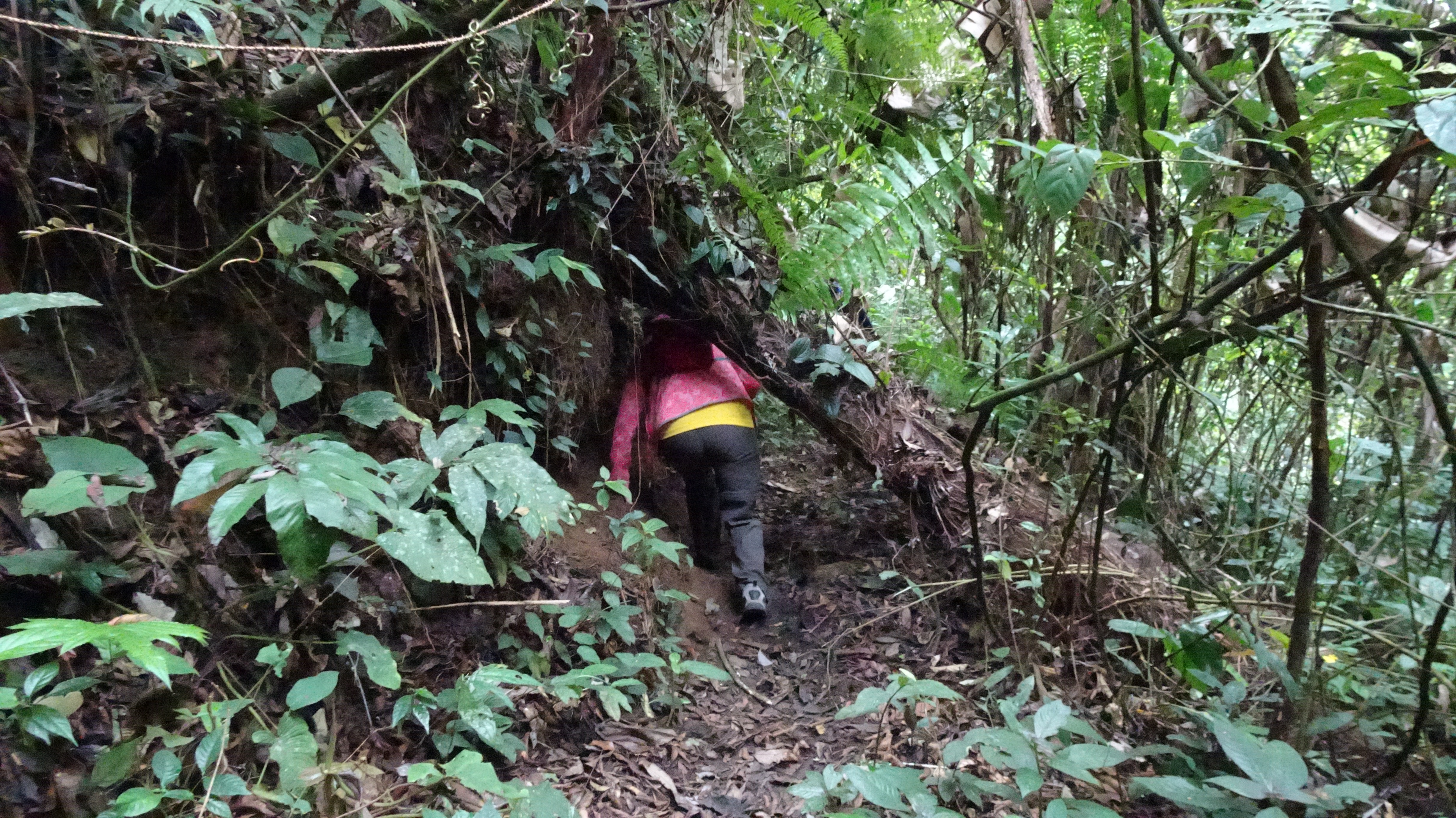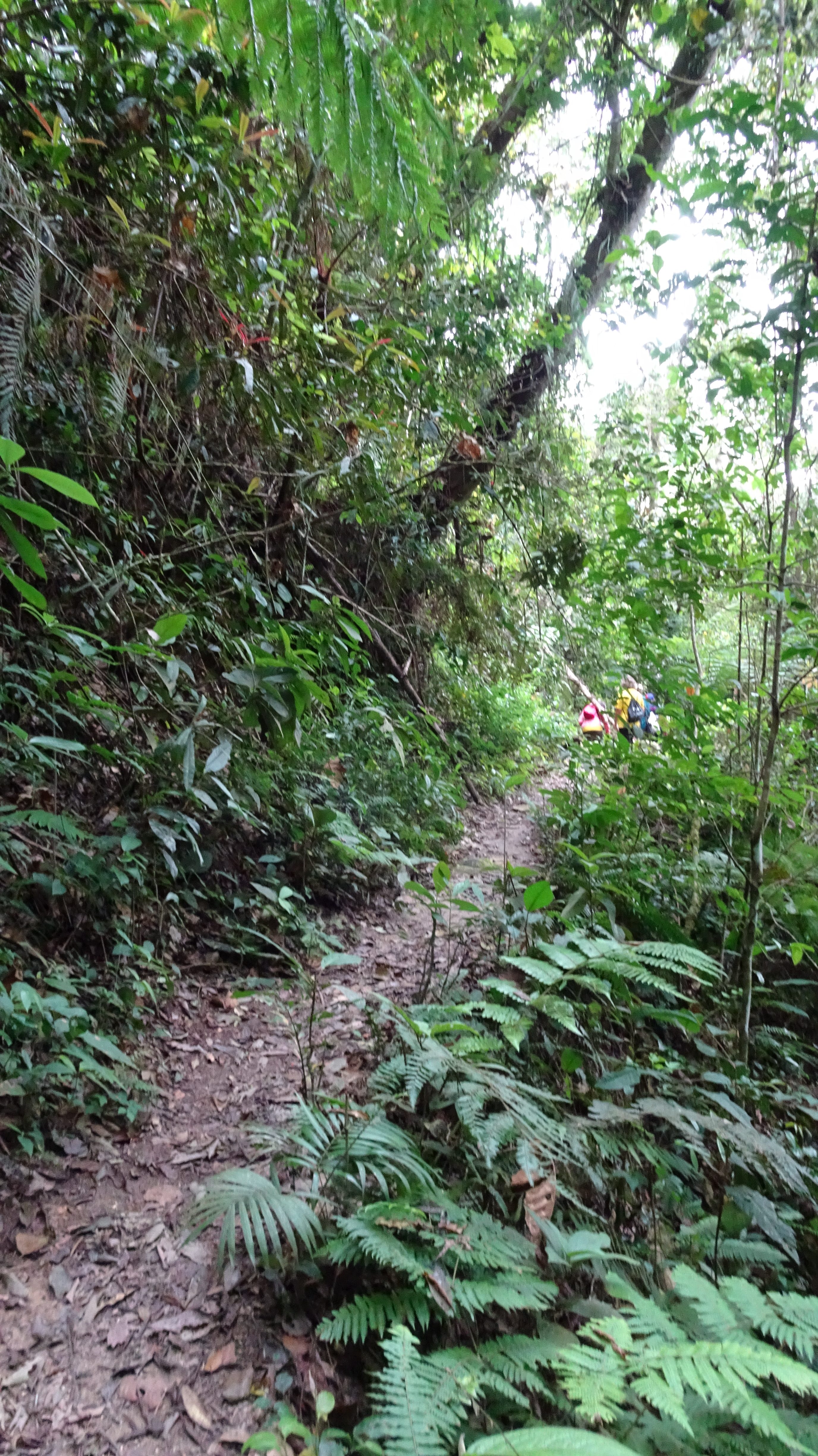 Einfach schön, auf dem schmalen Pfad durch den tropischen Wald zu wandern. Dabei sind zuweilen kleinere oder größere „Hindernisse“ zum Überklettern oder untendurchschlüpfen zu passieren. Wurzeln und Äste bieten ihre Hilfe an, wenn es mal steiler runter oder rauf geht.
