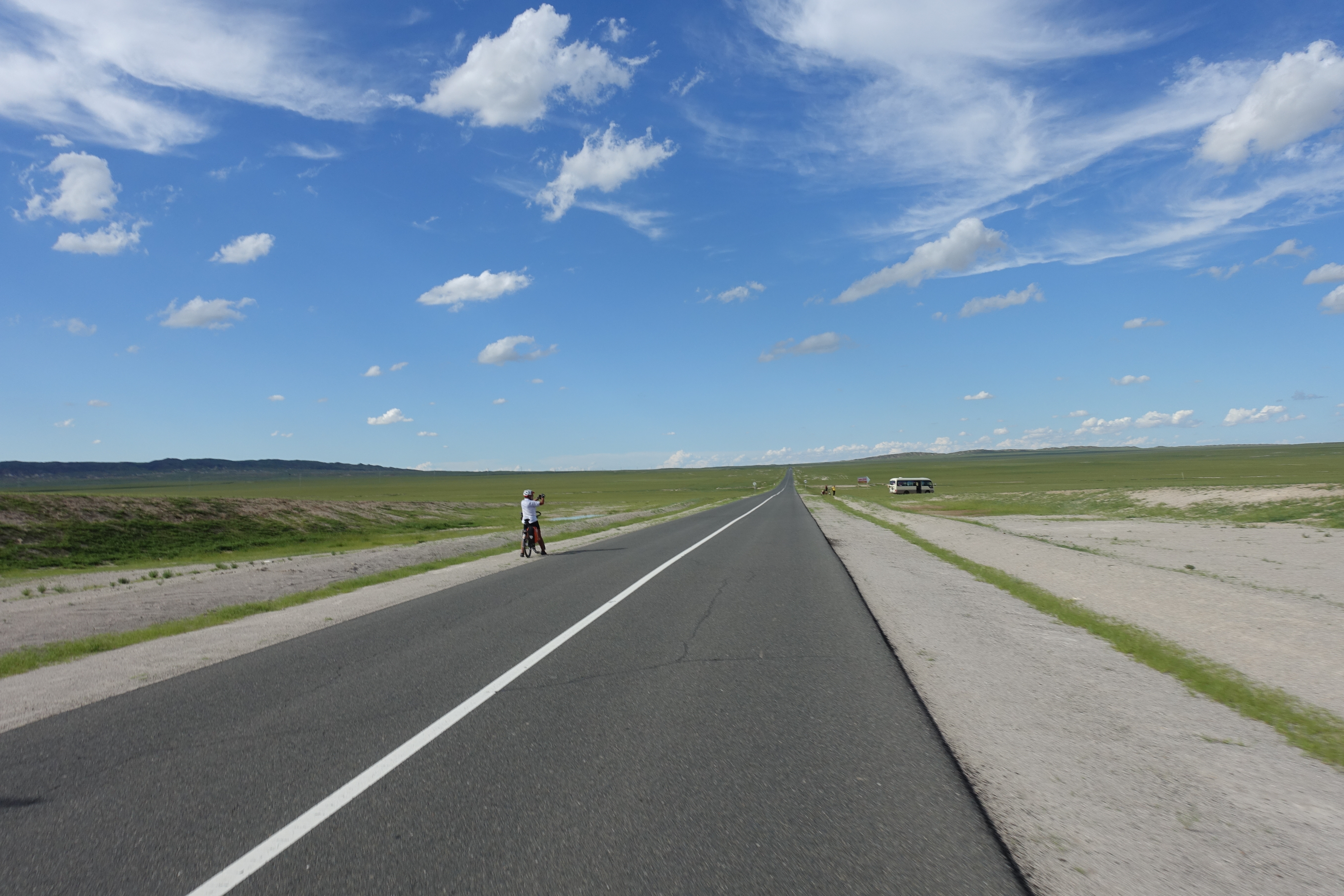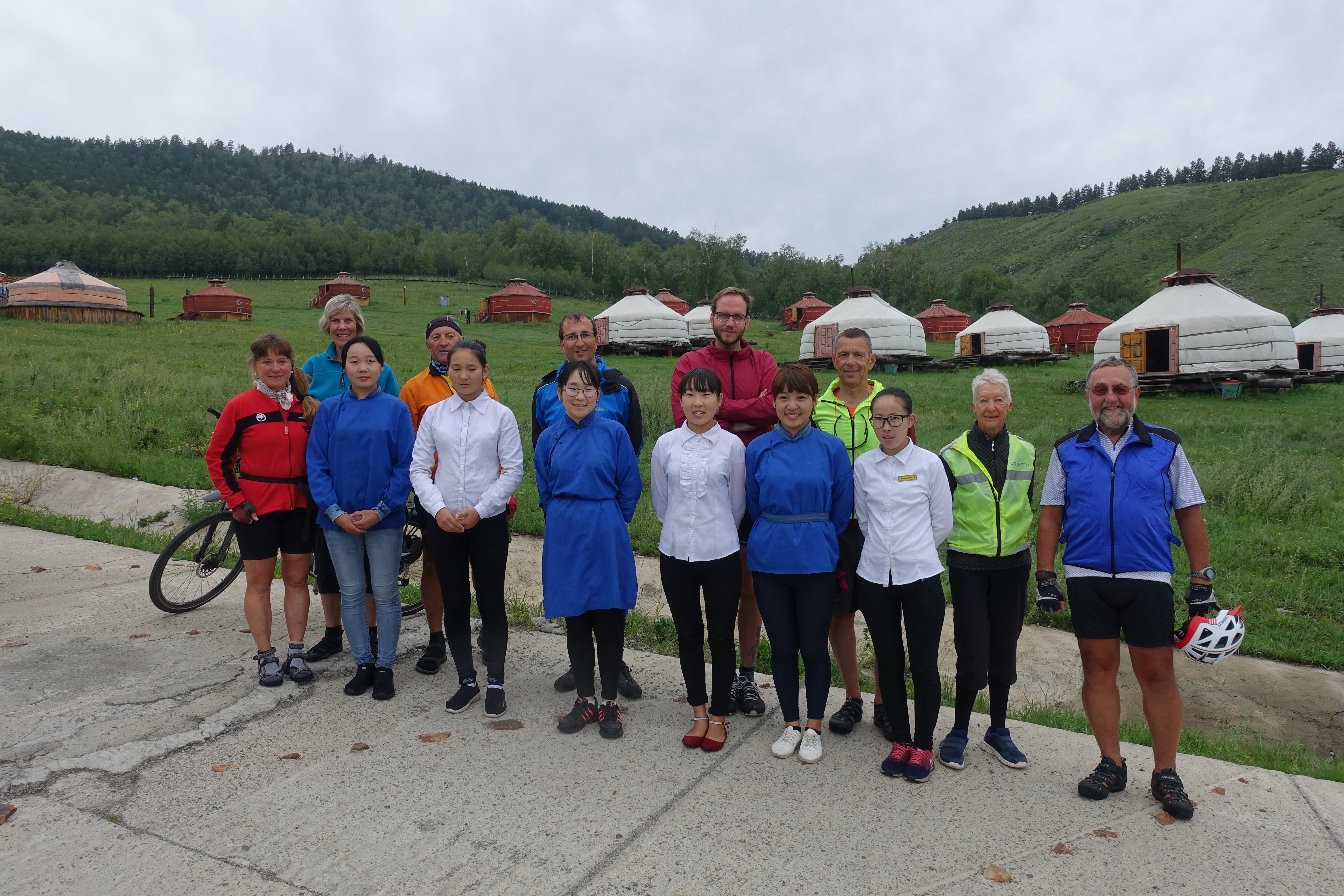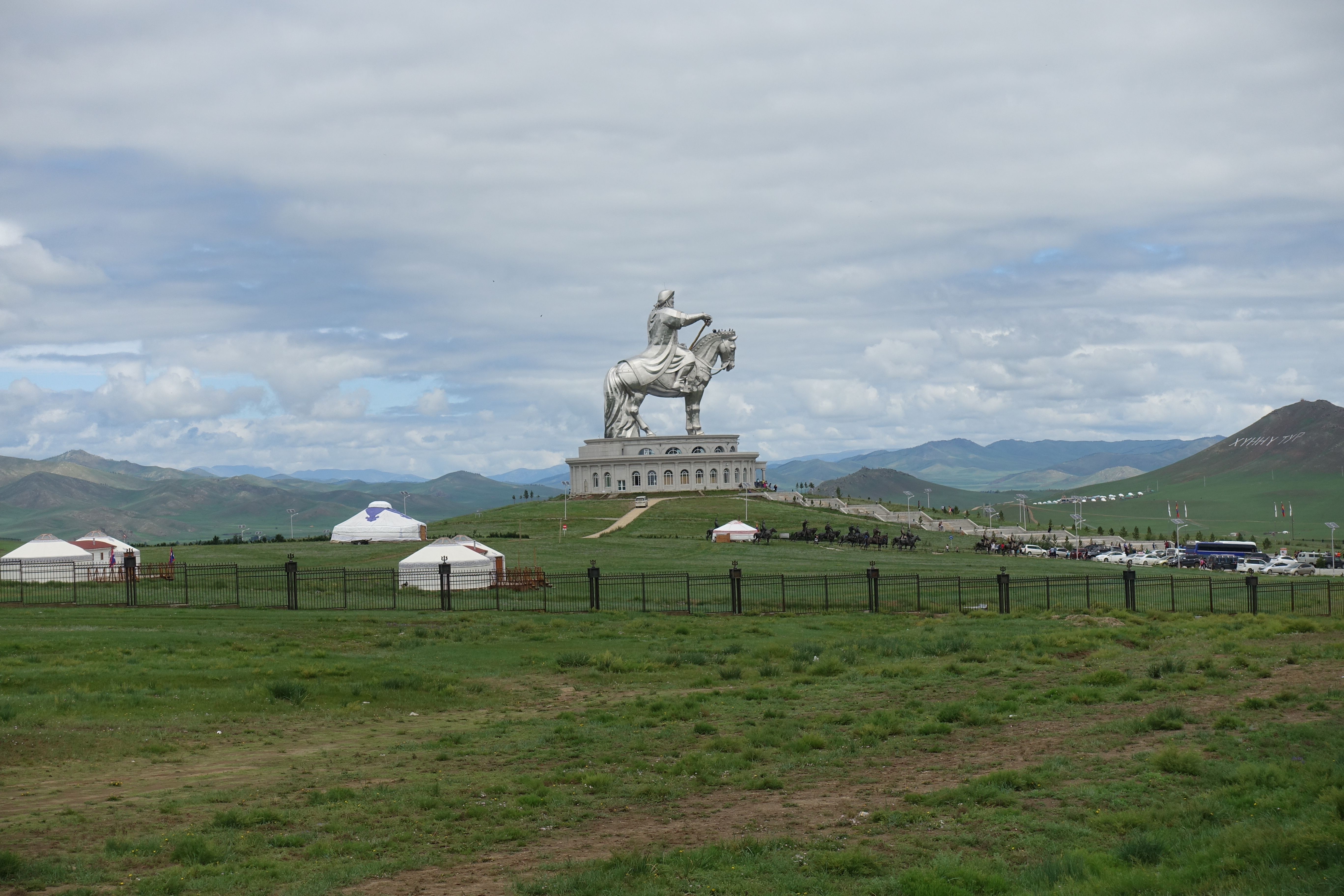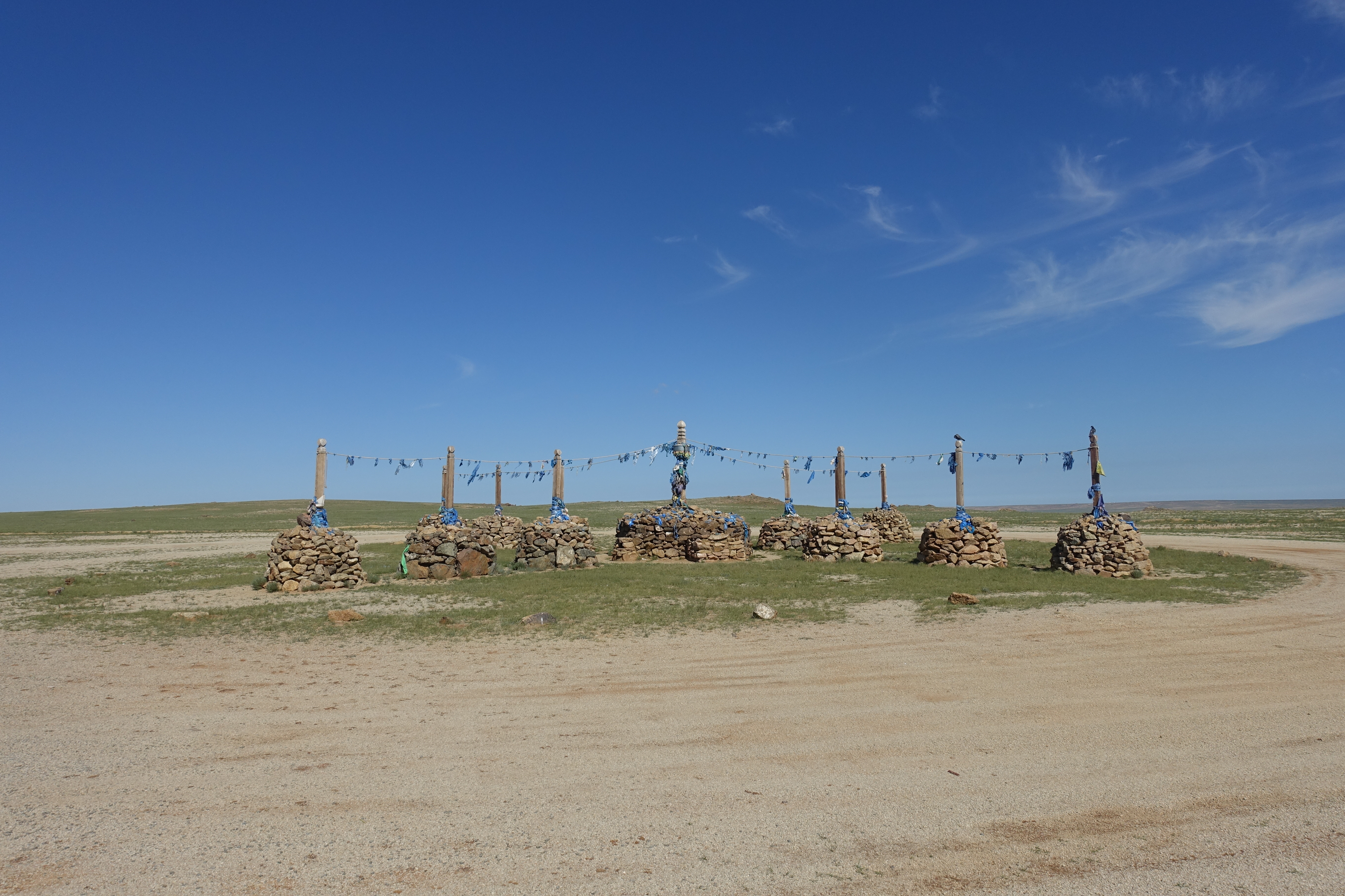 Einmal im Jahr, am 11. Juli, findet das größte Volksfest des Landes statt, das Naadam. Dazu kommen Männer, Frauen und Kinder aus allen Landesteilen, um sich miteinander im Wettkampf beim Ringen, Reiten und Bogenschießen zu messen. Wir sahen z.B. als wir zum Dshingis-Khan-Monument aus der Stadt radelten einen Teil der ca. 27 km langen „Rennstrecke“ in der Steppe am Straßenrand.