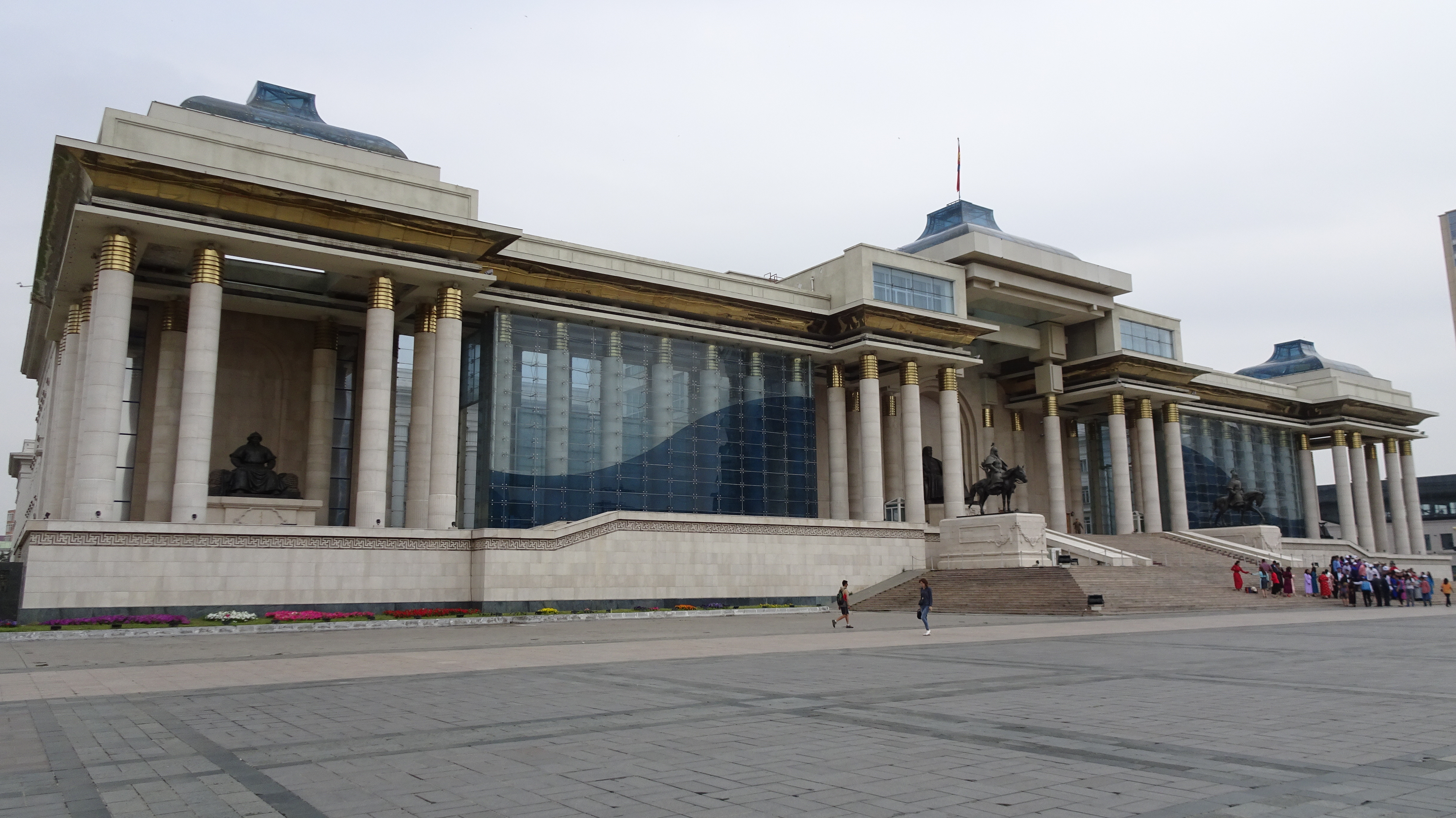 Vor dem Eingang des Parlamentsgebäudes sind große Skulpturen aufgestellt: In der Mitte natürlich Dschingis Khan, rechts und links sein Sohn und Nachfolger Ögedei Khan und sein Enkel Kublai Khan, der sogar Kaiser von China war.