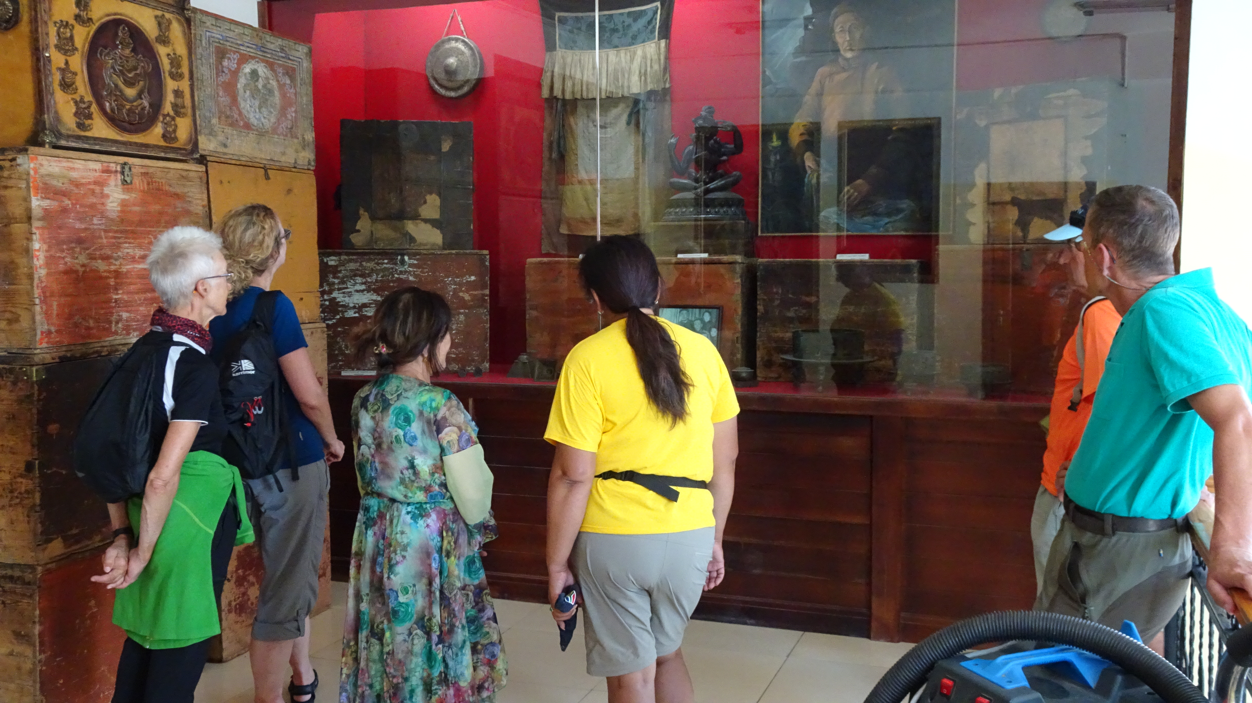Nicht weit vom „Premium Hotel“, in dem wir wieder echt komfortabel logieren, liegt das Gandan-Kloster, das größte des Lamaismus im Lande und eines der wenigen noch fast original erhaltenen. Leider wurden auch hier früher Gebäude zerstört und unter anderem eine 26 Meter hohe goldene Statue der Göttin Janraisig (Sanskrit: Avalokiteshvara) demontiert und eingeschmolzen. Mit Spenden in Höhe von ca. 5 Millionen US-Dollar wurde nach 1990 im Haupttempel eine neue vergoldete Janraisig errichtet und für den Dalai Lama – er gilt als das eigentliche Oberhaupt des Klosters – wurde ein Thronsessel gebaut.