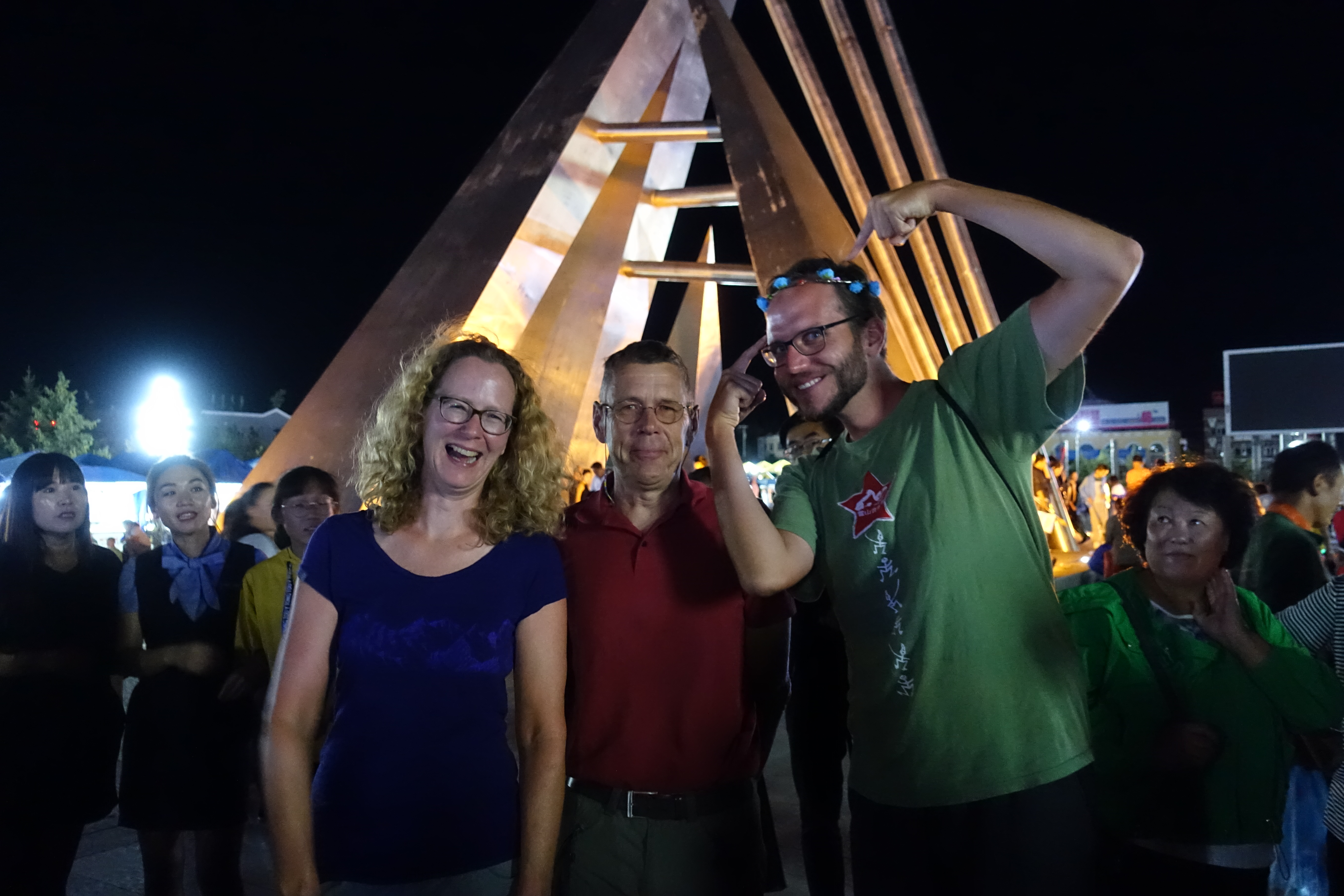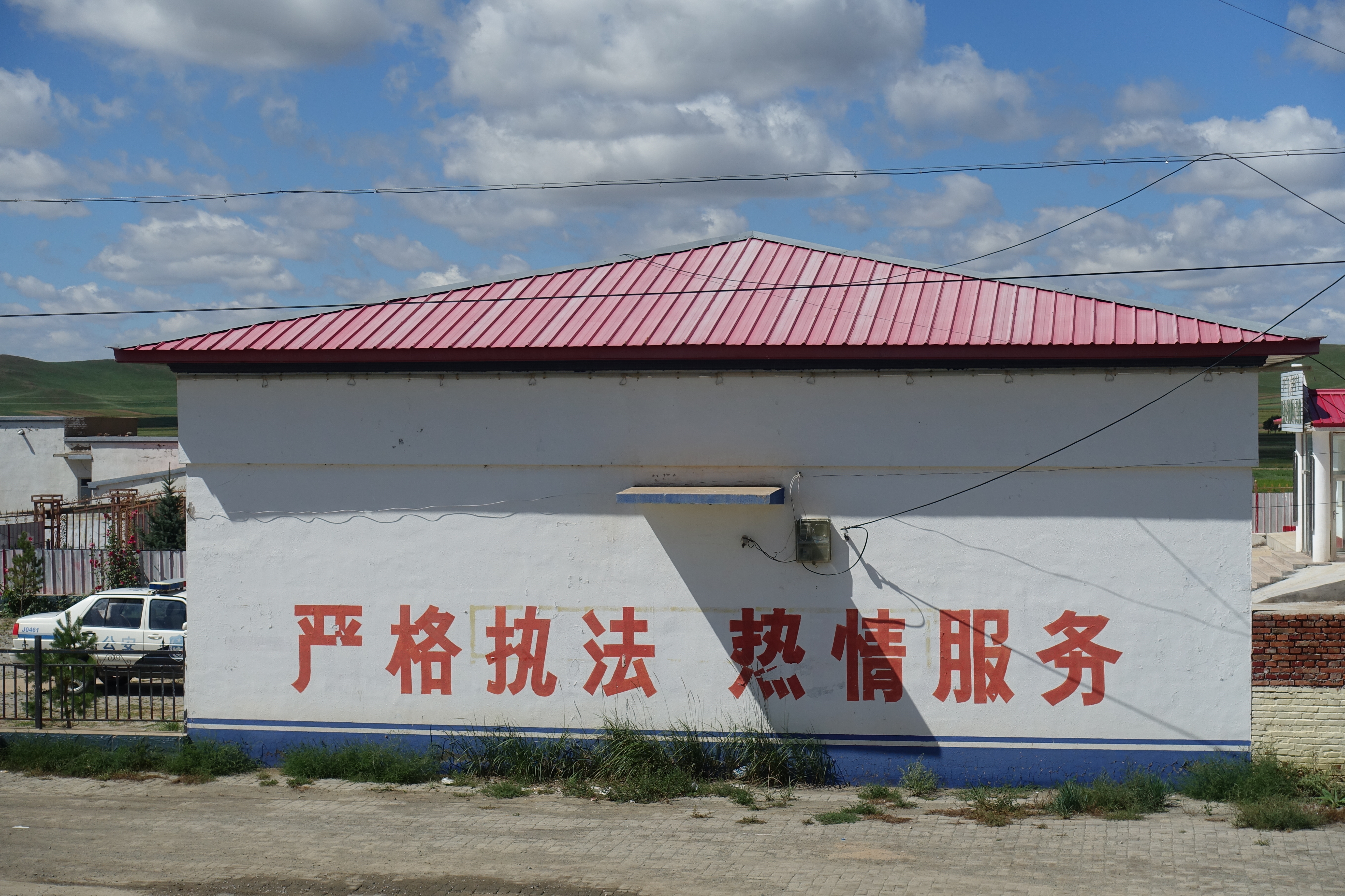Nach einem chinesischen Frühstück in der Nähe unseres etwas aus der Zeit gefallenen Hotels schwangen wir uns bei günstigem Wind und strahlendem Sonnenschein auf unsere Räder, um an diesem 136. Reisetag (14.08.2018) weiter nach Süden zu gelangen. Die Dörfer erinnerten in ihrer Bauweise und aufgrund ihrer Bewohner an Altersheime, was aufgrund der demografischen Probleme in China nicht überrascht. In der Nähe von Huade wechselten wir auf eine größere, breit ausgebaute Straße. Flankiert wurden wir von auffällig vielen Parolen und Losungen, die uns die Führung der Partei und die „Sozialistischen Kerntugenden“ schmackhaft machen wollten, aber auch Umweltschutz und ähnliches propagierten. Beflügelt von Rückenwind und der stärkenden Nudelsuppe, die wir mittags eingenommen hatten, erreichten wir unser nächstes Ziel, Shangdu. Den Abend verbrachten wir nach einem feurigen Essen auf dem zentralen Platz, wo fliegende Händler Wischmops und Jadeschmuck verkauften, junge und nicht mehr ganz so junge Leute ihre Tänze übten und Kinder in bunten Panzern ihre Runden drehten.