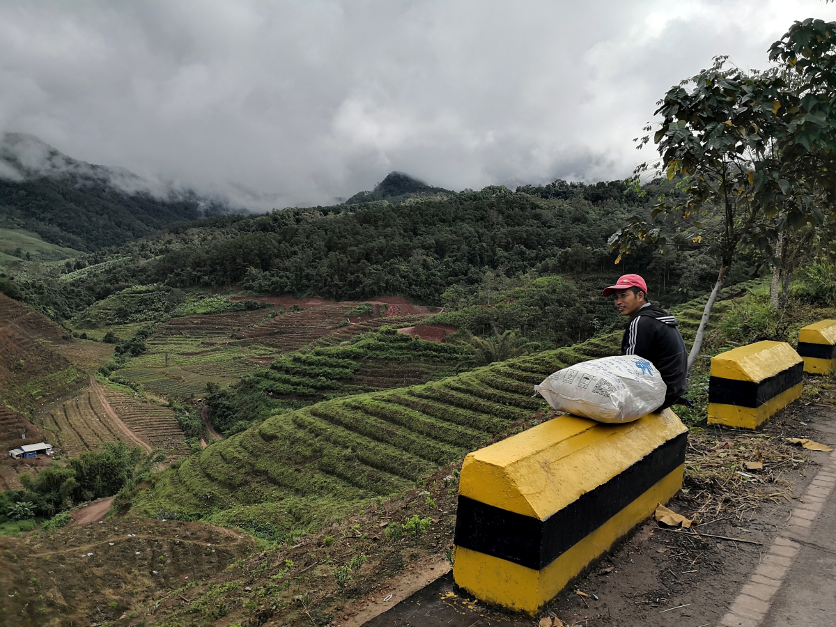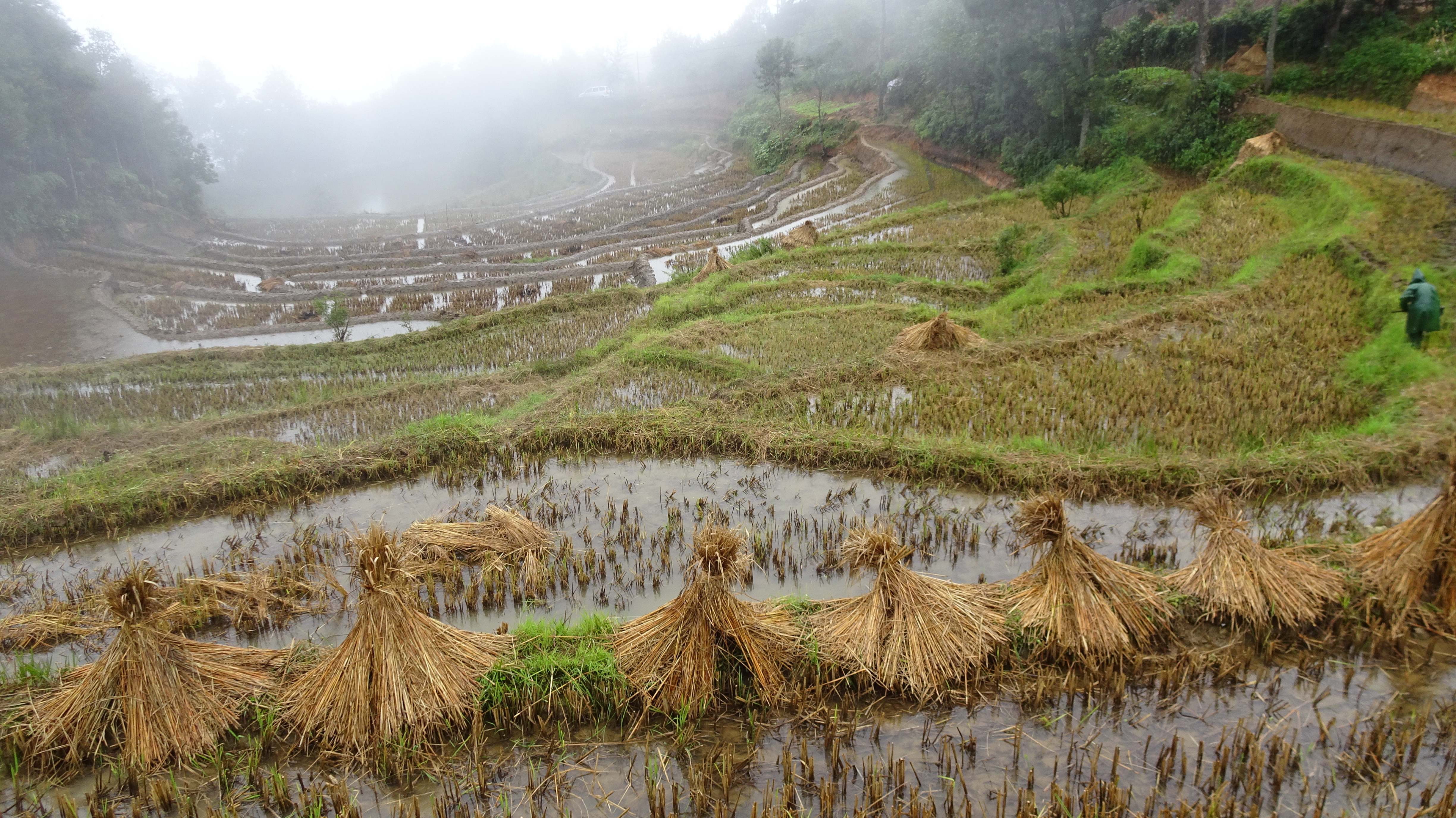 Einer jedoch scheute weder Regen, noch Huppel, rutschigen Boden oder sonstige Gefahren: Reinold machte sich heute trotz aller Widrigkeiten zu einem Spaziergang bis in die untersten Hänge der Reisterrassen auf. Ihn trafen wir auf der Hälfte unseres Weges. Mitnehmen lassen wollte er sich aber nicht; er genoss es, sich nach all den Radkilometern auch einmal einfach nur die Beine zu vertreten.