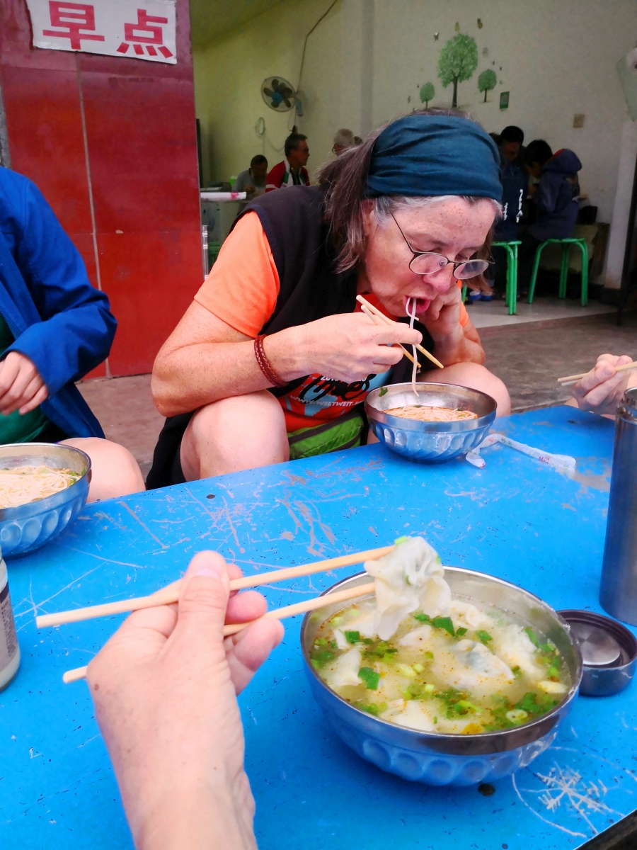 Für Peter, Hans, Xiao Lei und mich gab es wenig später eine kleine Reisnudelsuppe, die in mühsamer Einzelarbeit (und bewunderungswürdiger Ineffizienz) angefertigt würde und uns eine gute Stunde im feuchtkalten Nudelshop kostete. Lecker schmeckte sie aber! Mit einer weiteren kleinen „Daizou“- (Take Away-) Schüssel ungewohnt durchgekochter Kartoffeln machten wir uns wieder auf den Heimweg.