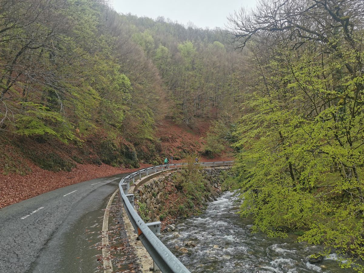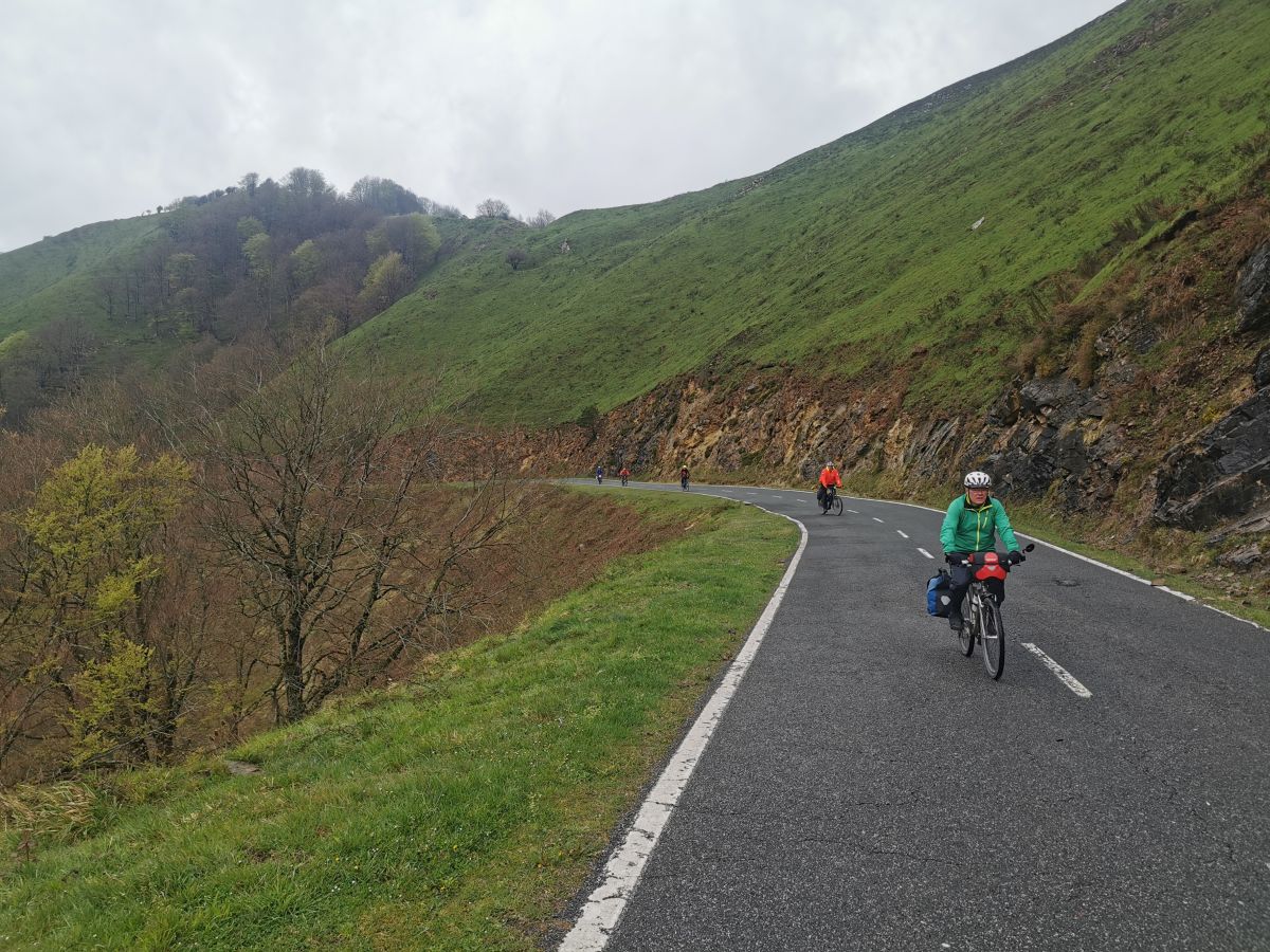 Um 10:45 sind wir aber dann endlich auf dem Weg, beziehungsweise suchen ihn noch, da ich einmal falsch abbiege und das dann gleich einen Umweg nach sich zieht. Hektisch wird es aber trotzdem nicht, da der Wind von hinten uns den auch nicht sonderlich steilen Berg nach oben bläst. Zwischendrin ein wenig Sonne, zwei kurze Schauer, ein Passrestaurant, das wenig vertrauenserweckend ist und ein weiteres, in dem Baskische Schafzücher anscheinend den kommenden Wahlsieg Le Pens begießen. Mit dem Alkohol waren sie da erfolgreicher. Reinhold, unser Fahrer, wird erst einmal von einem der Schäfer nach dem baskischen Pass gefragt, sonst würde er keinen Zutritt zum Restaurant erhalten. „Spass!“, ruft er und weht mit der Atemluft ein lokales Pastisderivat entgegen.