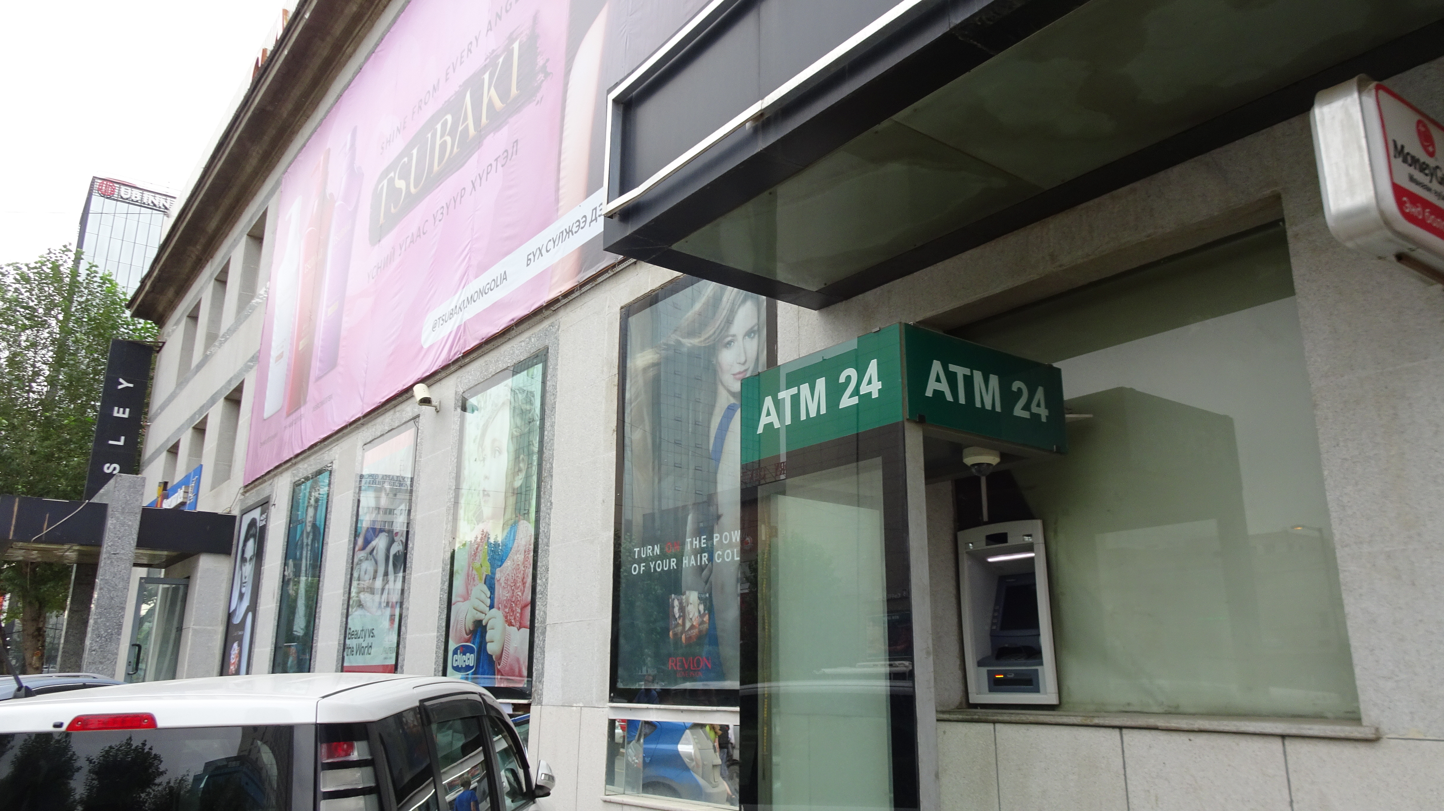 Byambaa erzählt uns interessantes über die markantesten Bauten auf diesem riesigen Platz. Da gibt es das Parlamentsgebäude, das Rathaus der Stadt, das Haus der Kultur, die Staatsoper, die Mongolische Börse sowie einige neuere und moderne Hochhäuser mit Hotels, Restaurants und Geschäften. In allen großen Straßen des Zentrums rufen Banken nach Kunden und auch wir folgen den zahlreichen ATM-Schildern, um uns mit Tugrik (Bildnisse von Süchbaatar und Dschingis Khan) zu versorgen. Anmerkung für die Insider unter den Blogleserinnen: Nach meiner Beobachtung dominieren eindeutig Wincor-Nixdorf und Diebold die „Geldautomaten“-Szene, sogar im Ticket-Häuschen des Gandan-Klosters. 😉