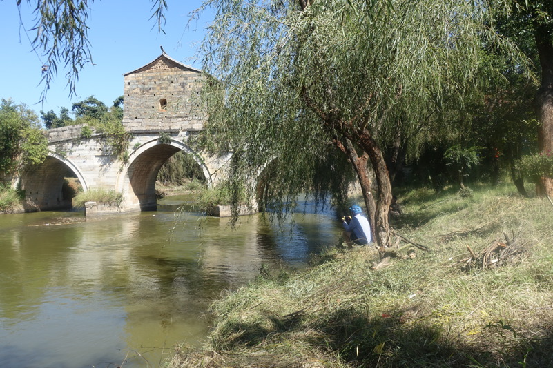 Weiter geht’s. Am Flüsschen entlang zurück nach Jianshui. Qingzeitliche Brücken säumen unseren Weg. Am beeindruckensten die Chuang Long Brücke. Also Fotostopp, dann werden wir von einer lautstarken chinesischen Reisegruppe vertrieben, die jedes romantische Sinnieren zunichte macht, schwingen uns auf die Räder und lassen den Nachmittag jeder für sich ausklingen.