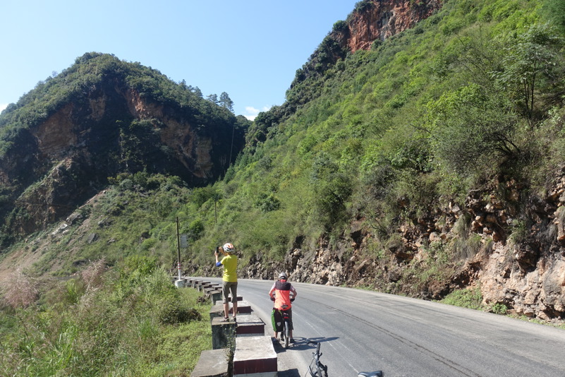Heute haben wir das „Vergnügen“ eine sehr vielfältige Strecke zu fahren. Es geht mal wurde auf und ab. Das heißt auf kleine Straßen über den Berg. Durch den Nadelwelt ab in den Moloch. Zementfabriken säumen plötzlich die Straße. Ein Laster nach dem anderen. Verkehr. Grauer Staub überall: Oben, unten in der Luft. Es knirscht zwischen den Zähnen und die Augen fühlen sich trocken an. Haarspray braucht keiner mehr. Idyllische Plätze für die Pause? Fehlanzeige. Und dann ein paar Kilometer weiter – das weite Land. Wasser und grüne Hügel. Gemüsefelder sorgfältig in die Landschaft parzelliert. Bougainville am Straßenrand. Rosa und blaue Wicken überwuchern alles, was sich nicht wehren kann. Und wieder Verkehr und wieder Staub. So wechselt es sich ab bis zu unserem Endspurt nach Jianshui.