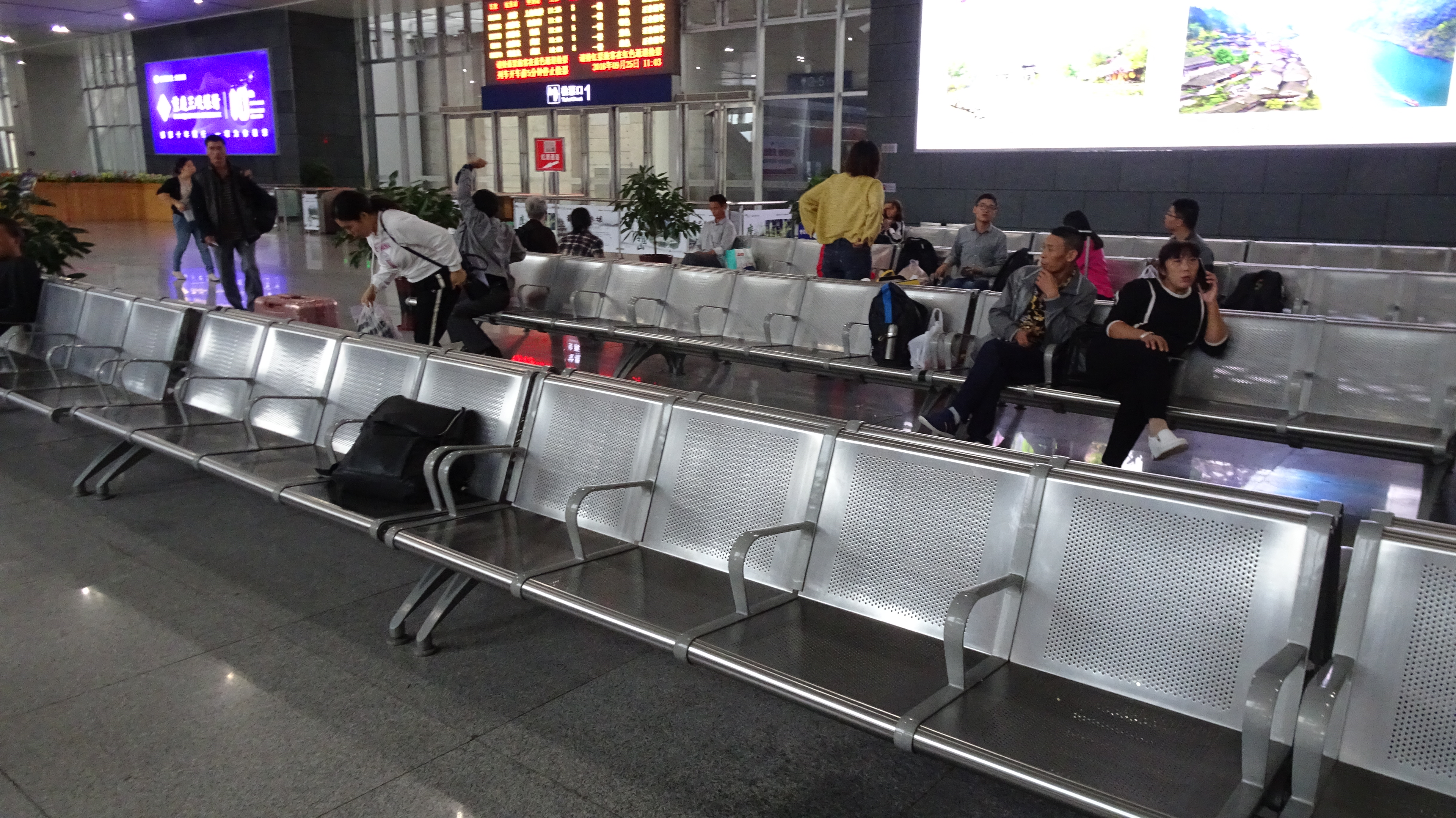 Der liegt ziemlich weit draußen und macht einen zwar großen, aber eher ruhig-verträumten Eindruck. Der erste Zug, der uns noch mitnehmen kann, fährt leider erst 13.57 Uhr, d.h. wir sitzen mit anderen Reisenden, die z.T. in frühere Züge einsteigen dürfen im großen Wartesaal und warten geduldig.