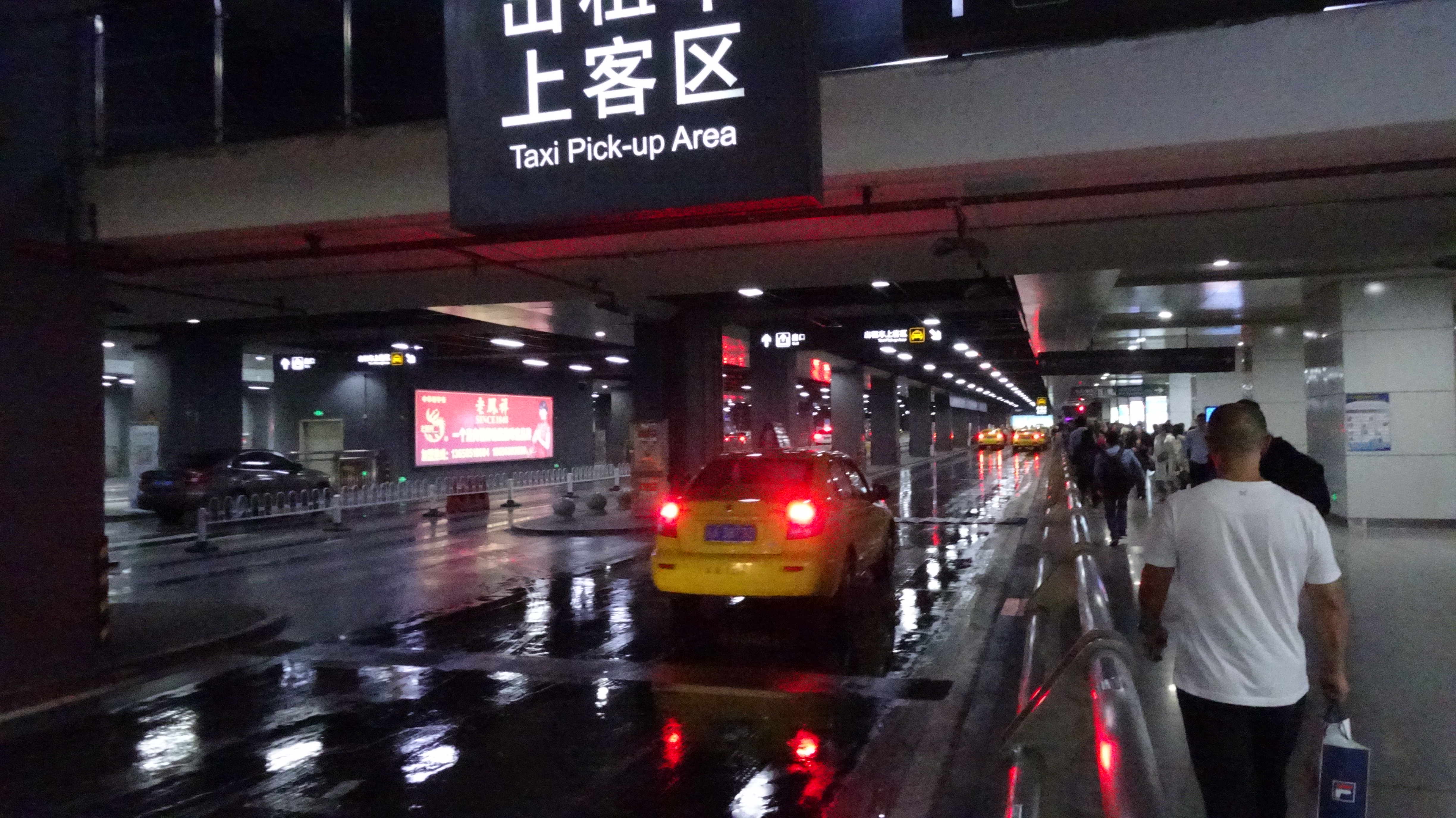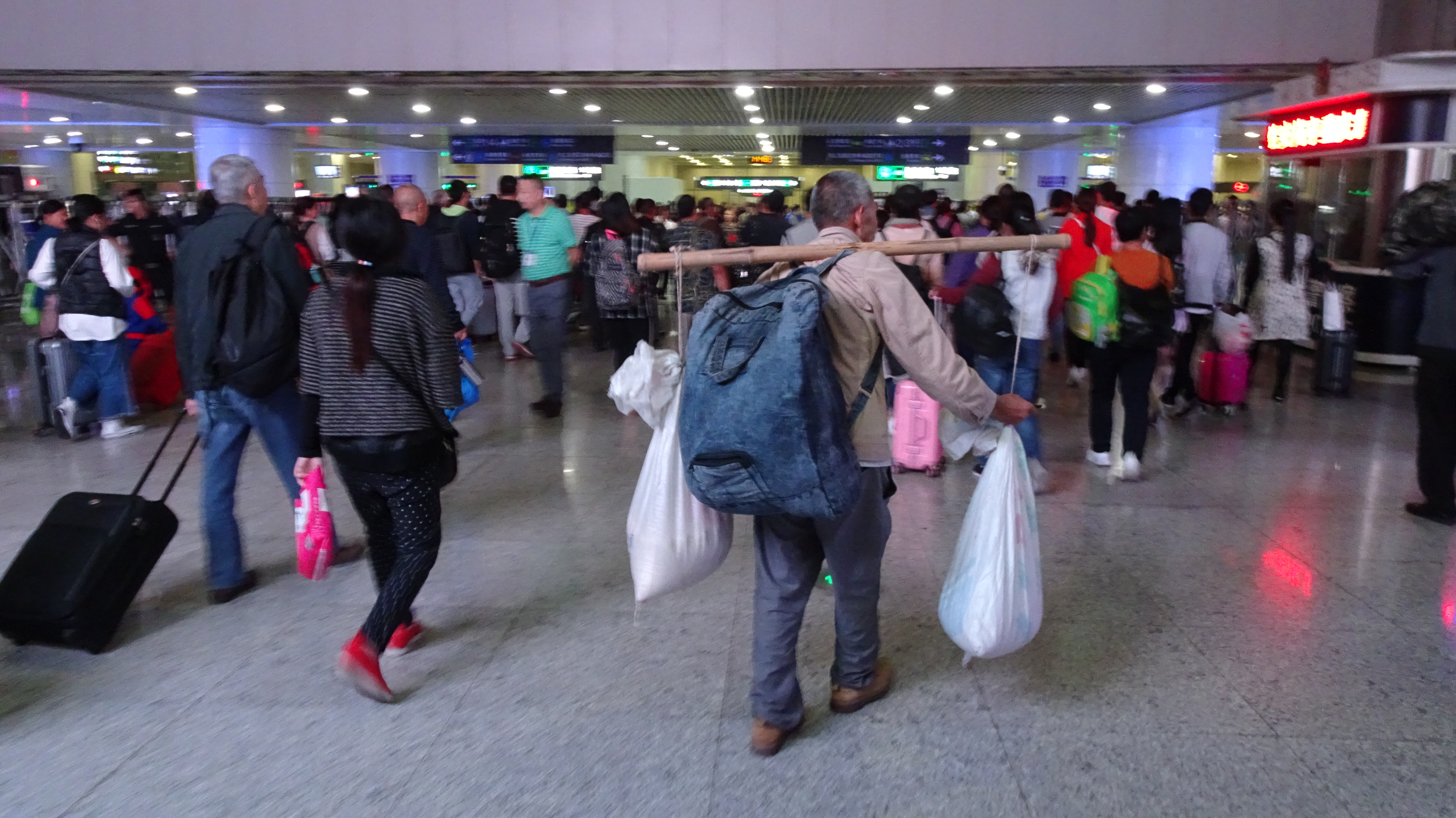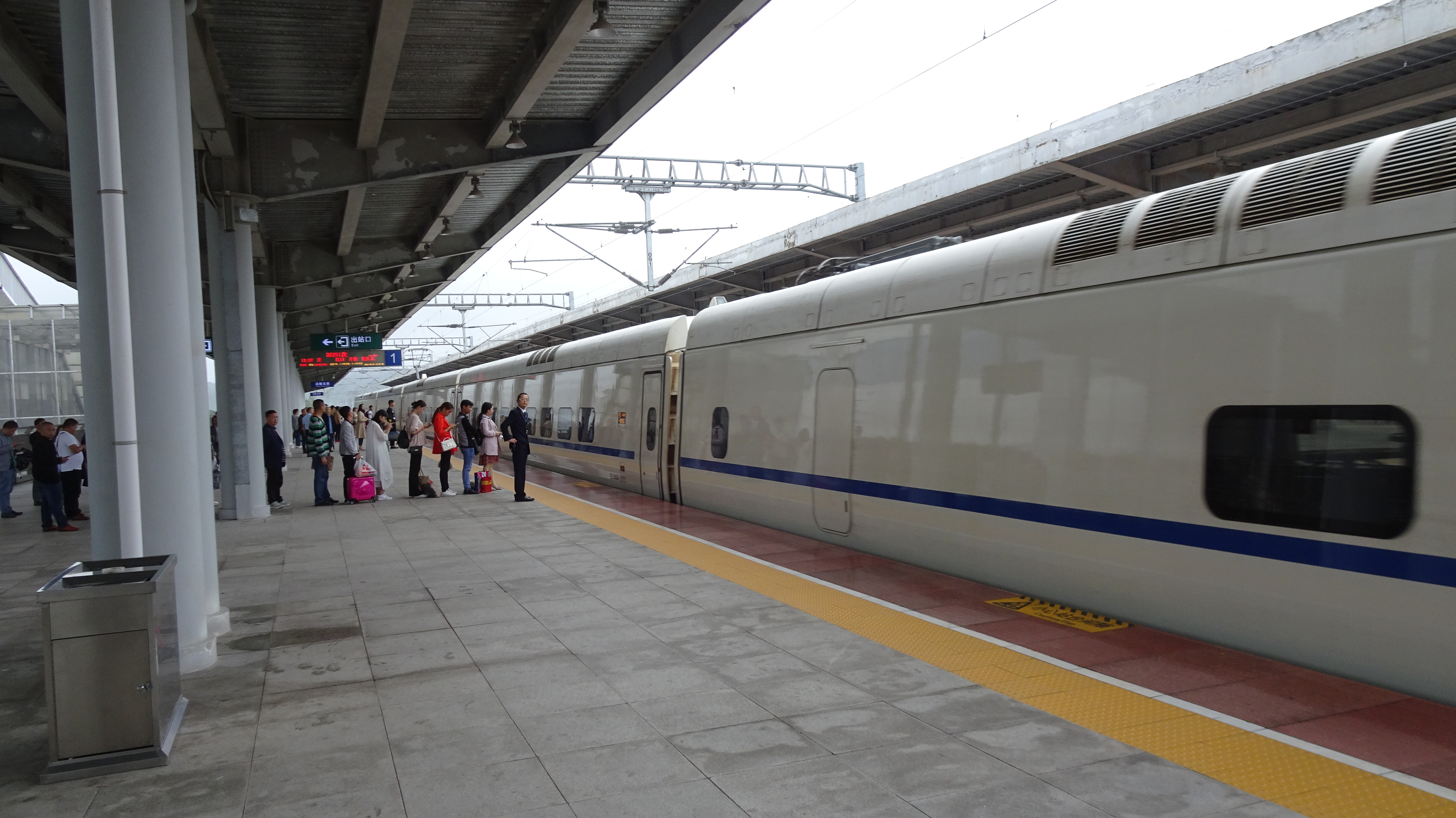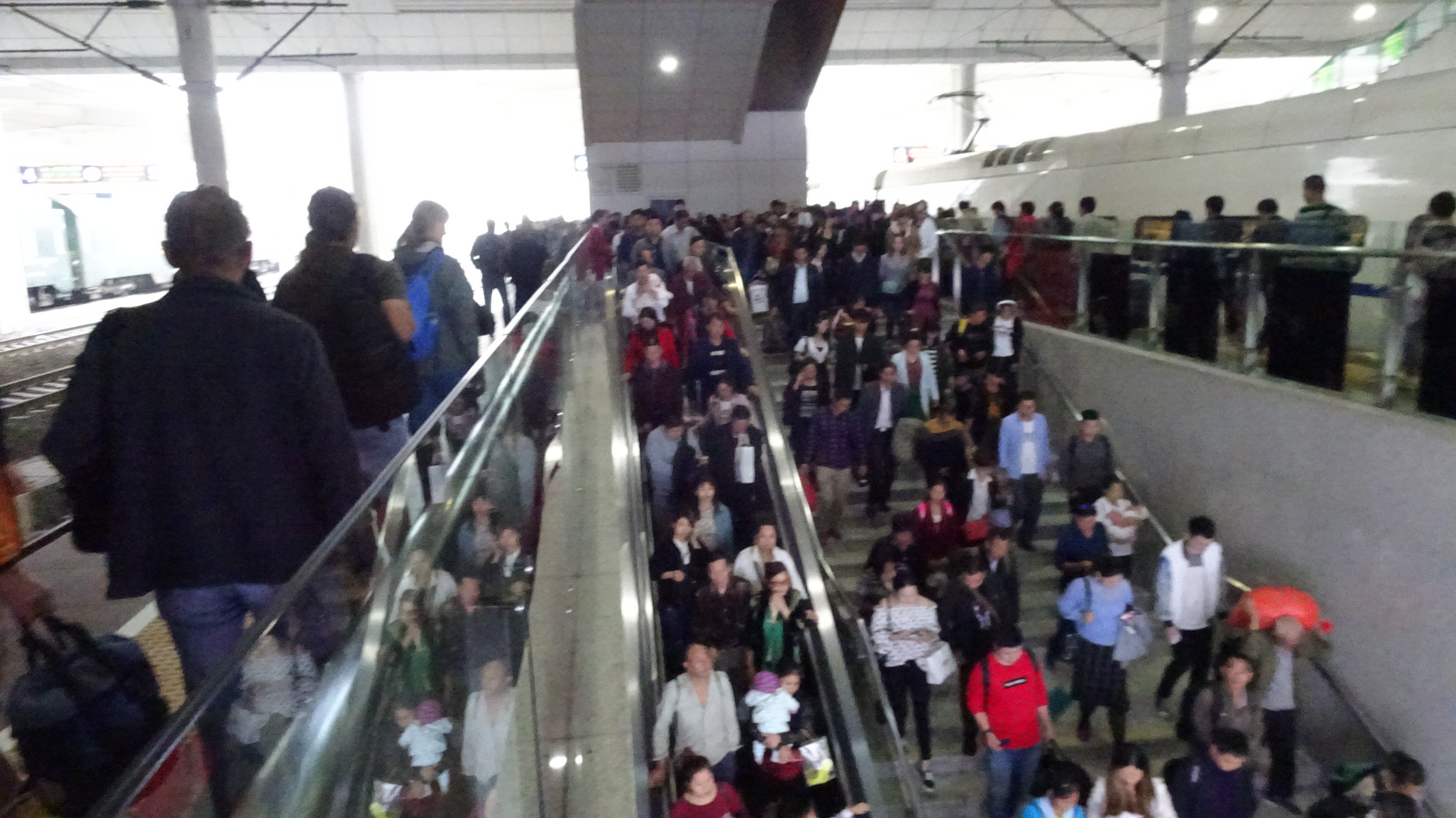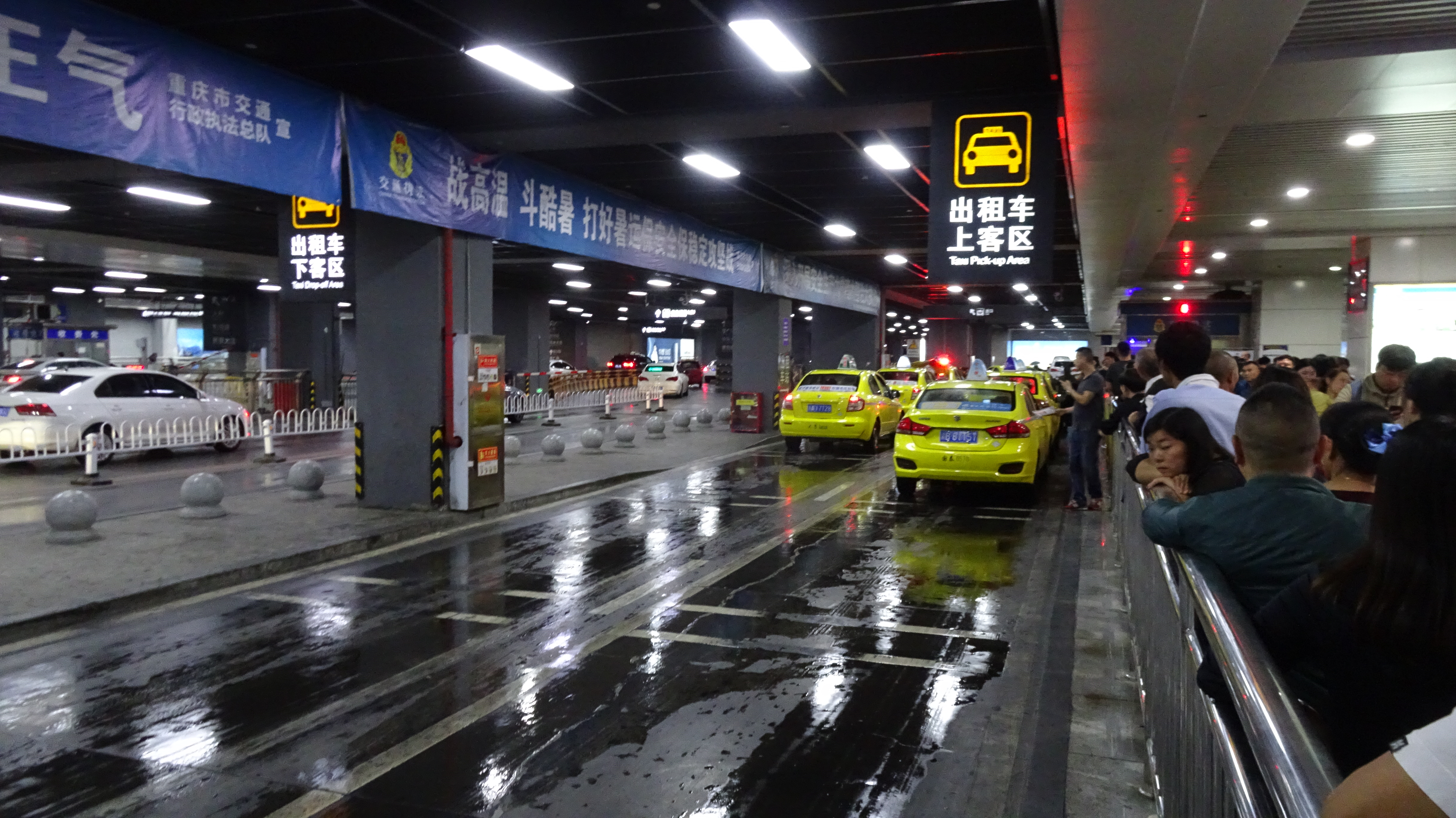 Mit streckenweise fast 200 km/h sind wir nach etwas mehr als einer halben Stunde mit einem Zwischenstopp auf einem anderen Bahnhof auch schon in Chongqingbei (also auch „Nord“) und schwimmen im endlosen Menschenstrom dem Ausgang aus dem riesigen Bahnhofsgebäude entgegen. Eine Ebene unter der „Oberfläche“ schwirren Schwärme gelber Taxis auf zwei Spuren herbei.