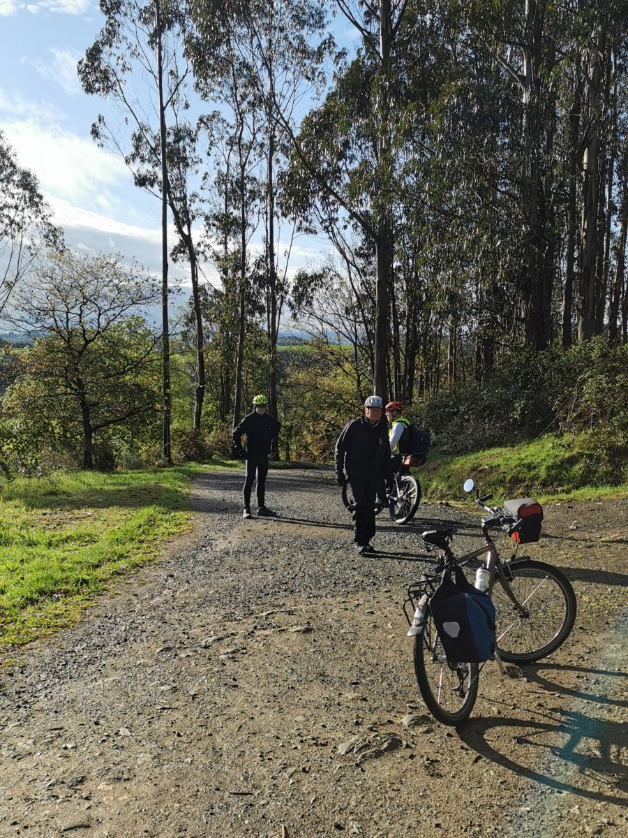 Galicien ist wunderbar grün und gelb und manchmal auf violet, es blühen Obstbäume. Ob der Fülle der Eindrücke geben wir uns heute bescheiden: Das Pciknick ist Regen bedingt kurz und speist sich aus den Restbeständen der Markteinkäufe in Santiago. Nur den Tittenkäse haben wir heute immer noch nicht angerührt. Bevor uns jemand canceled: Der Käse heißt wirklich so.
