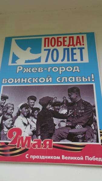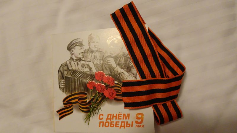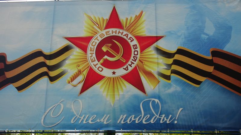 Viele Plakate und Transparente gibt es anläßlich des Feiertags. Gestern Morgen sah ich im vorbeiradeln eins mit den Worten: „Danke Väter für den Sieg“.