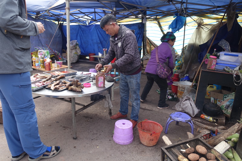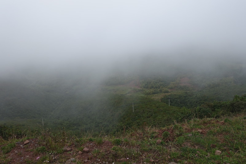 So fährt jeder seinen Trott. Mittlerweile hat sich die Vegetation geändert. Kärger wird die Landschaft je höher wir steigen. Zuckerrohr, Tabak und Bambus werden durch Nadelgehölze abgelöst. Hie und da entdeckt man Pilzesammler oder eine kleine Imkerei. Meine Beine fühlen sich müde an. Xiao Luo ist besorgt und würde wahrscheinlich am liebsten jeden nötigen, in den Bus zu steigen. Verlockend ist das Angebot, aber ich bleibe standhaft. Elstern begleiten unseren Weg und lachen spöttisch. Es wird kühler und der Nebel verdichtet sich. Ein Gefühl als würde man in die Wolken steigen. Als Belohnung für die Quälerei reißt am Gipfel der Himmel auf und die Sonne erstrahlt. Außerdem erwartet uns ein deftiger Imbiss in Form von gegrilltem Schwein und Kartoffeln. Wir genießen den Snack und lassen uns dann auf rasanter Fahrt bergab rollen. Auf halber Strecke sammelt sich dann die ganze Gruppe wieder und wir gehen, gestärkt durch Nudelsuppe und Baozi, den Rest der Strecke gemeinsam an.