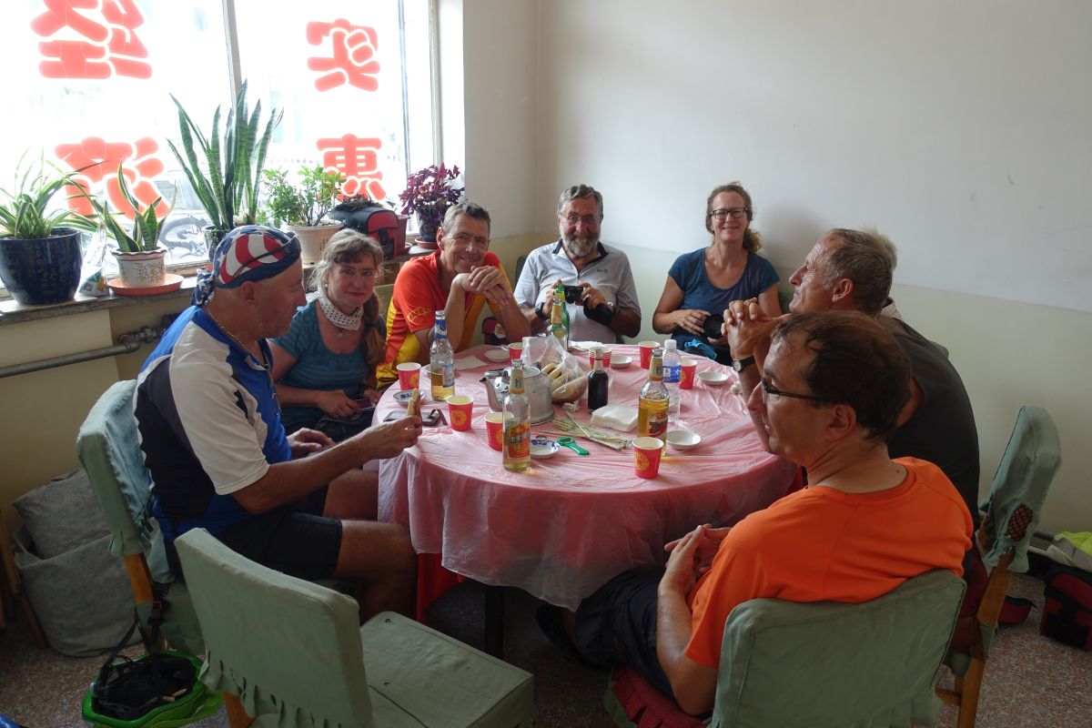Der erste Teil unserer Etappe ist wieder stark frequentiert mit Kohlelastern. Erst als wir lange später auf eine andere Straße abbiegen wird es ruhiger. Nur noch vereinzelt LKWs. In einem kleinen Ort kehren wir ein und essen Nudelsuppe oder gebratene Nudeln. Das ideale Radler-Mittagessen. Natürlich sind wir auch in diesem Restaurant wieder die Attraktion. Ein alter Mann, der wegen der vielen fehlenden Zähne kaum zu verstehen ist, redet immer lauter weil er denkt, dass wir ihn nichtverstehen weil wir etwas schwerhörig sind. Half aber leider nicht.