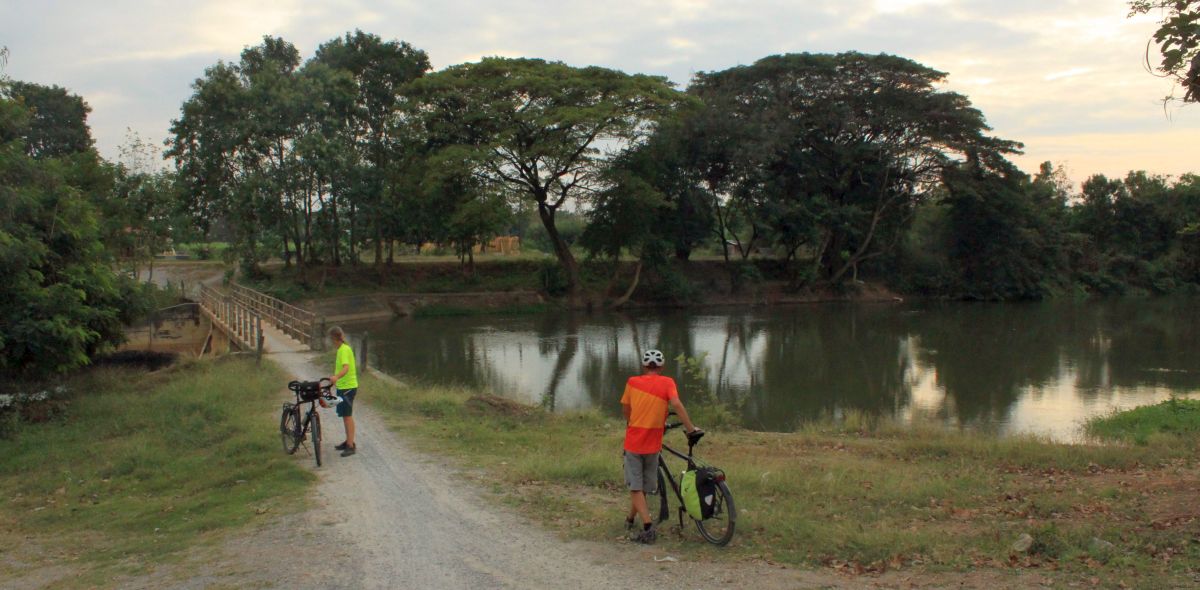 Es war wirklich erstaunlich wie schnell man aus Bangkok rauskommt. Eine Brücke hier, eine Kreuzung da und Schwupps ist man an einem ruhigen Kanal der einen schnurrgerade Richtung Westen führt.