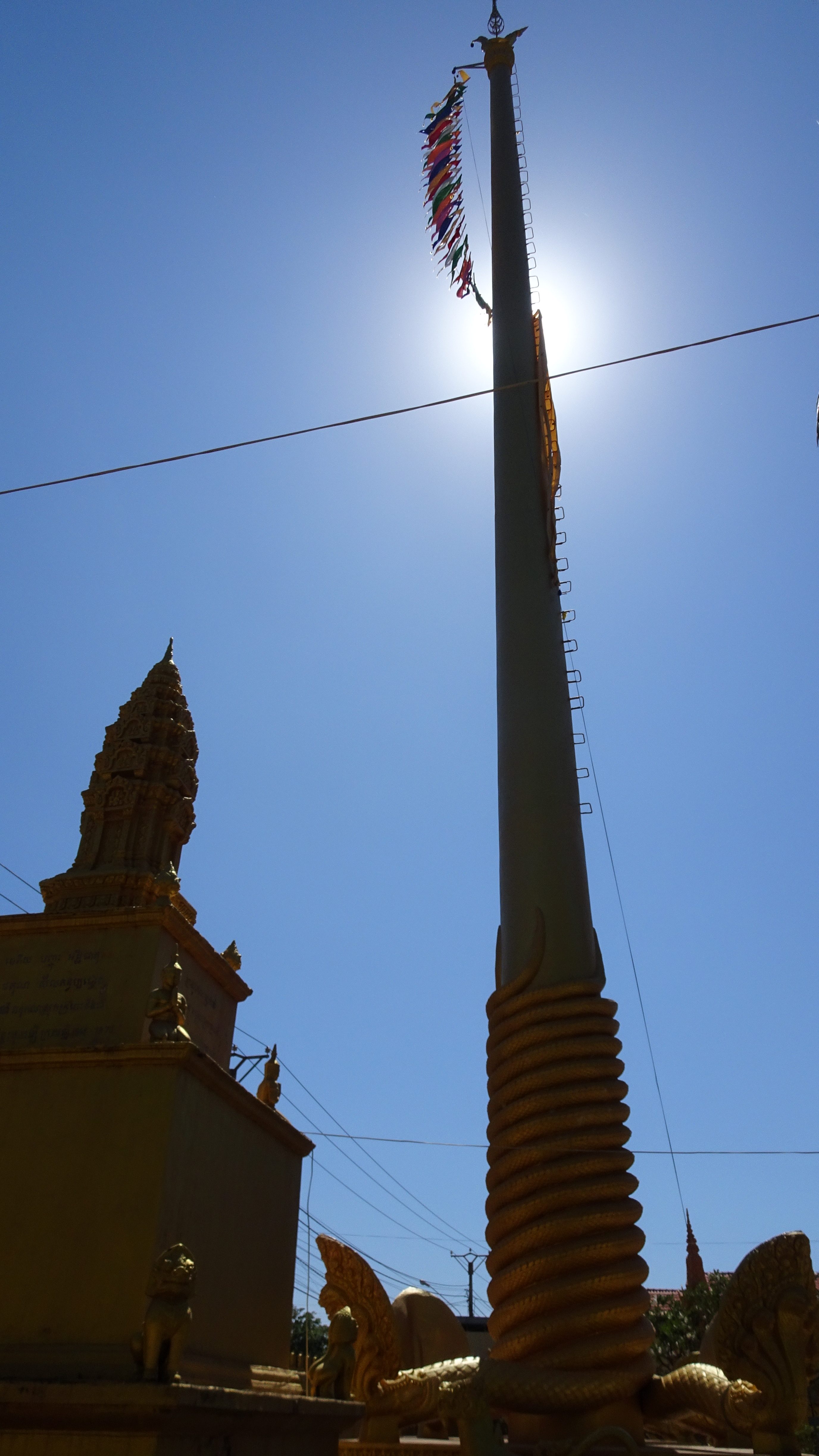 Auf dem Rückweg stoppen wir kurz an einer Pagode kurz vor der Stadt. Pagoden sind nicht immer geöffnet, sondern meist nur an besonderen Feiertagen. Schade, aber von außen ist sie auch sehenswert und da im Obergeschoß die Fenster geöffnet sind, bekommen die Fotoobjektive auch einen kleinen Einblick ins farbenfrohe innere.