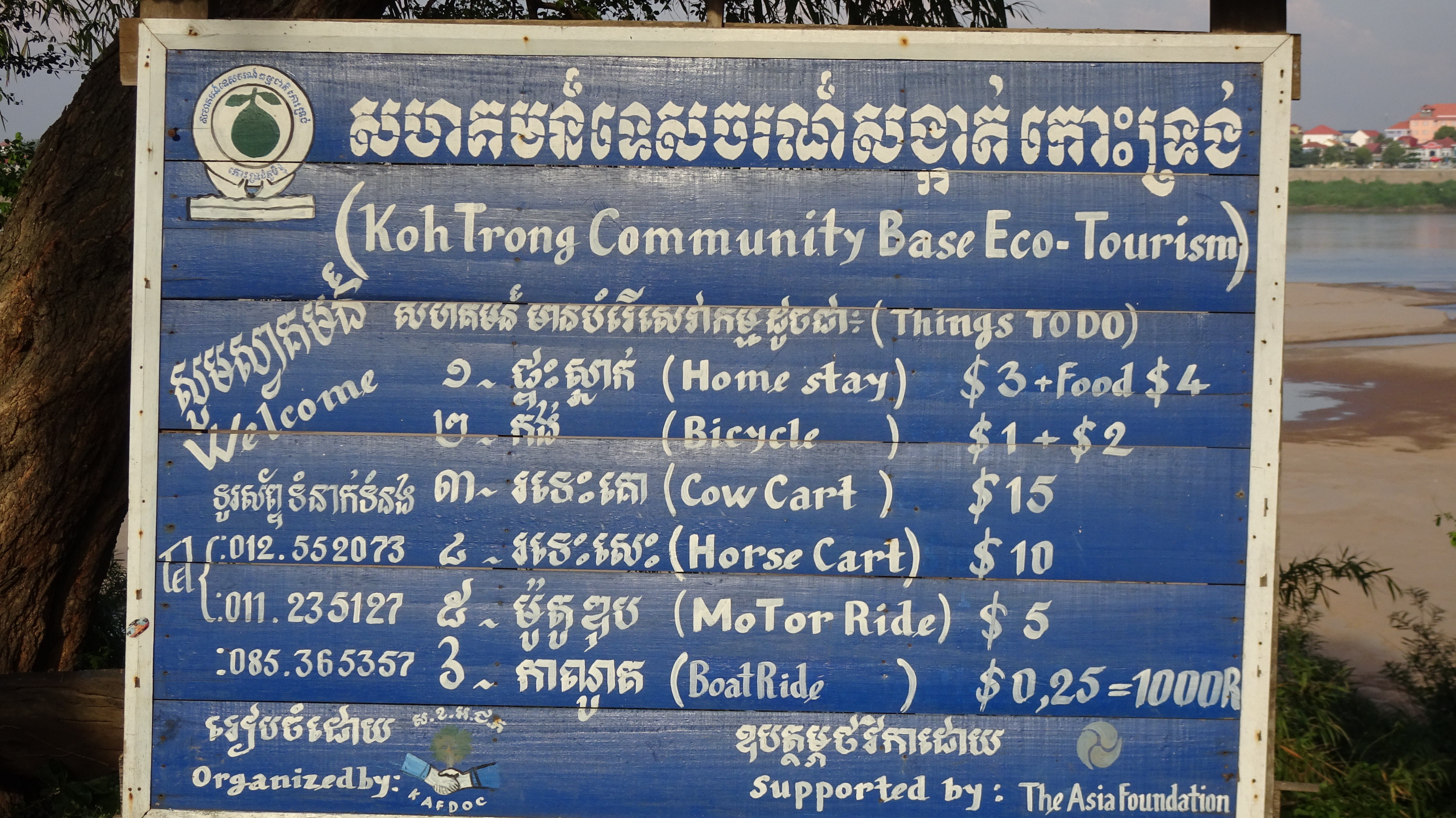 Den Nachmittag bringt jede(r) individuell über die heißeste Tageszeit und ab 15.30 Uhr treffen wir uns wieder zu einer kleinen Radeltour zum Inselpark „Koh Trong Community Base Eco-Tourism“ gegenüber. Die Fähre muß nicht ganz so weit schwimmen, denn im Mekong fließt relativ wenig Wasser. Wir müssen unsere Fahrräder ein ganzes Stück über den ausgetrockneten Sand ans eigentliche Ufer schieben.